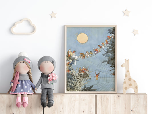 "Spiders web in moonlight" Retro illustration för barnrummet av William Heath Robinson.