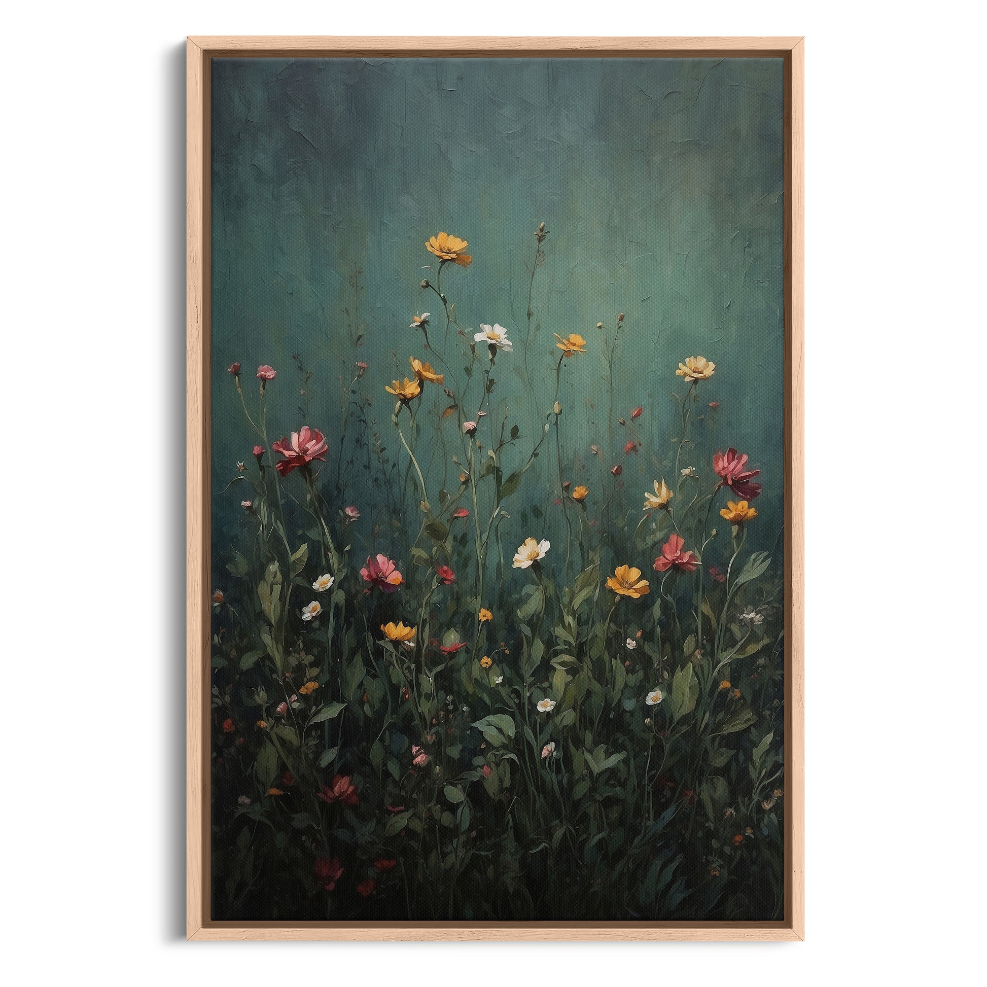 Exklusiv inramad canvastavla i stort format. Vildblommor på grön bakgrund.