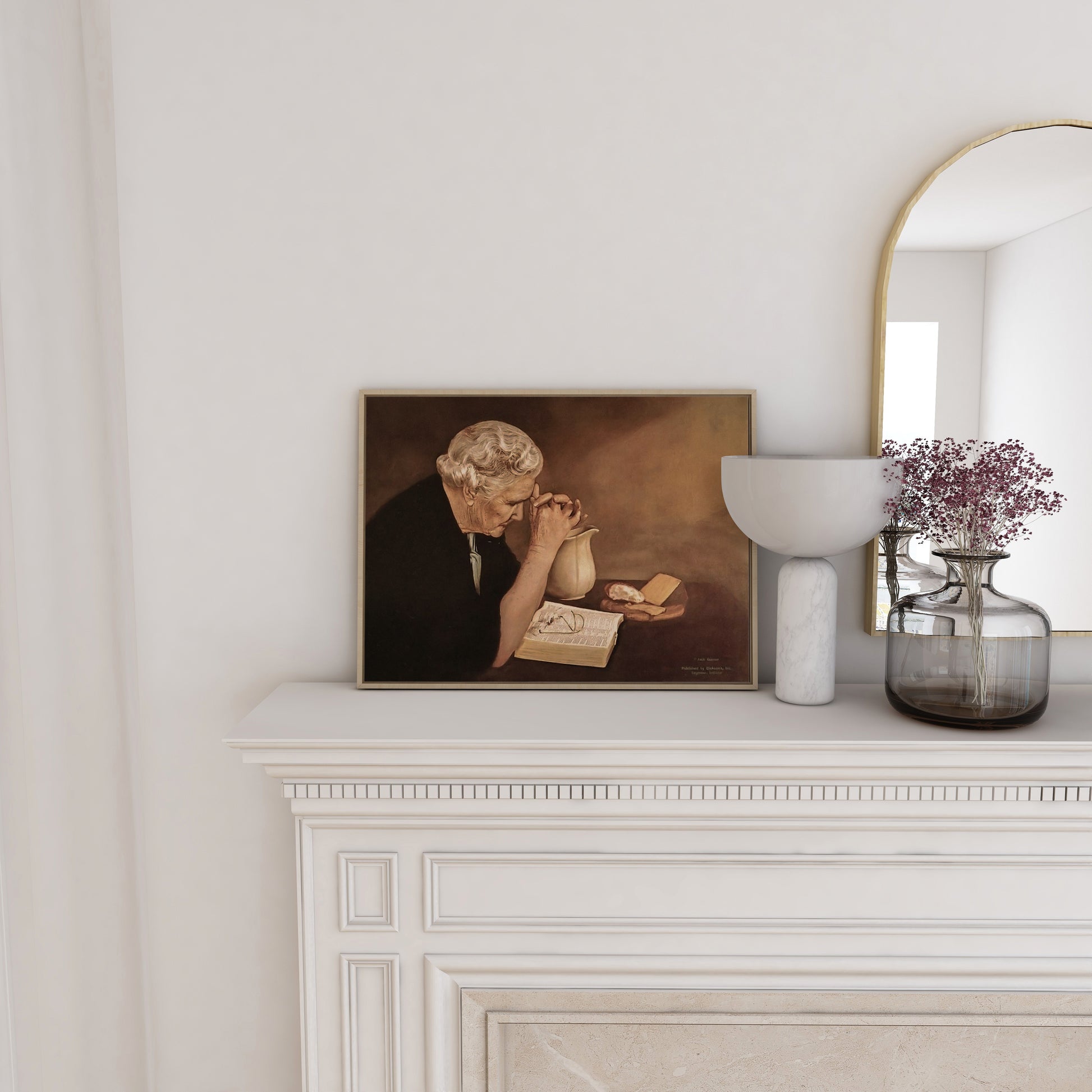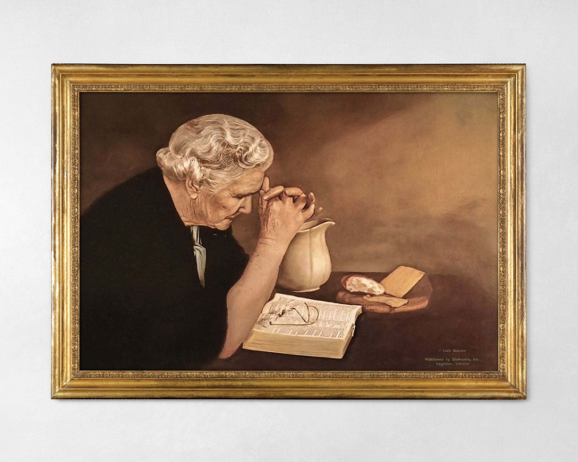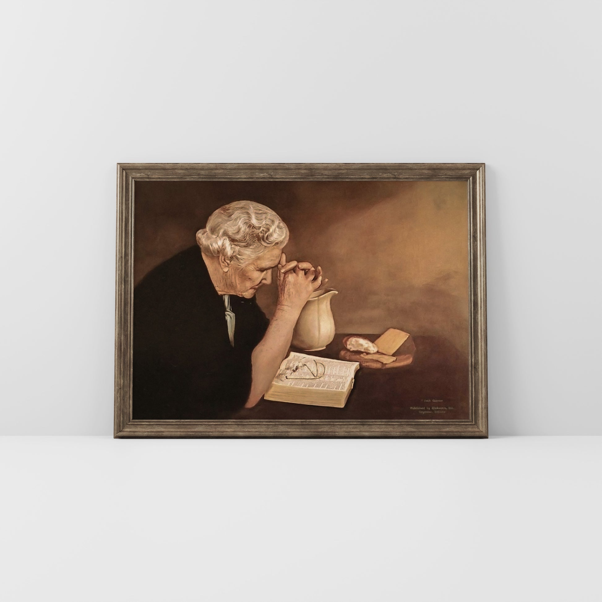Kristen konst. Gammal kvinna som ber över maten.