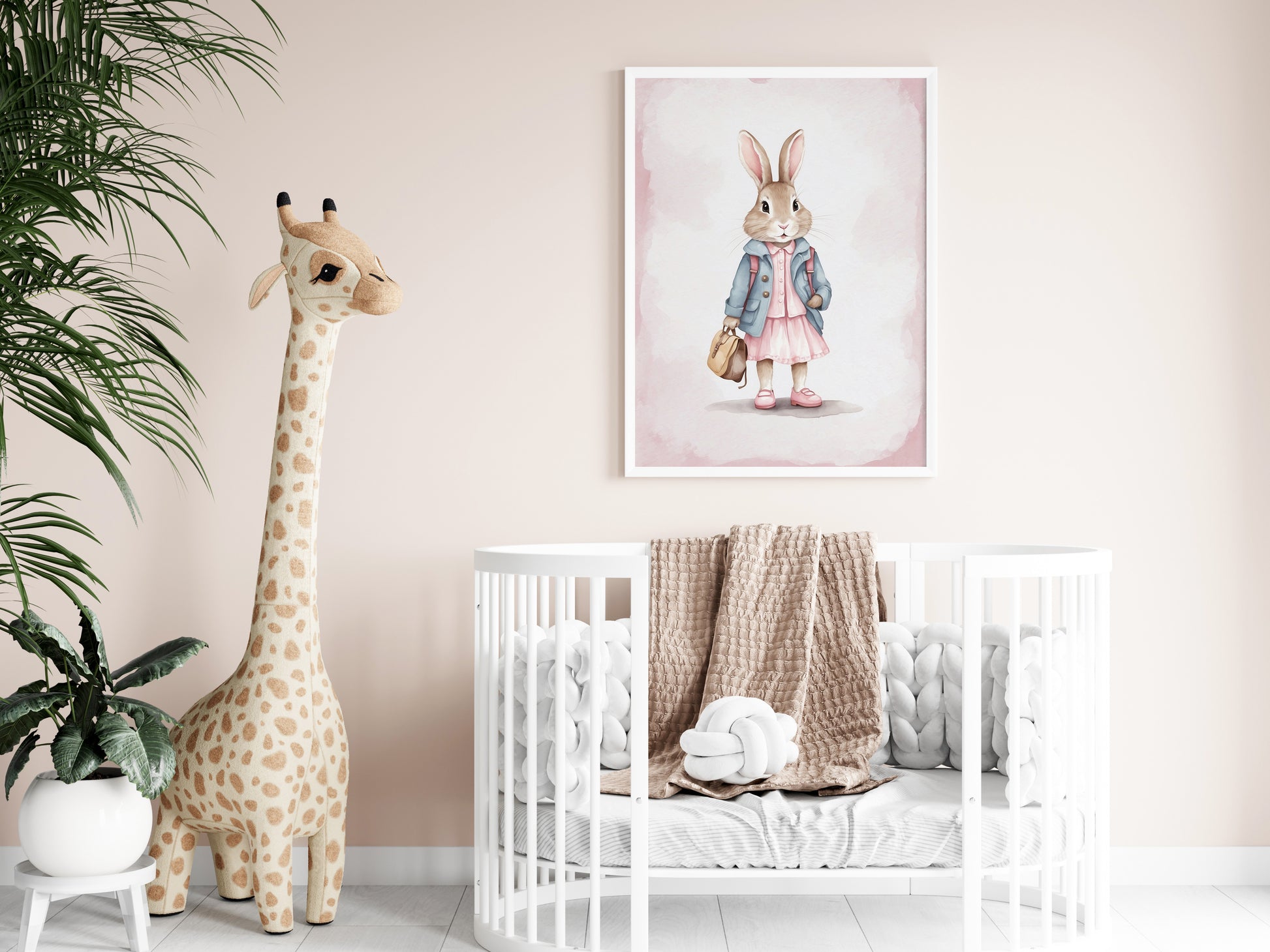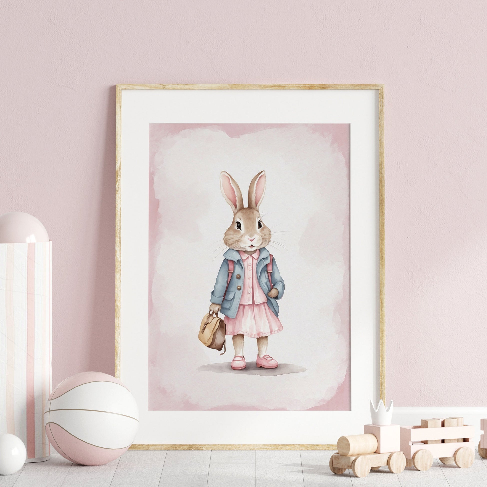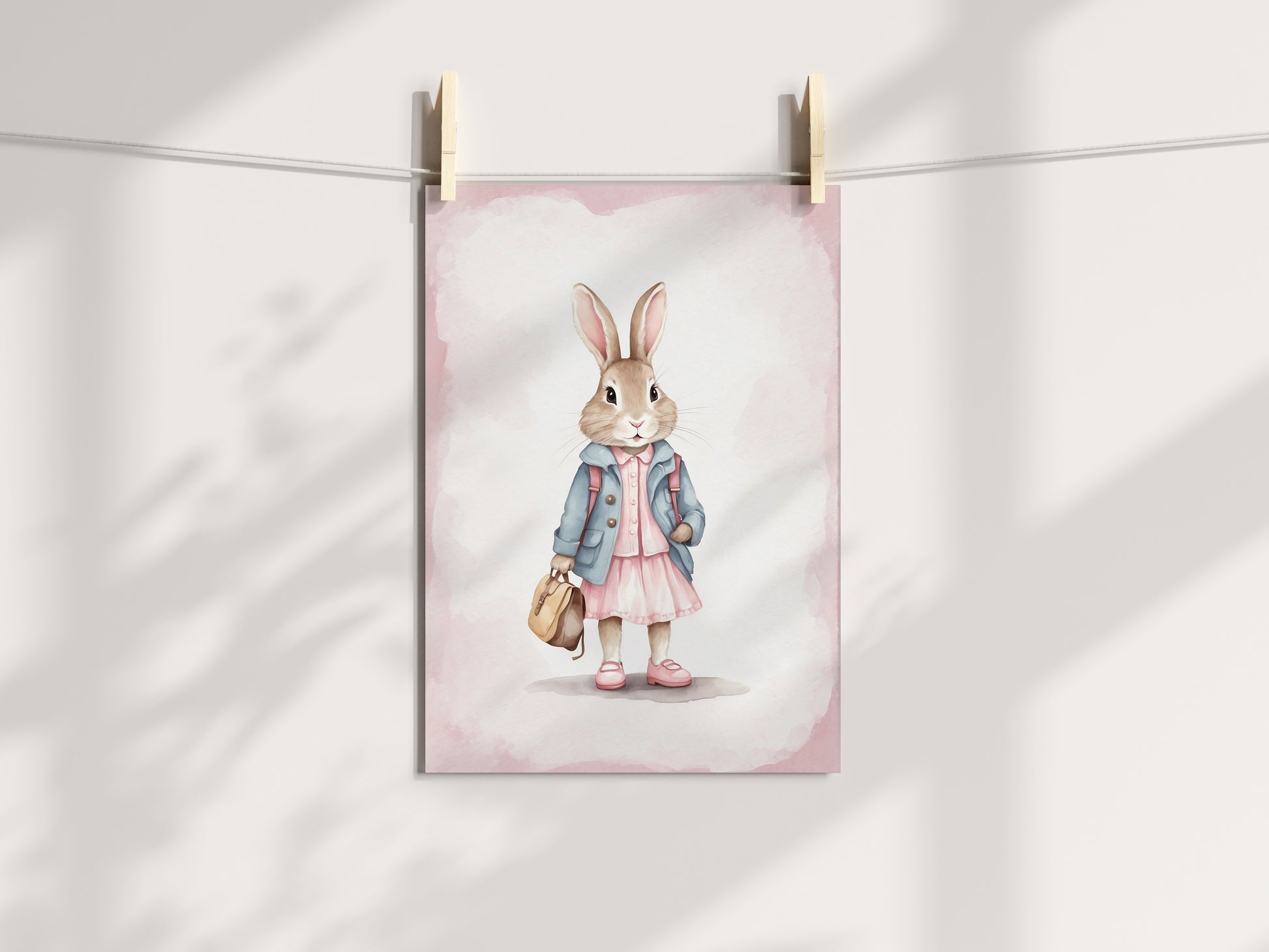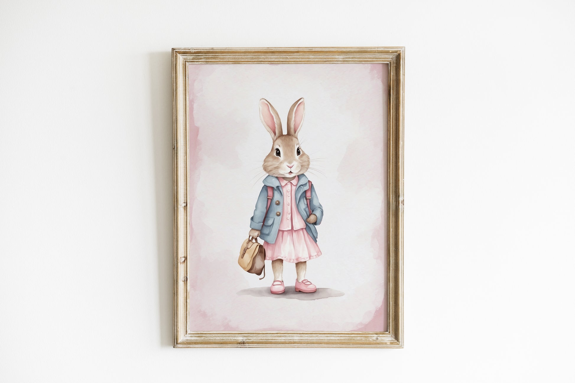 Vintage illustration för barnrummet i rosa ton, kanin med skolväska.