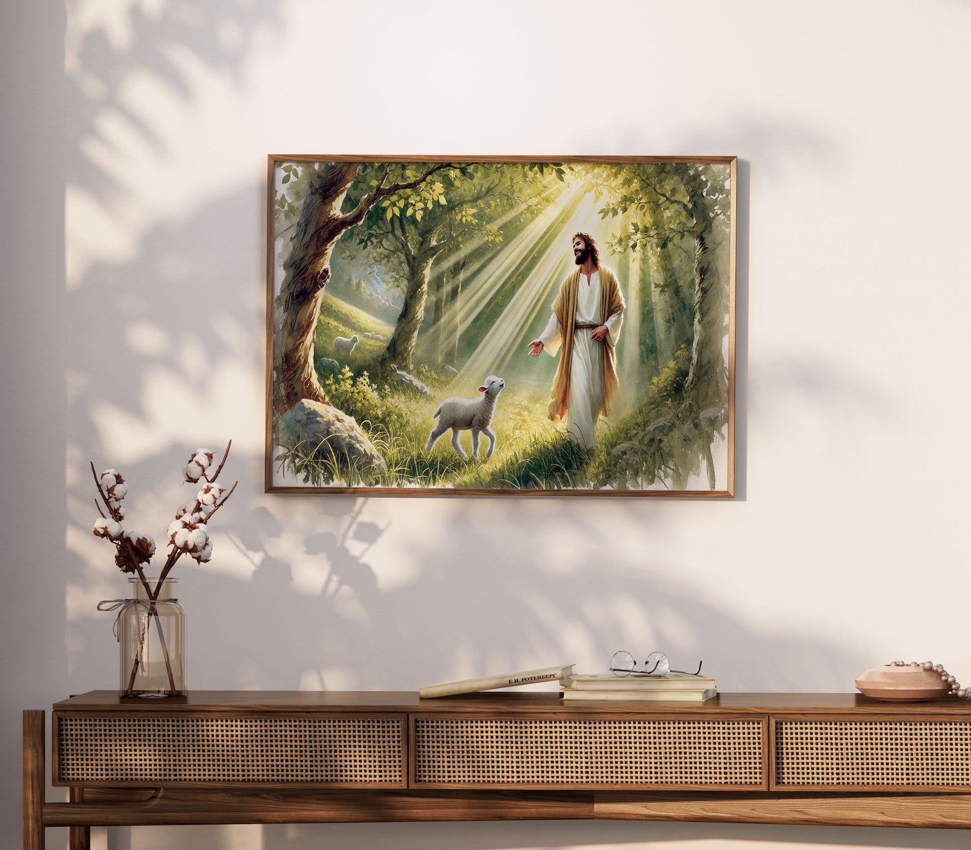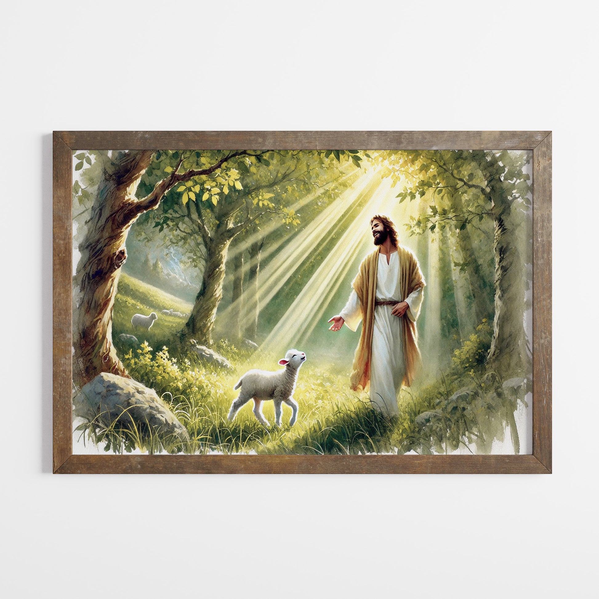 Modern kristen konst, det bortsprungna lammet, målning i vattenfärger.