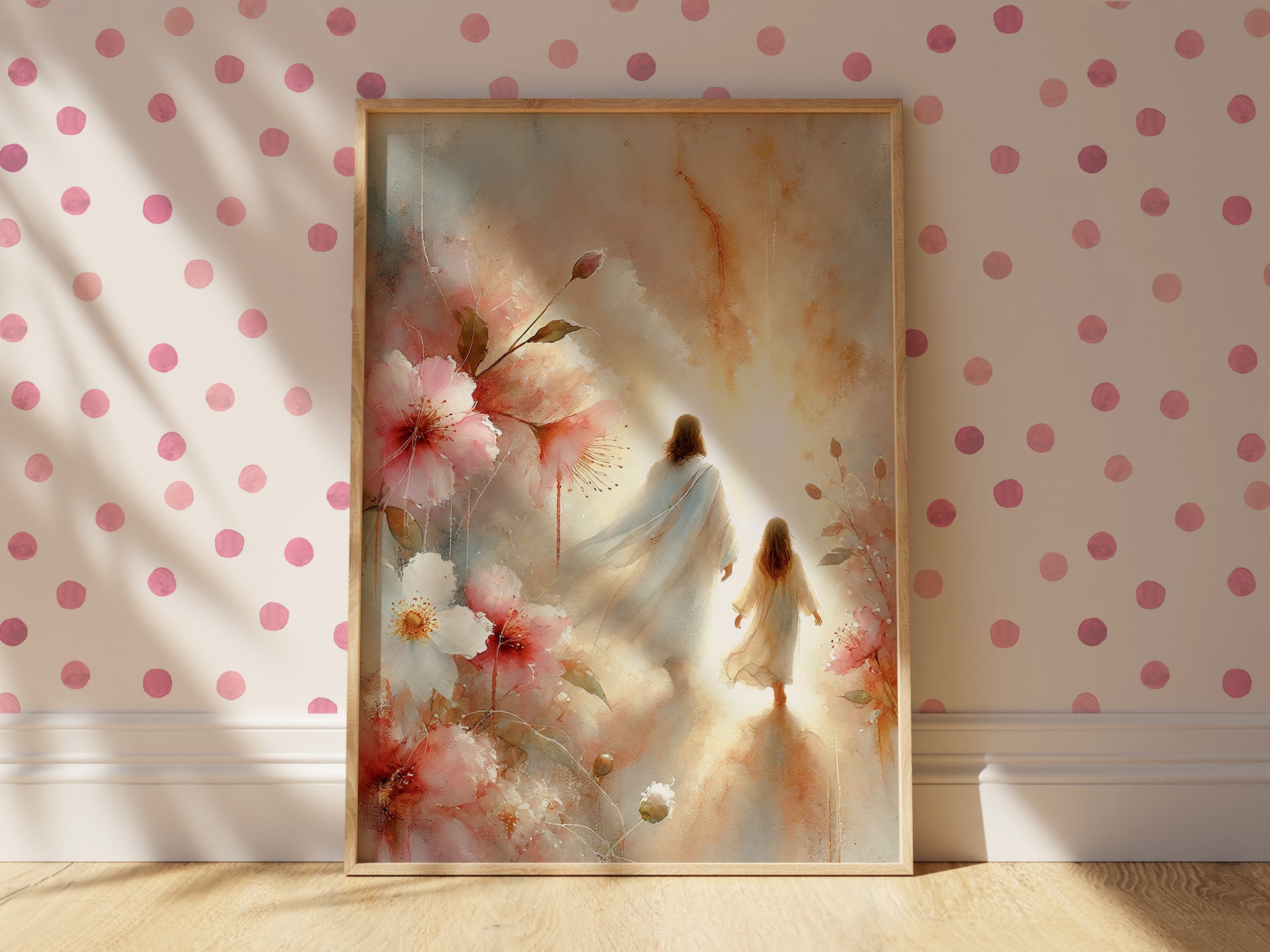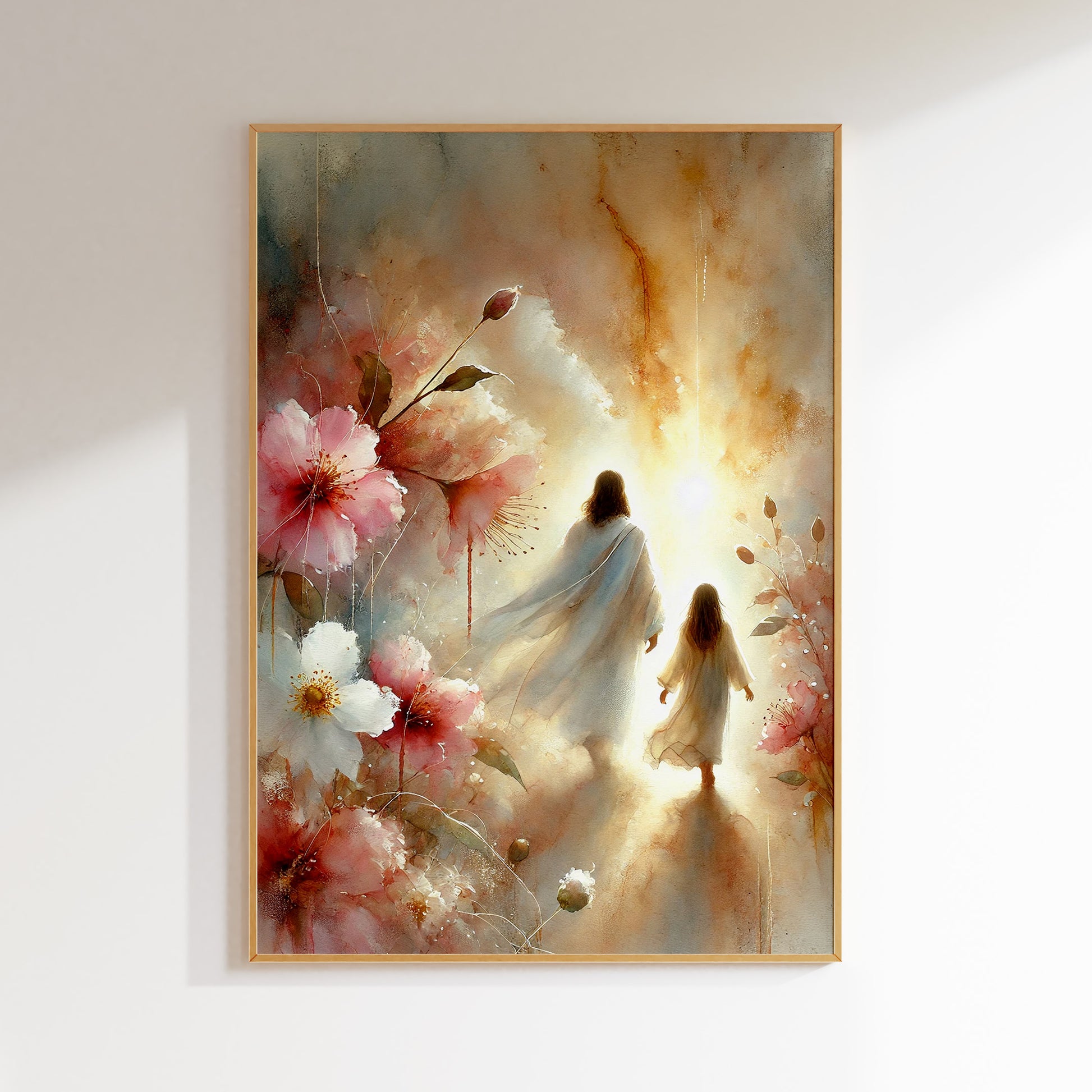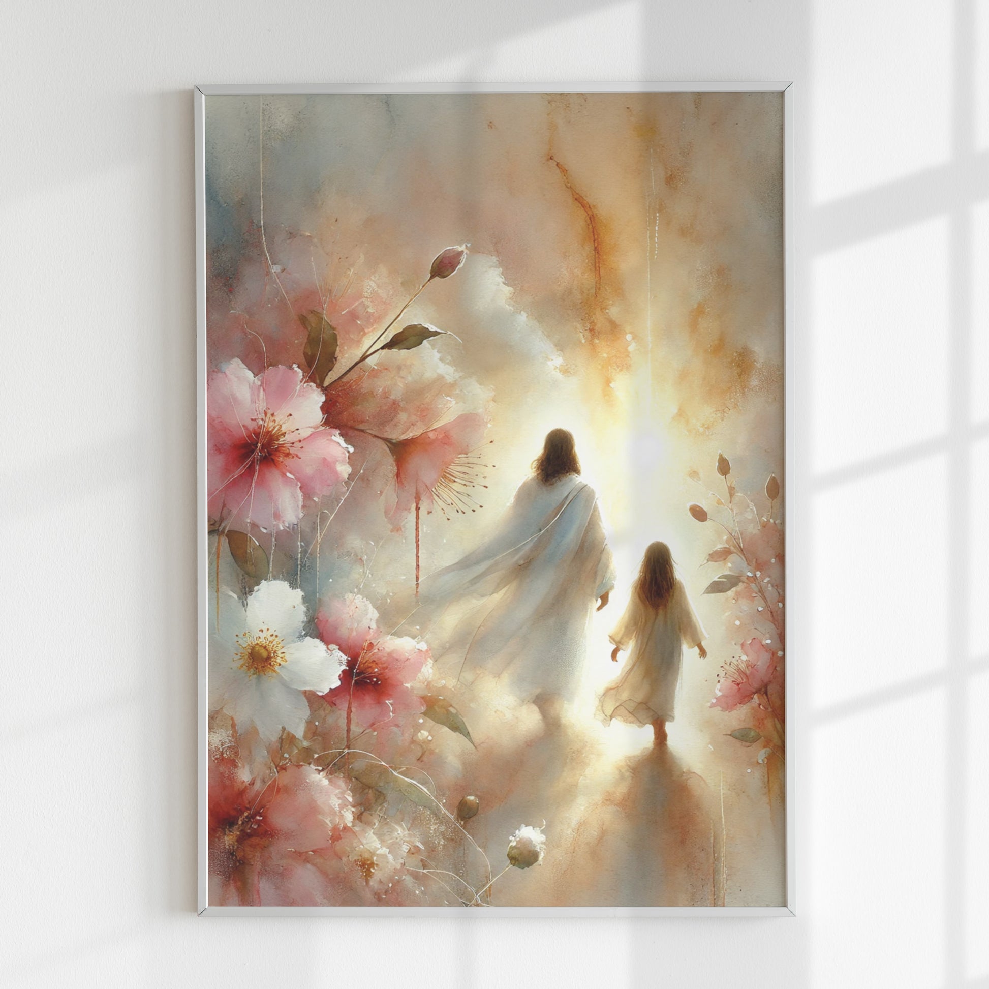 Jesus och flicka går mot ljuset, Kristen Poster.