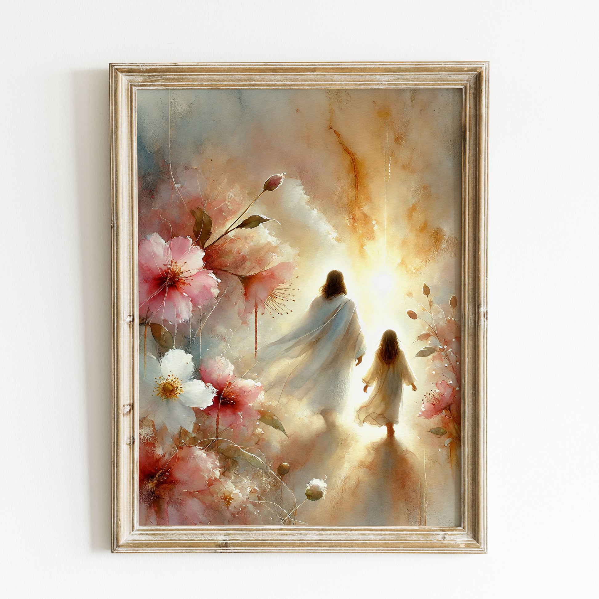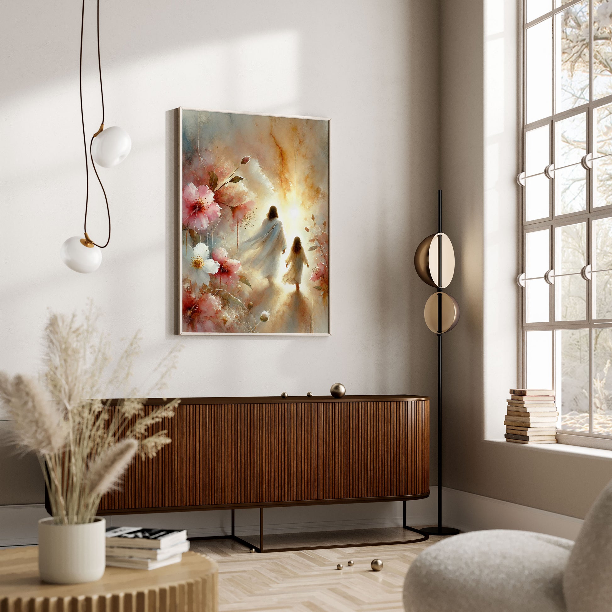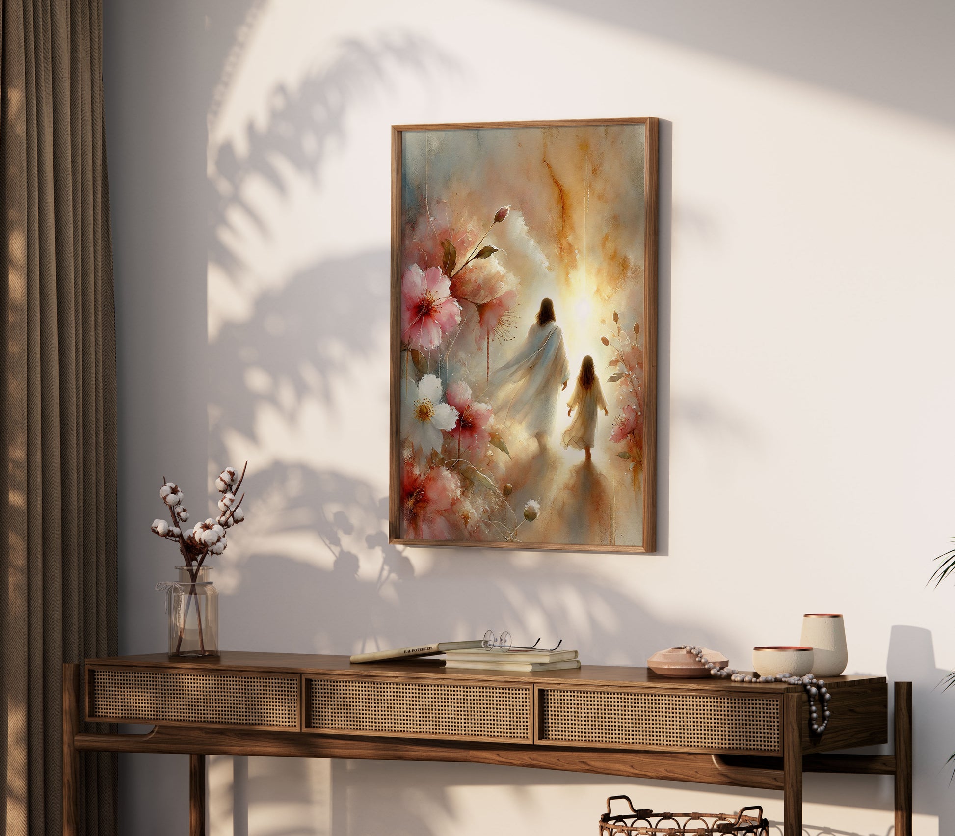 Jesus och flicka går mot ljuset, Kristen Poster.
