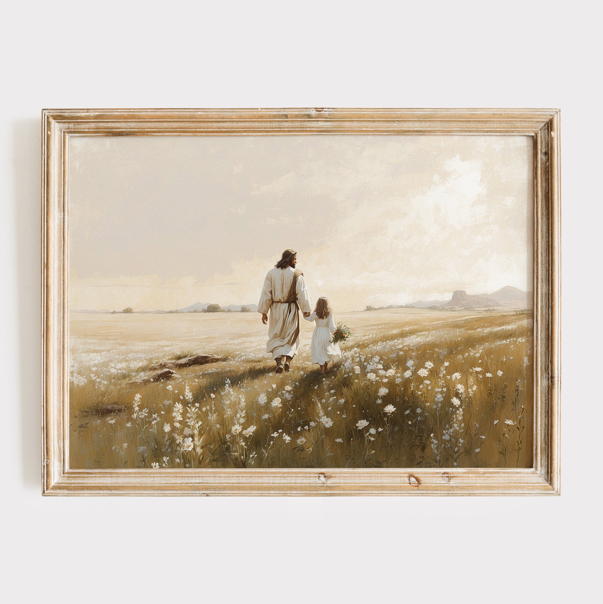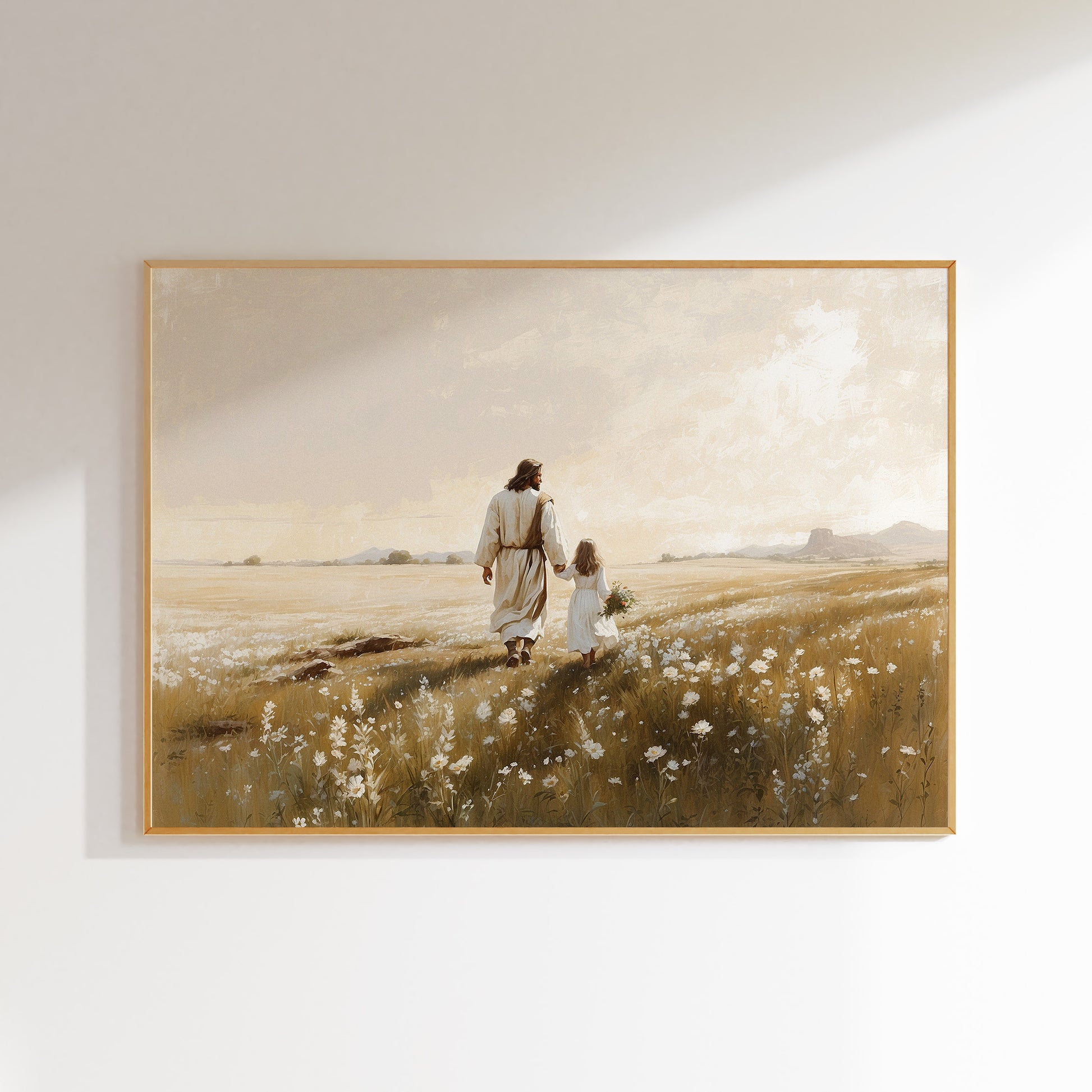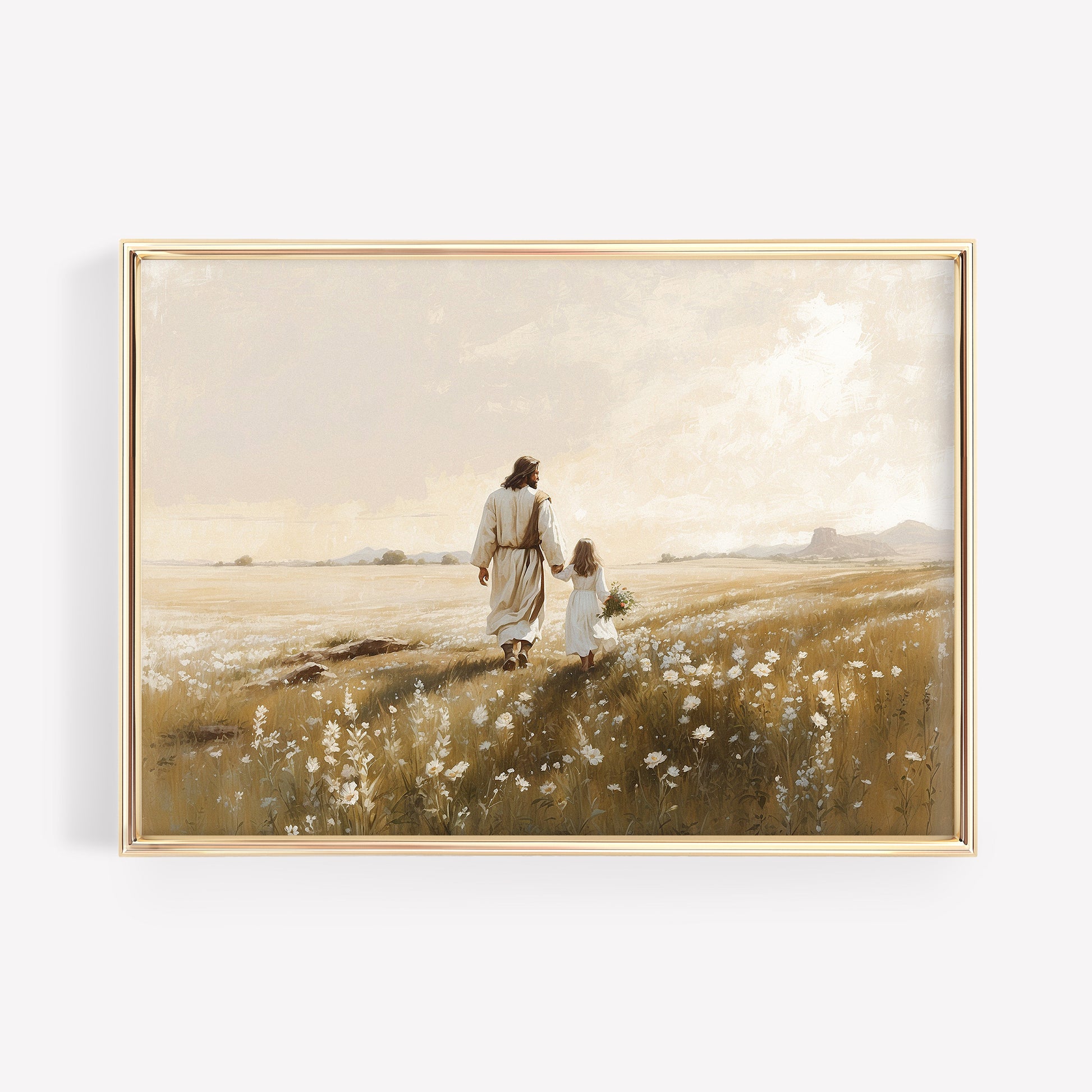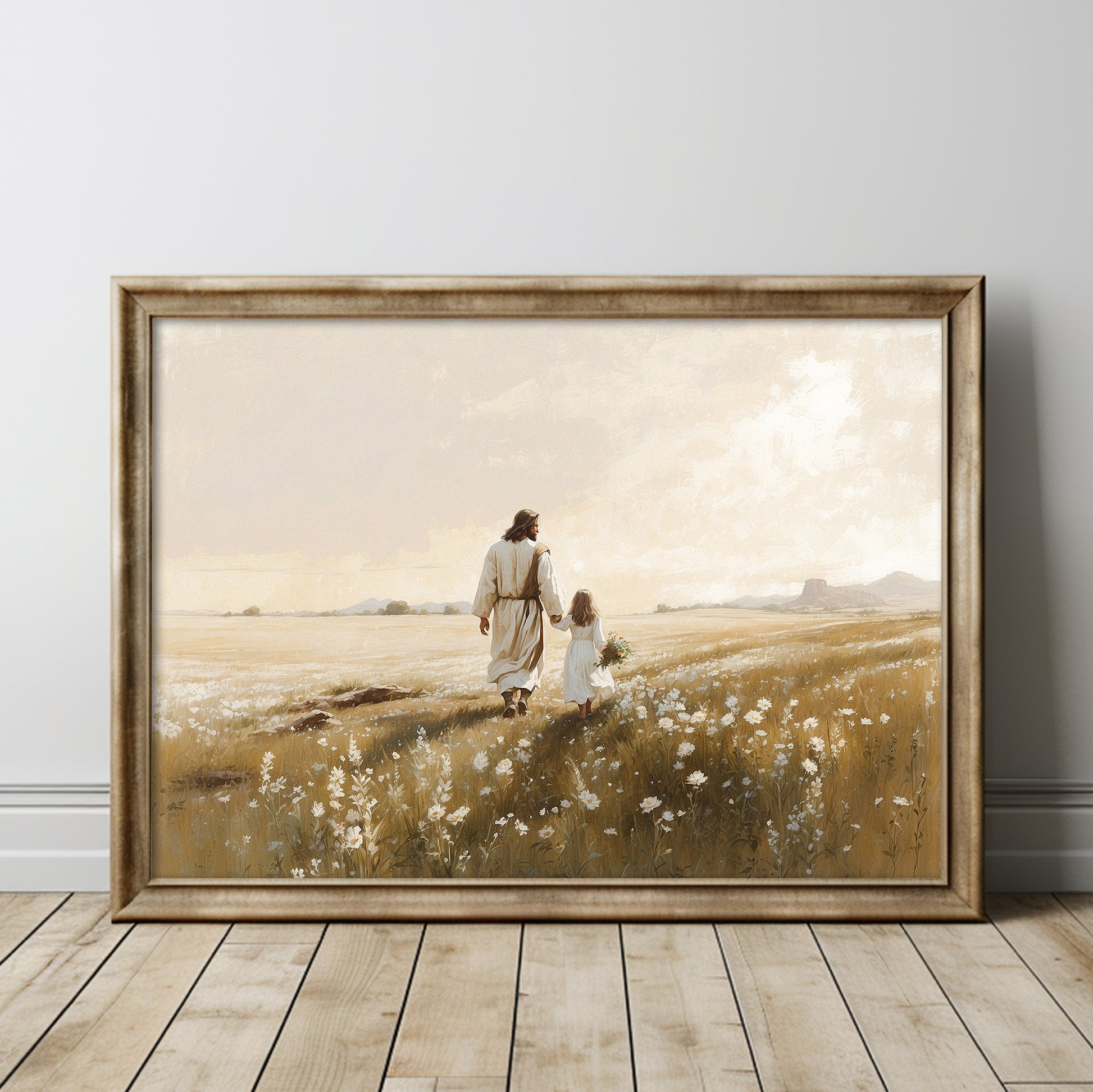 Kristen konst. Jesus vandrar på sommaräng, oljemålning.