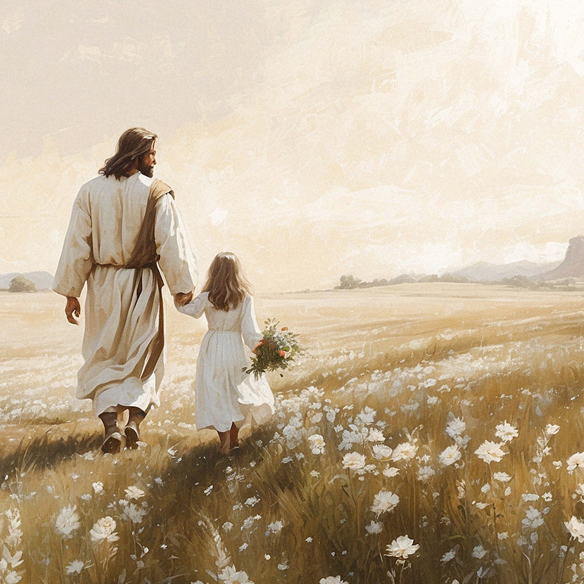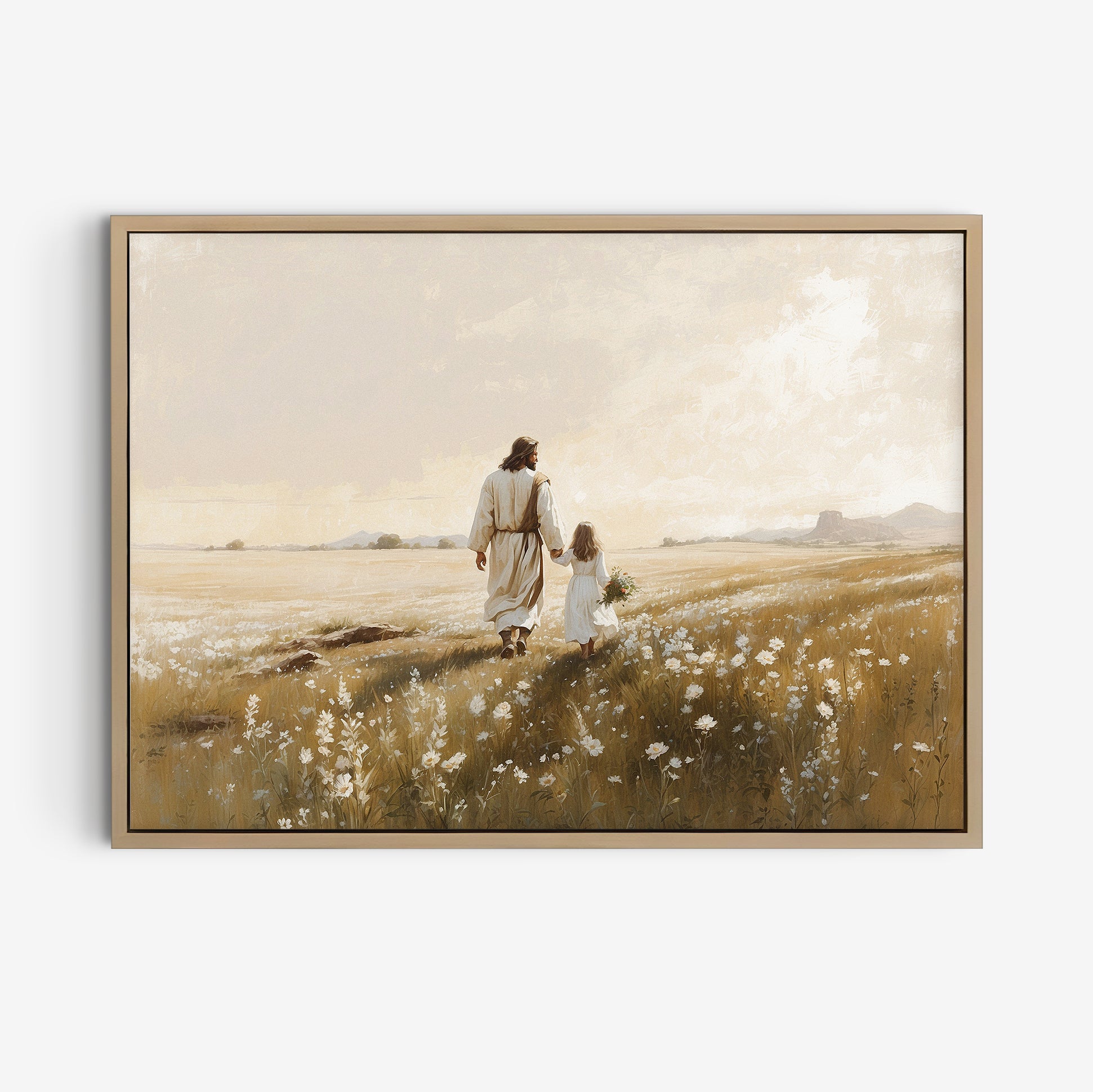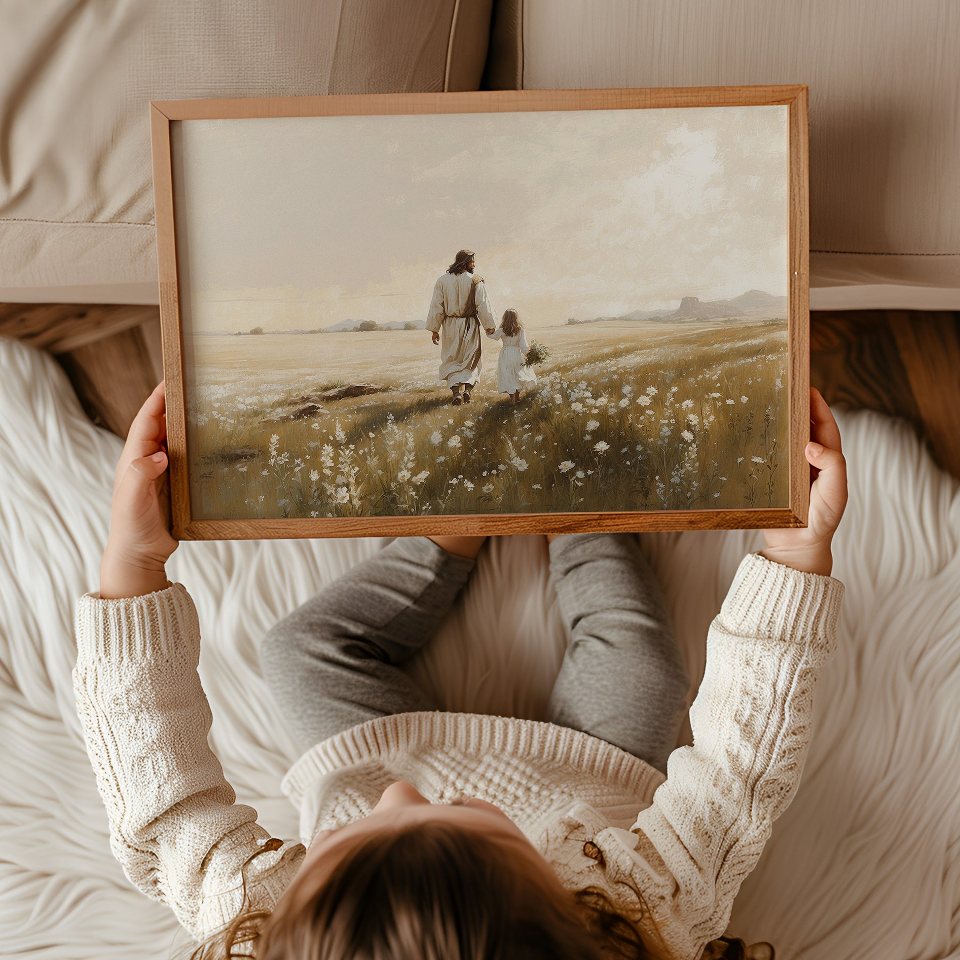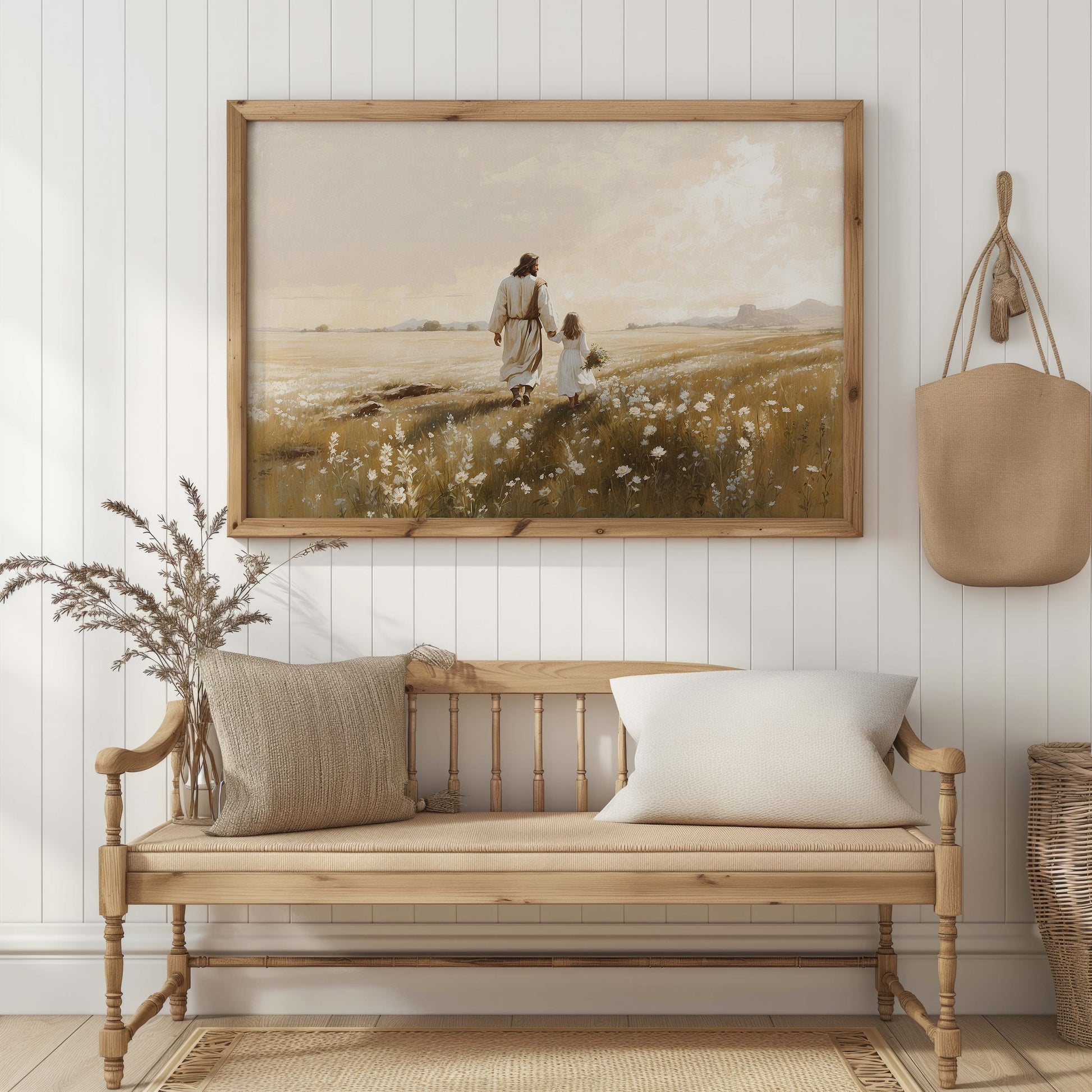 Kristen konst. Jesus vandrar på sommaräng, oljemålning.