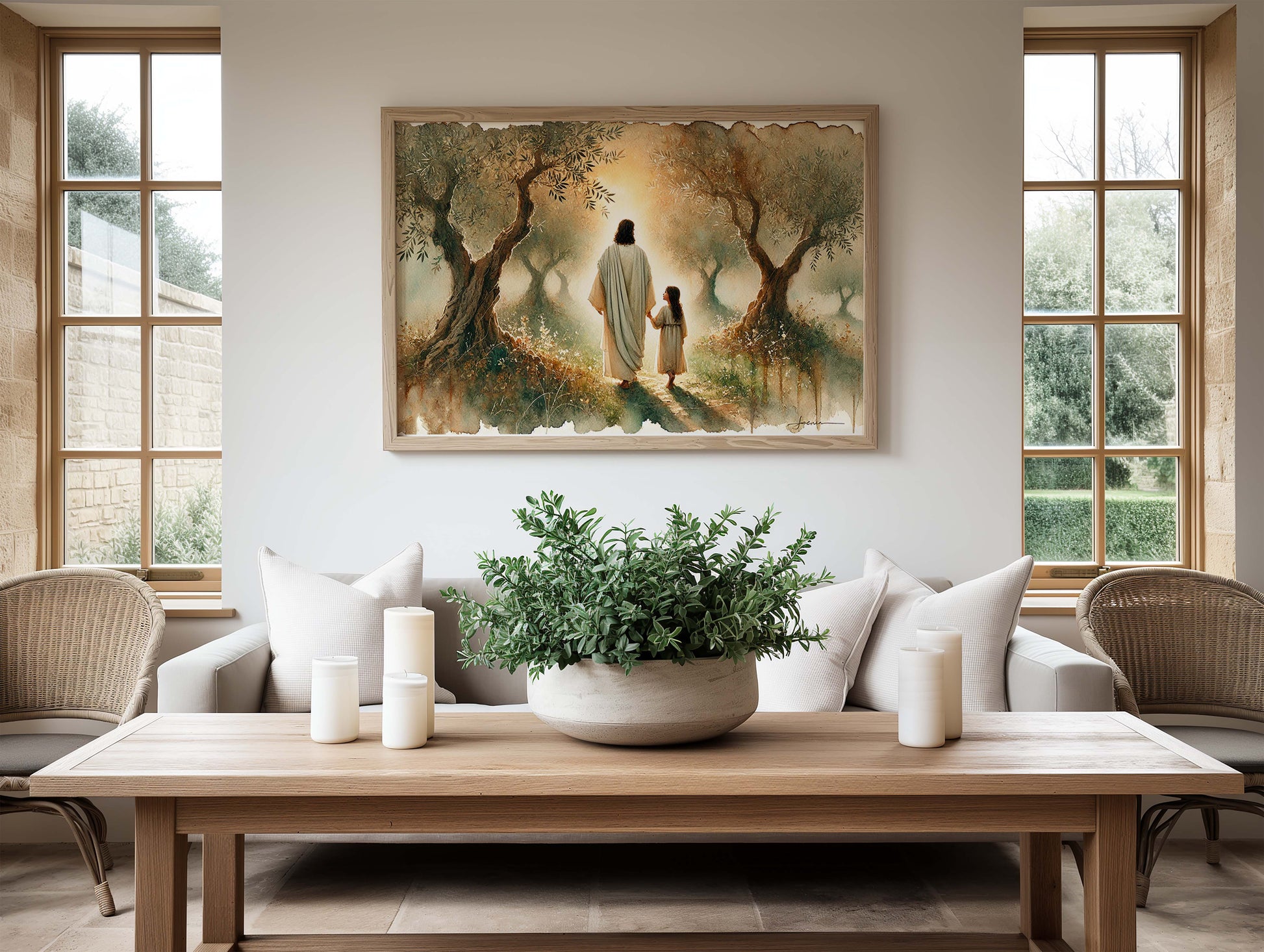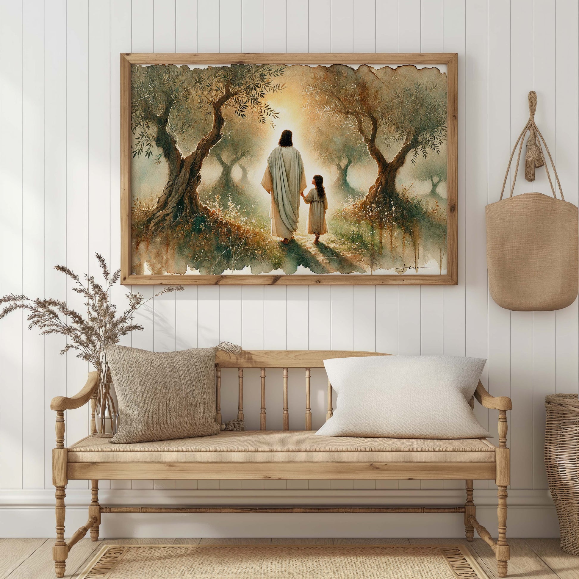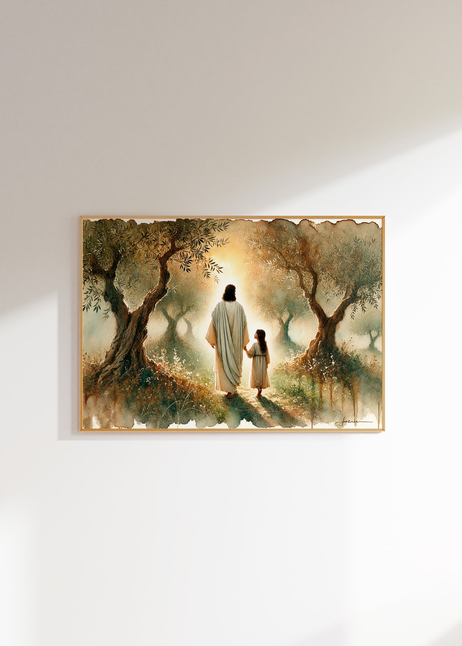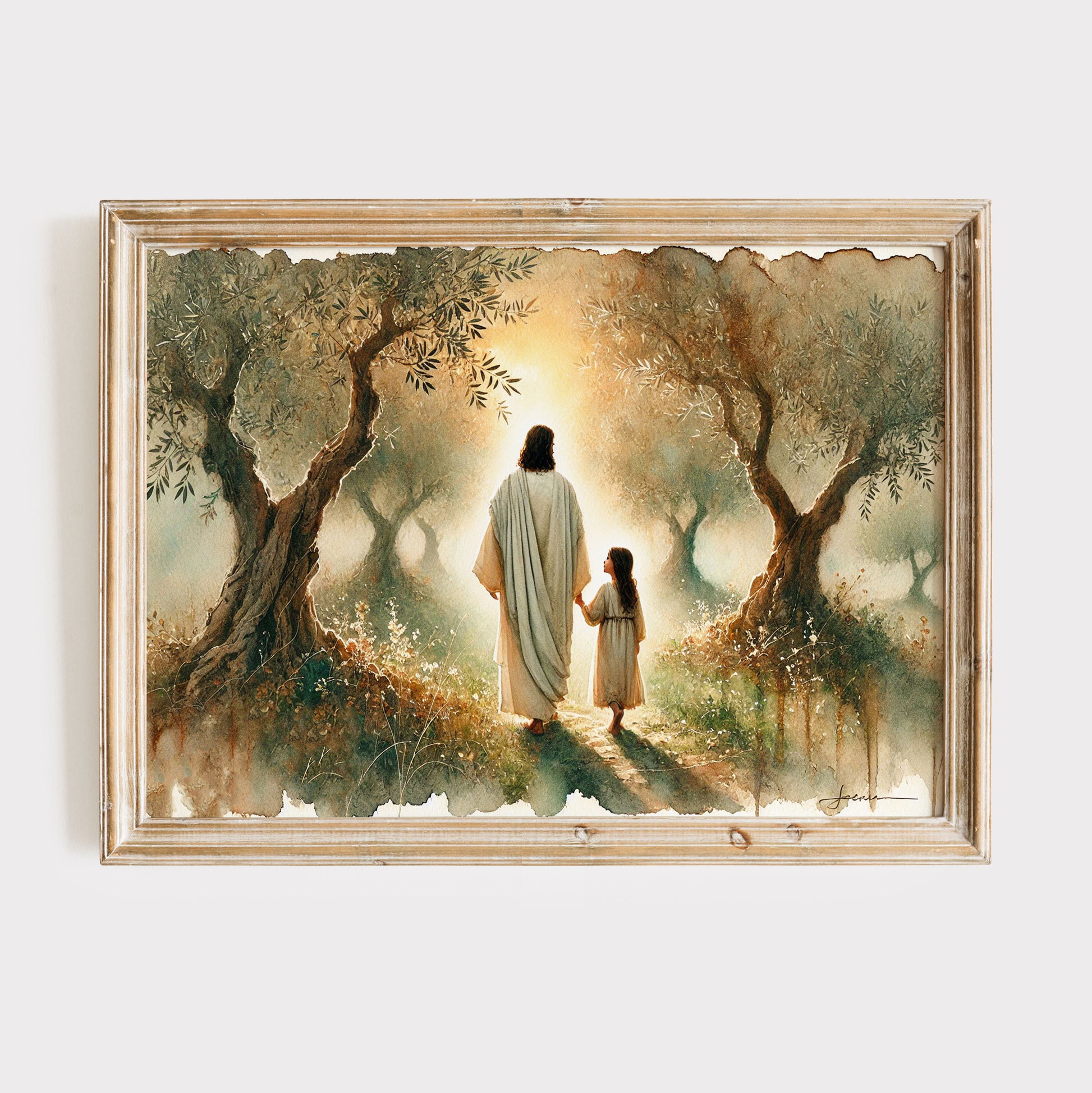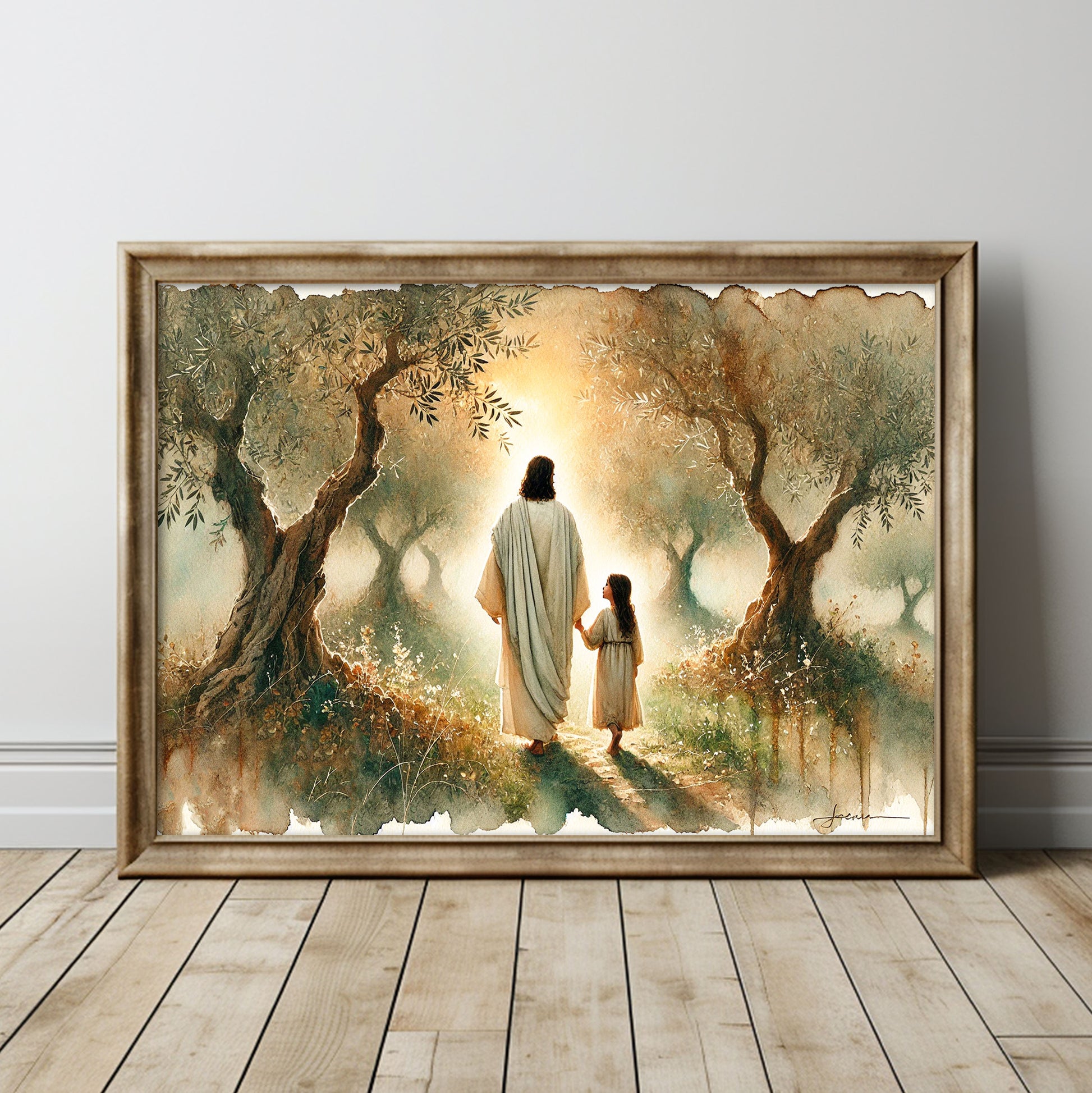 Jesus och flicka vandrar i olivlund, målning i vattenfärger.
