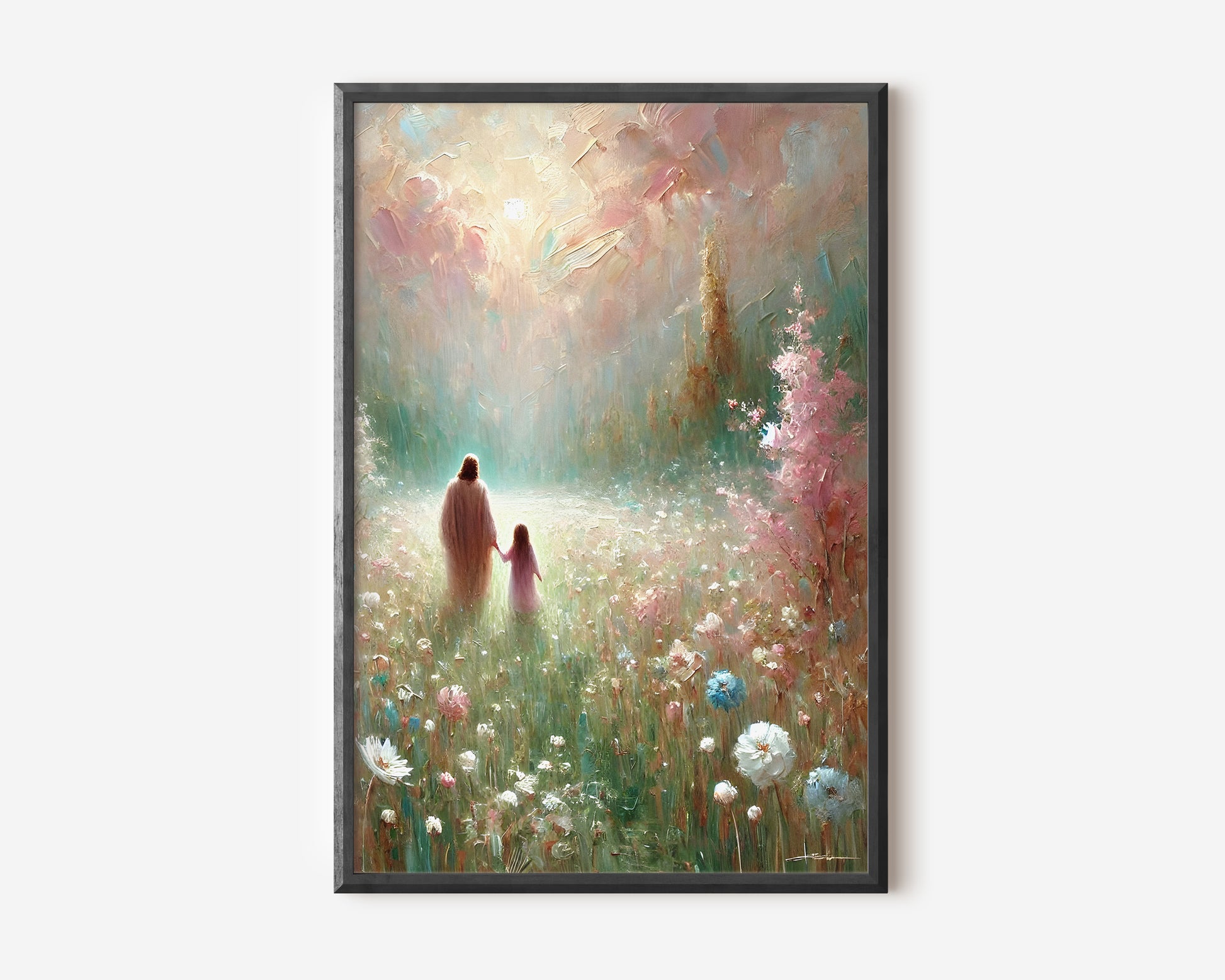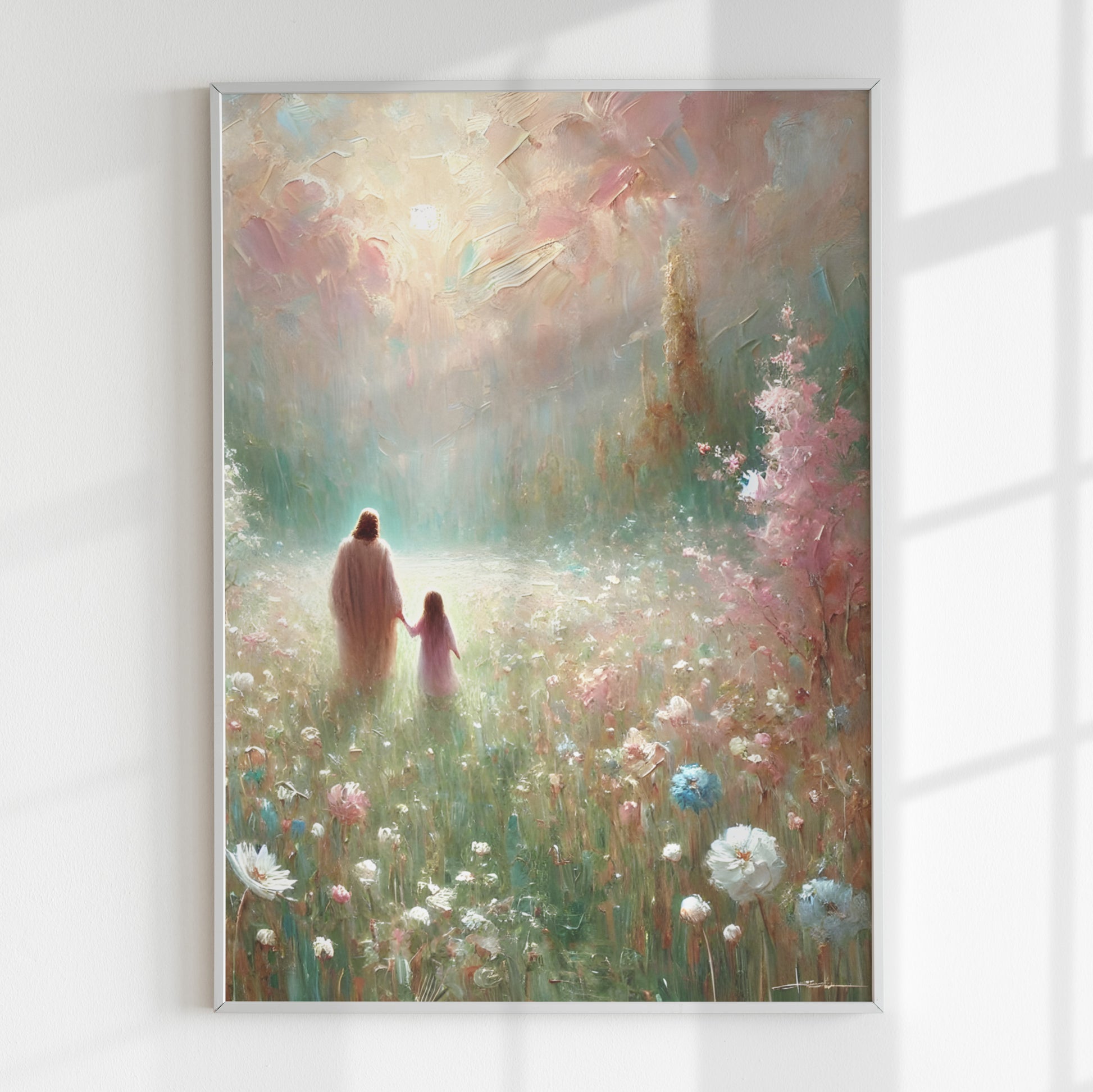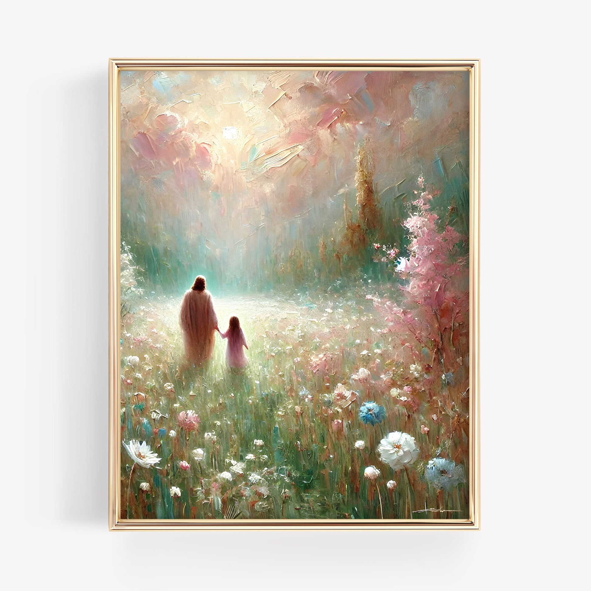 Jesus och flicka vandrar på sommaräng, oljemålning.