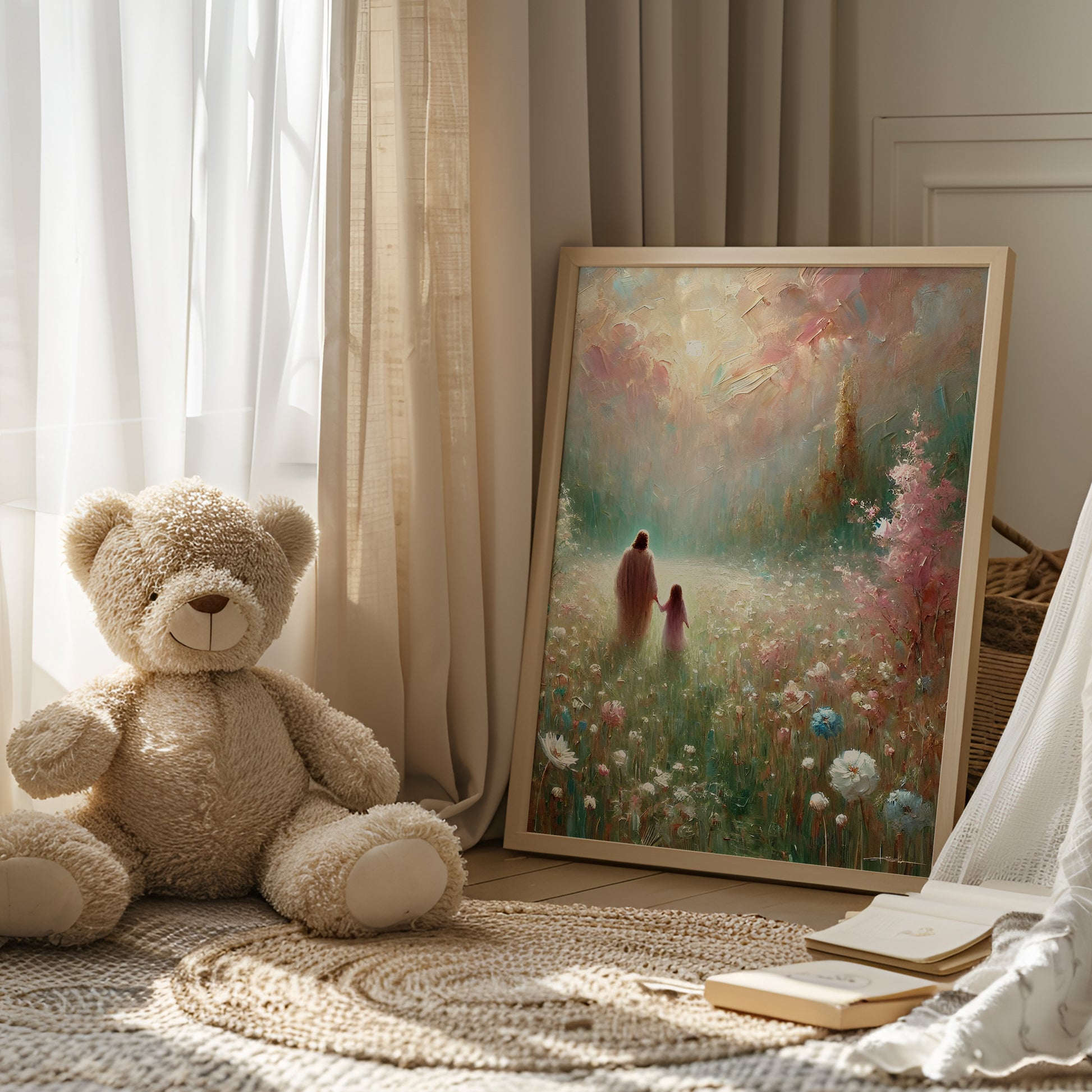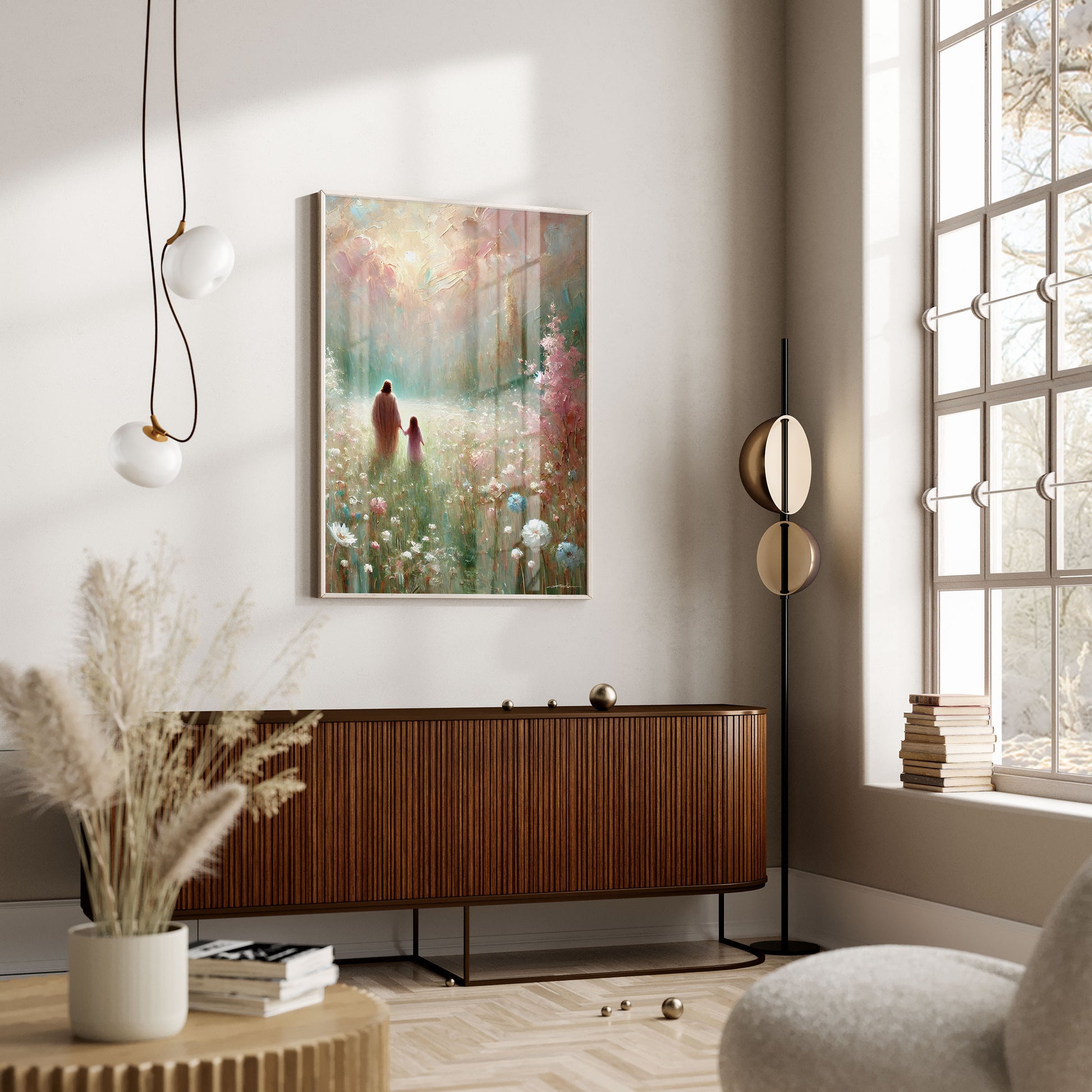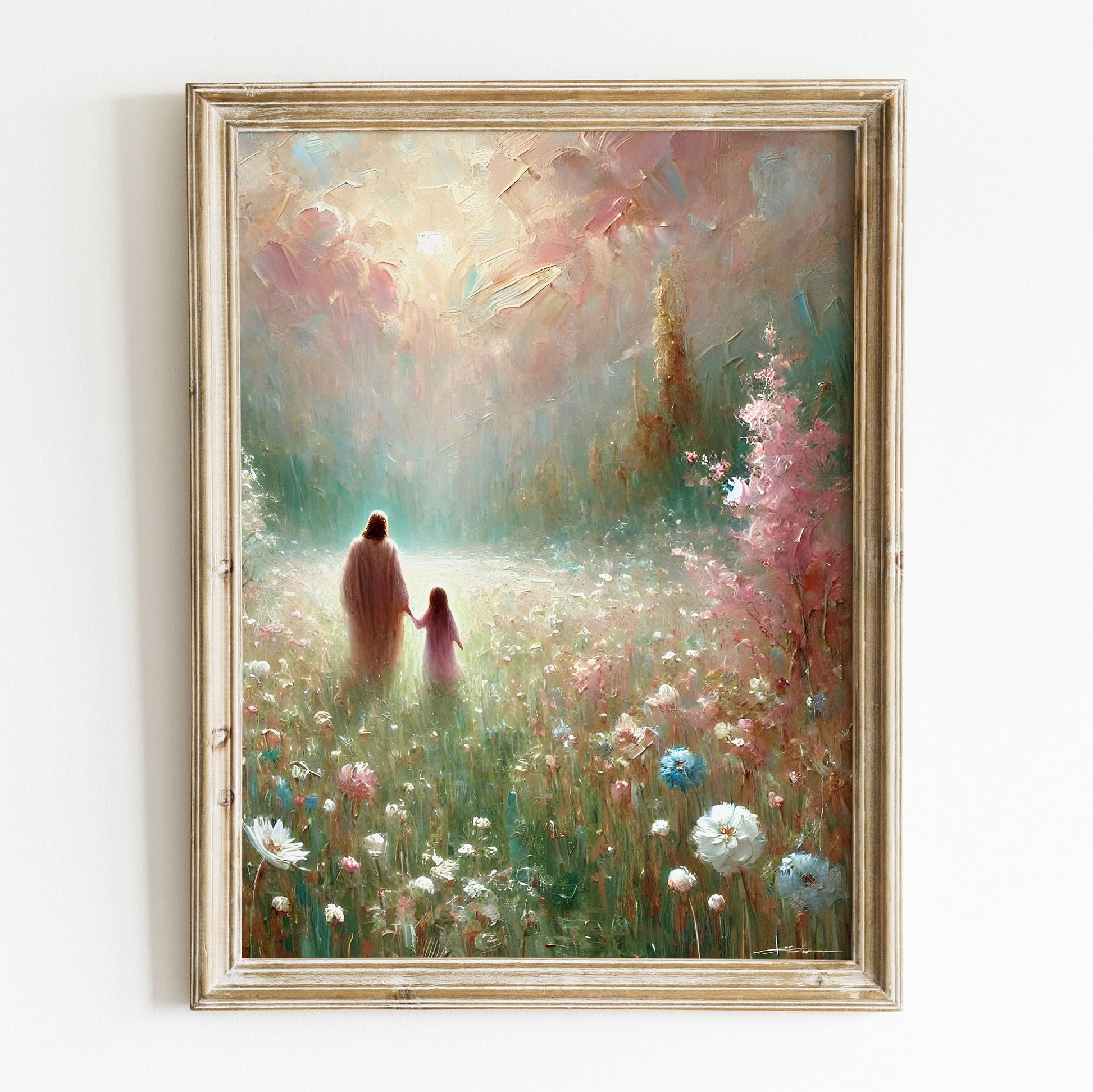 Jesus och flicka vandrar på sommaräng, oljemålning.