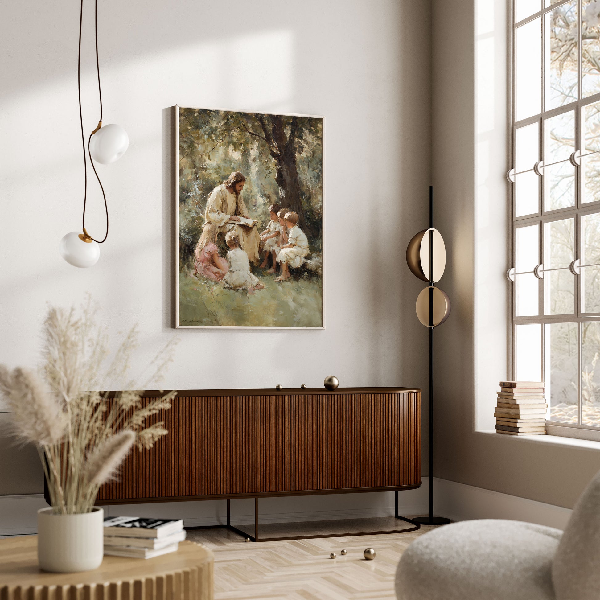 Modern kristen poster. Jesus undervisar barn under träd.