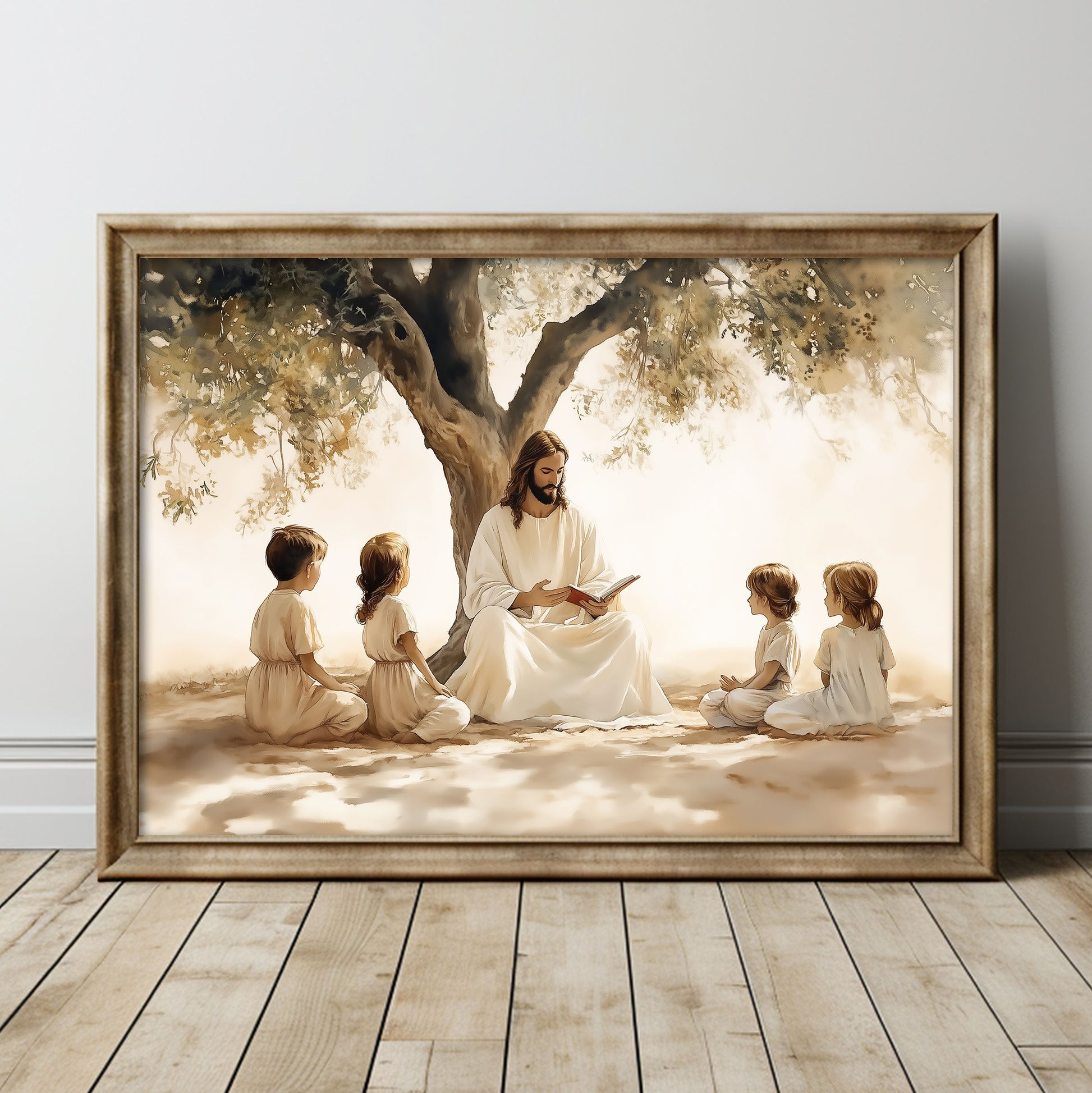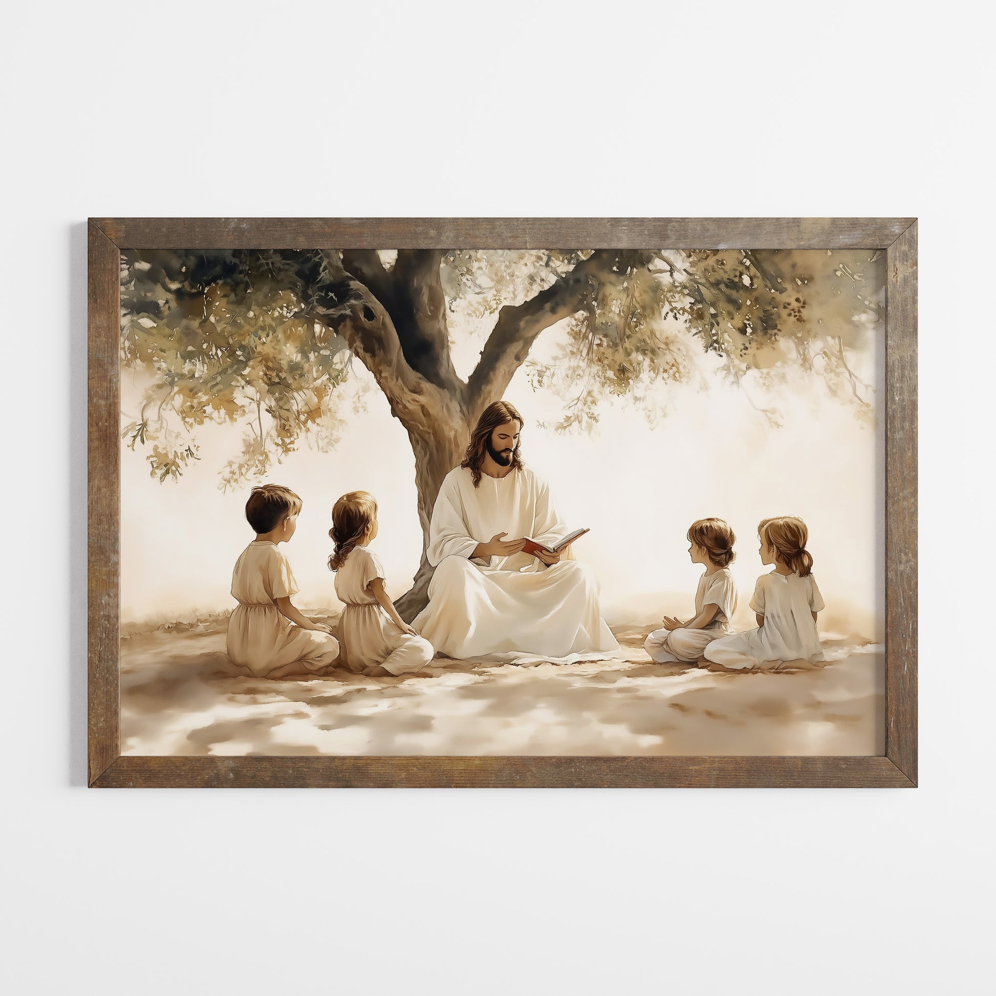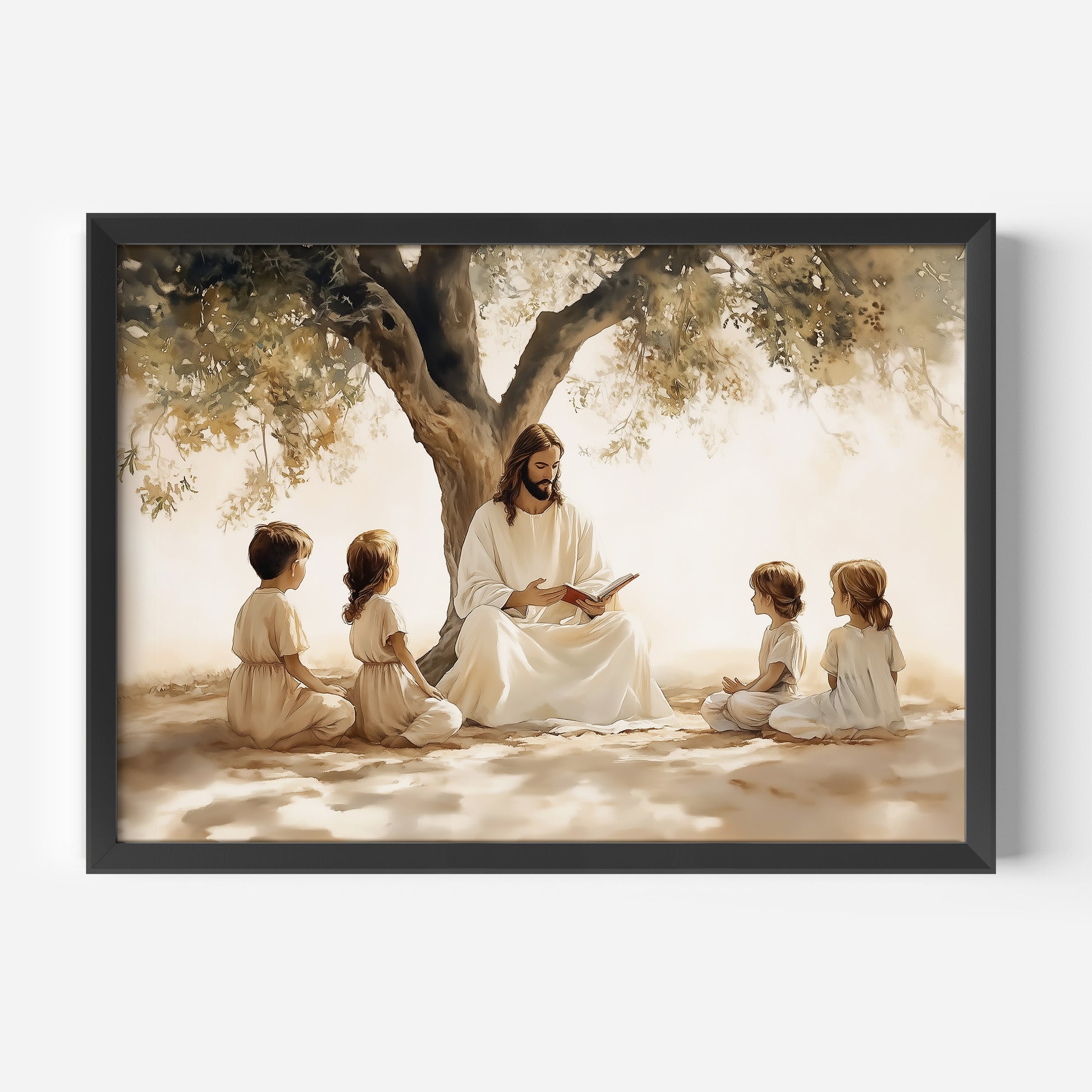 Modern Kristen Poster, Jesus undervisar barn under olivträd.