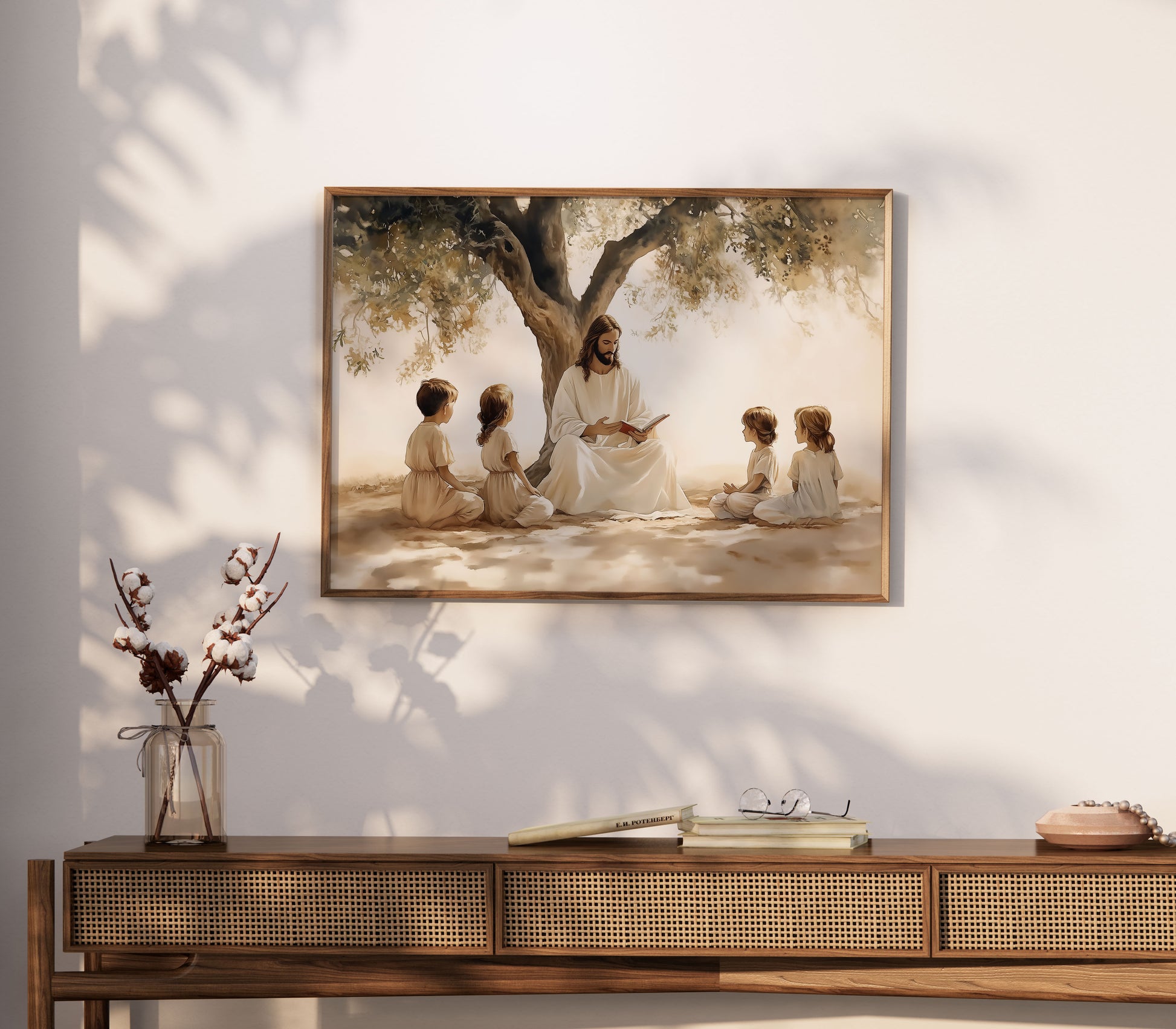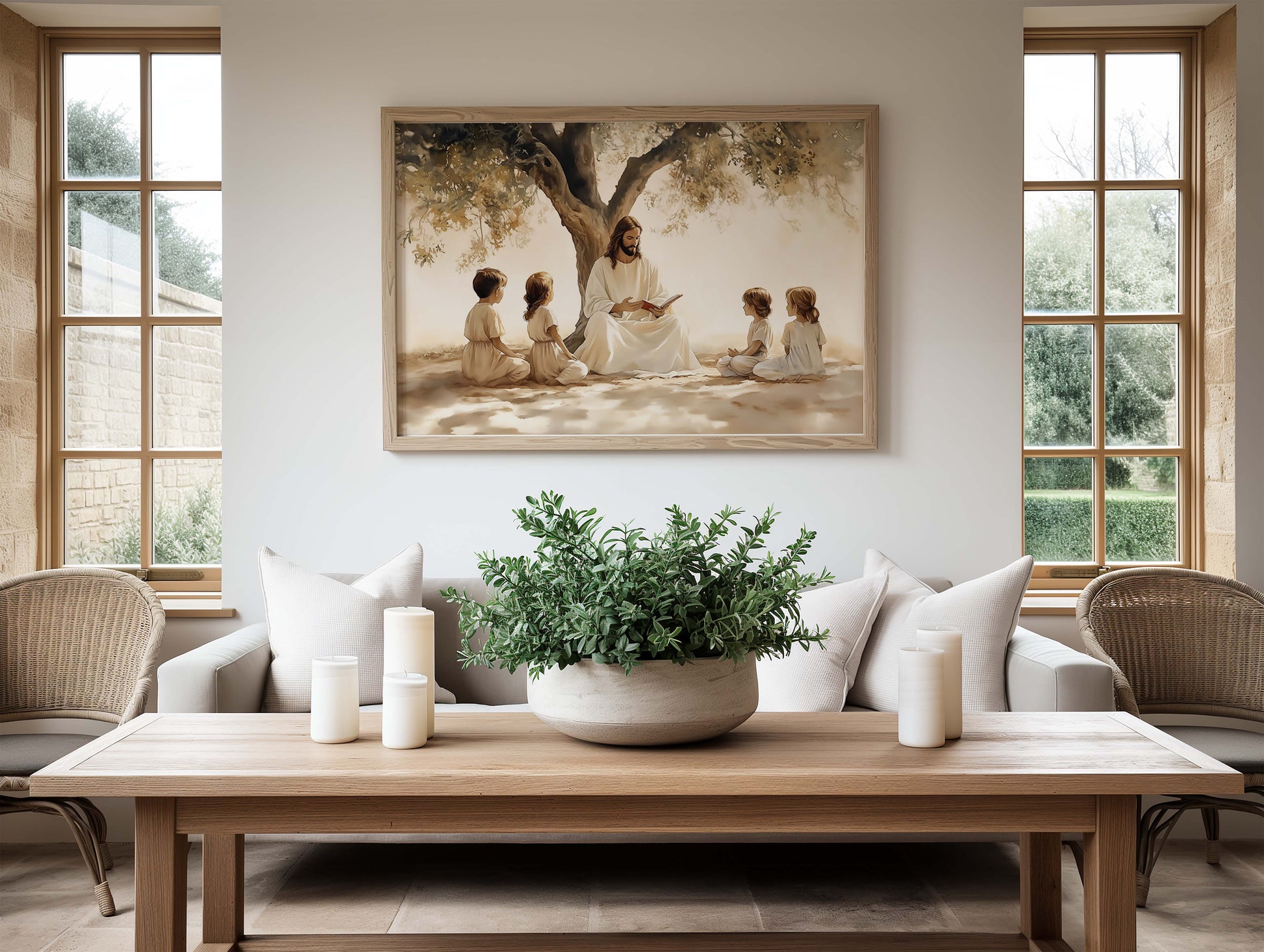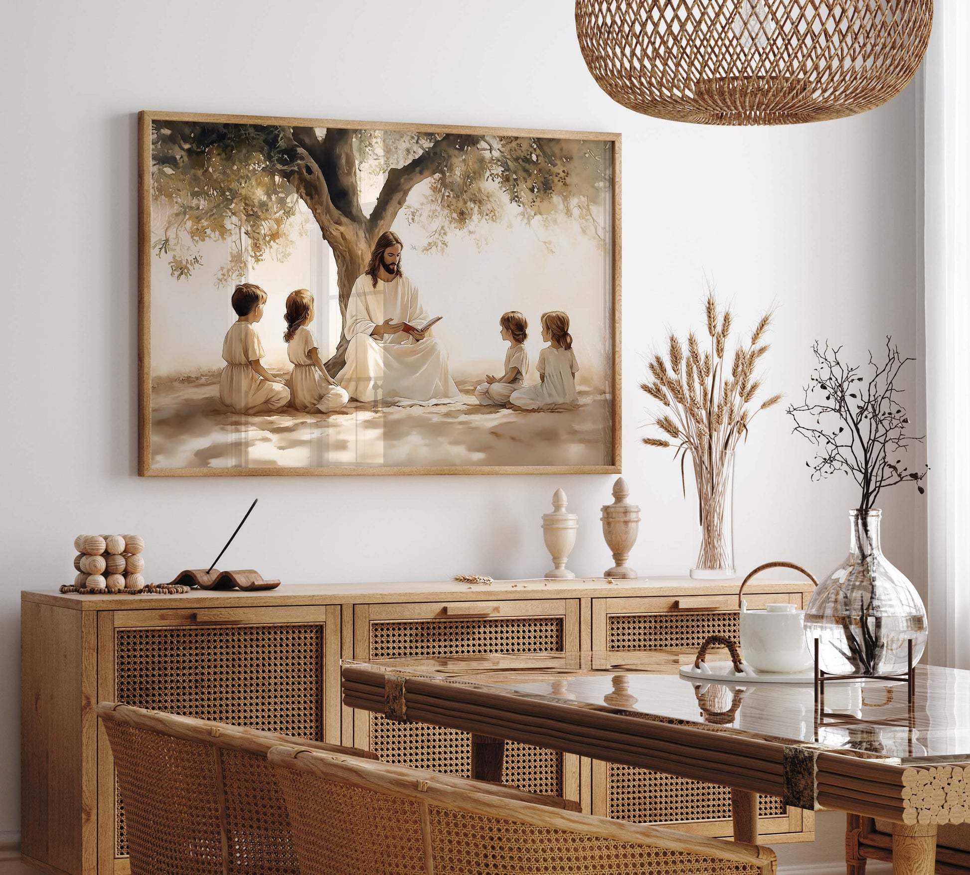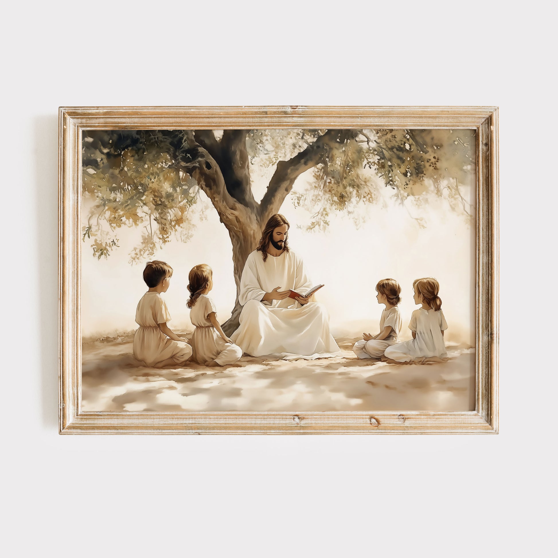 Modern Kristen Poster, Jesus undervisar barn under olivträd.
