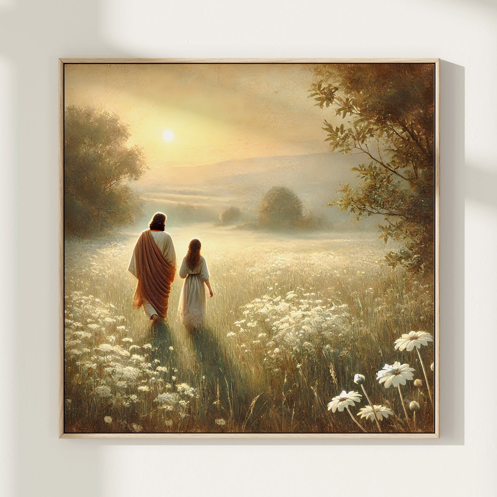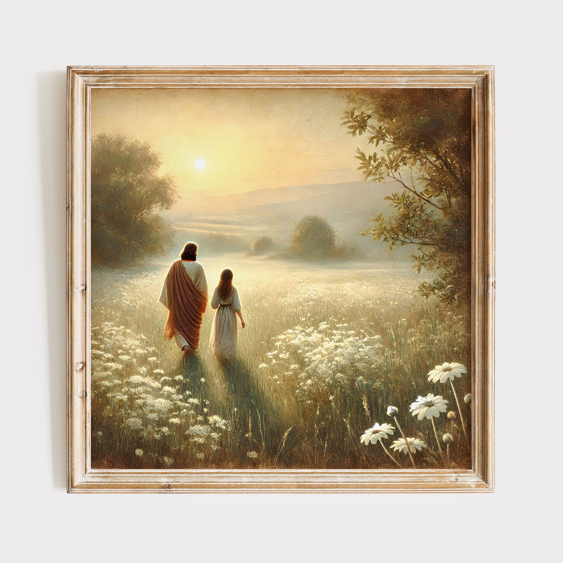 Poser, Jesus och flicka vandrar på sommaräng.