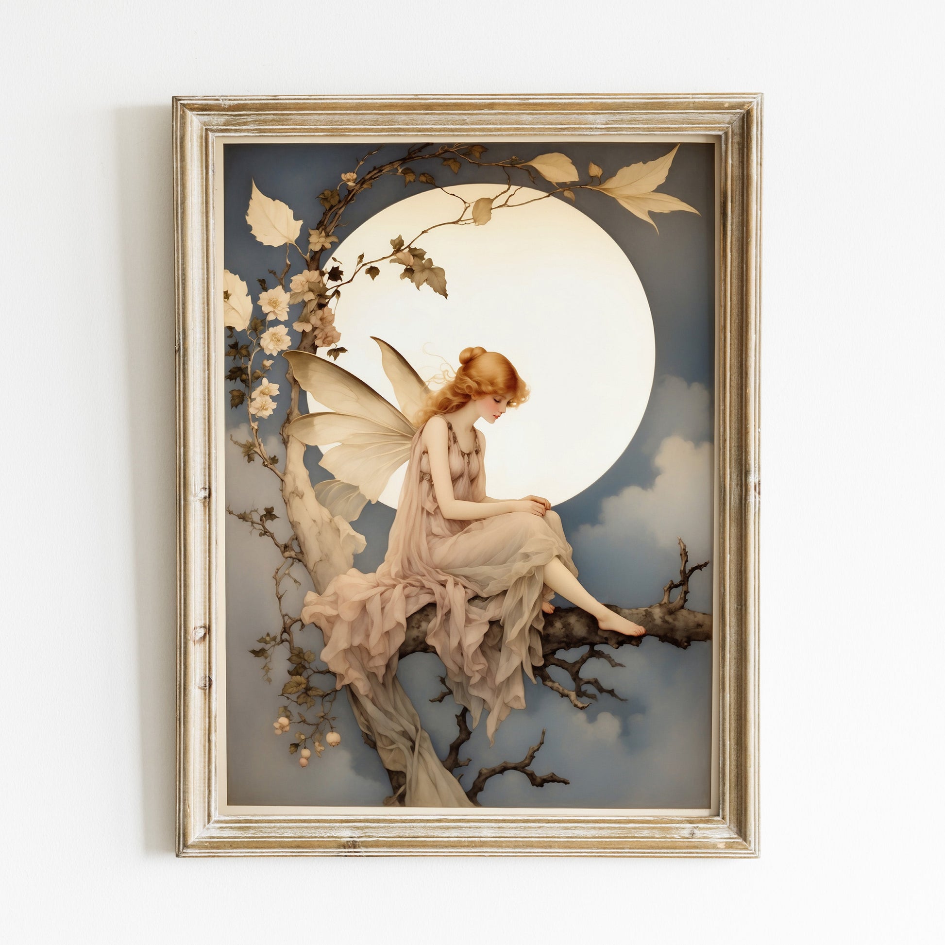 Vintage illustration, älva under fullmåne.