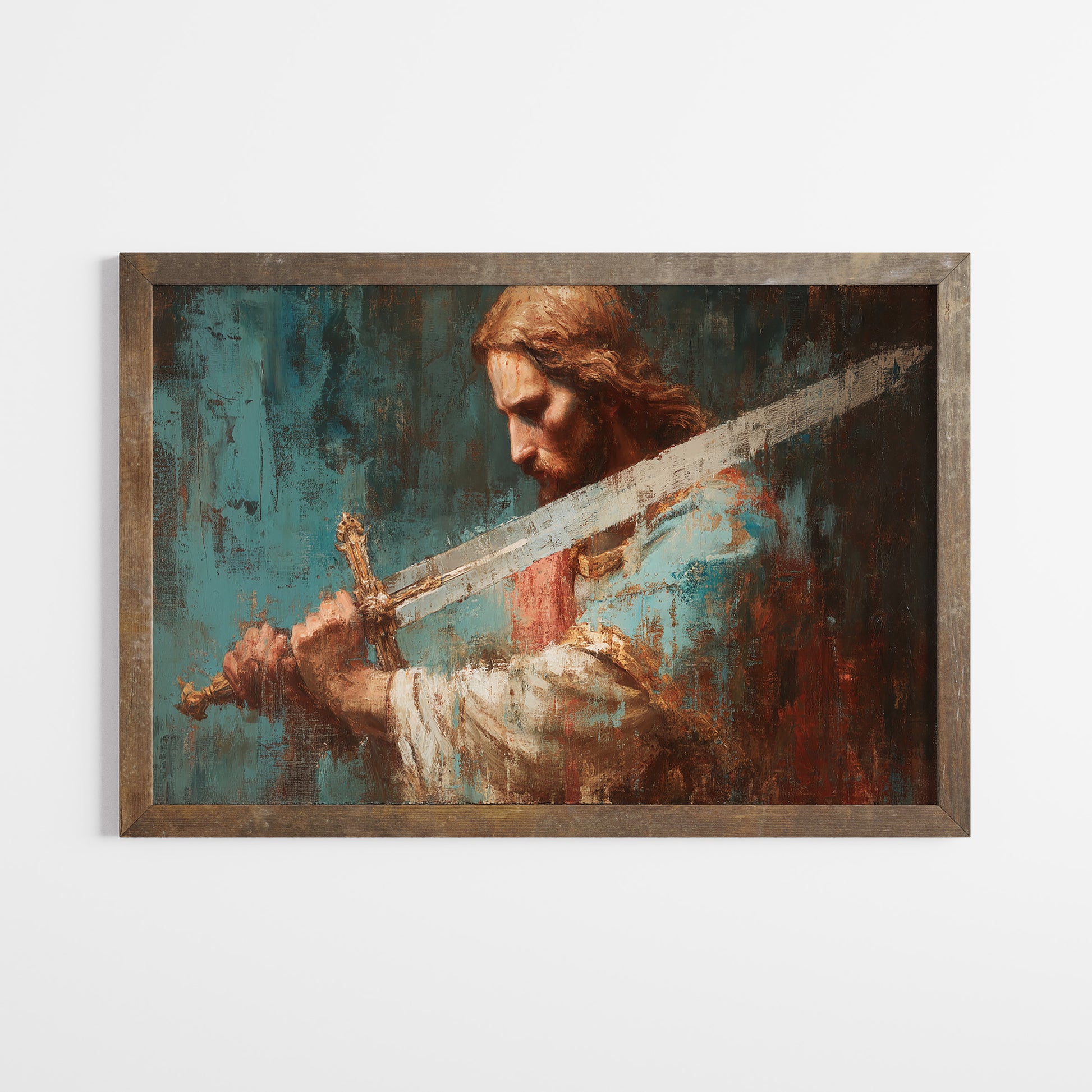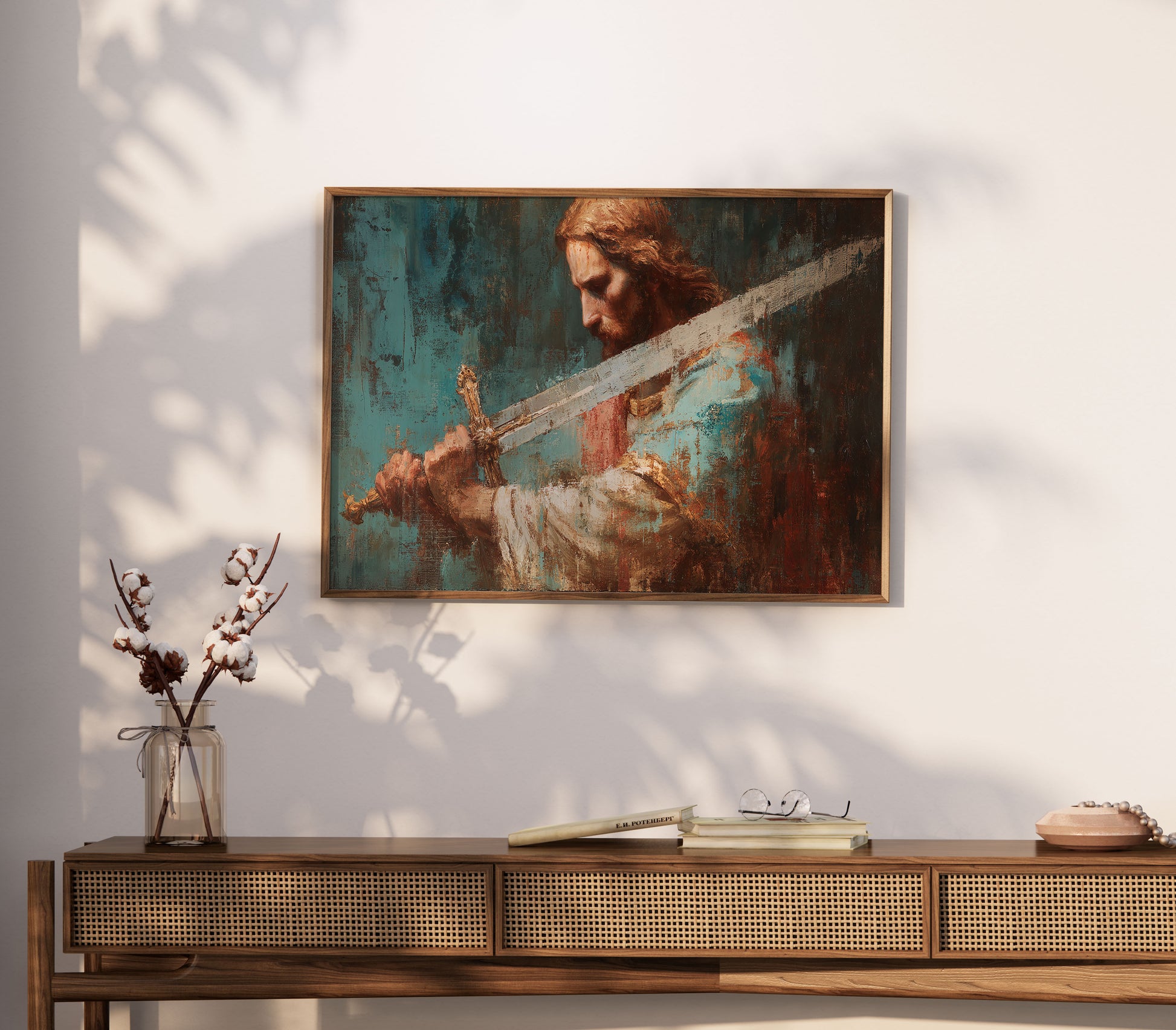 Poster, Jesus kämpar för dig, Jesus med svärd abstrakt oljemålning.