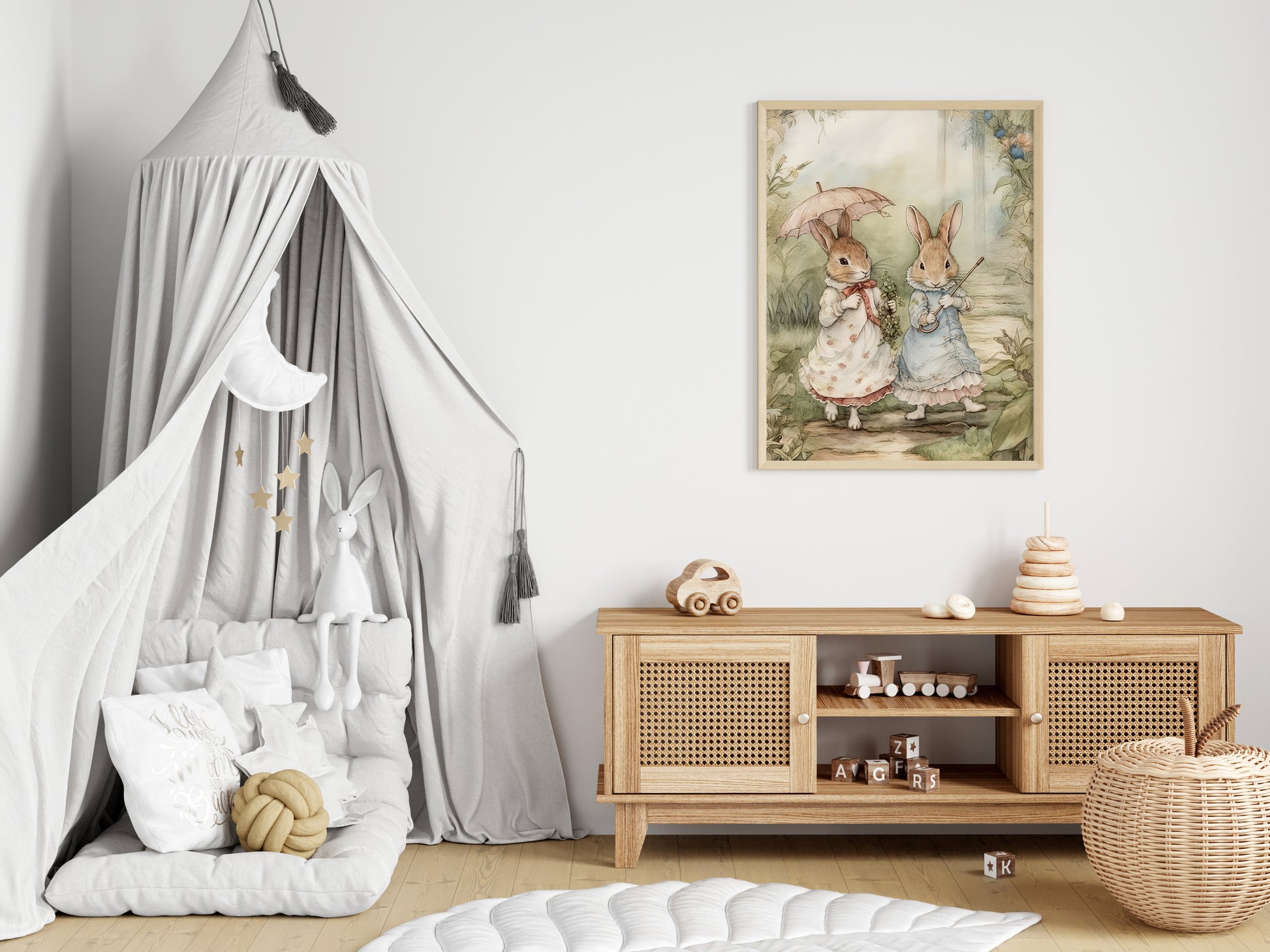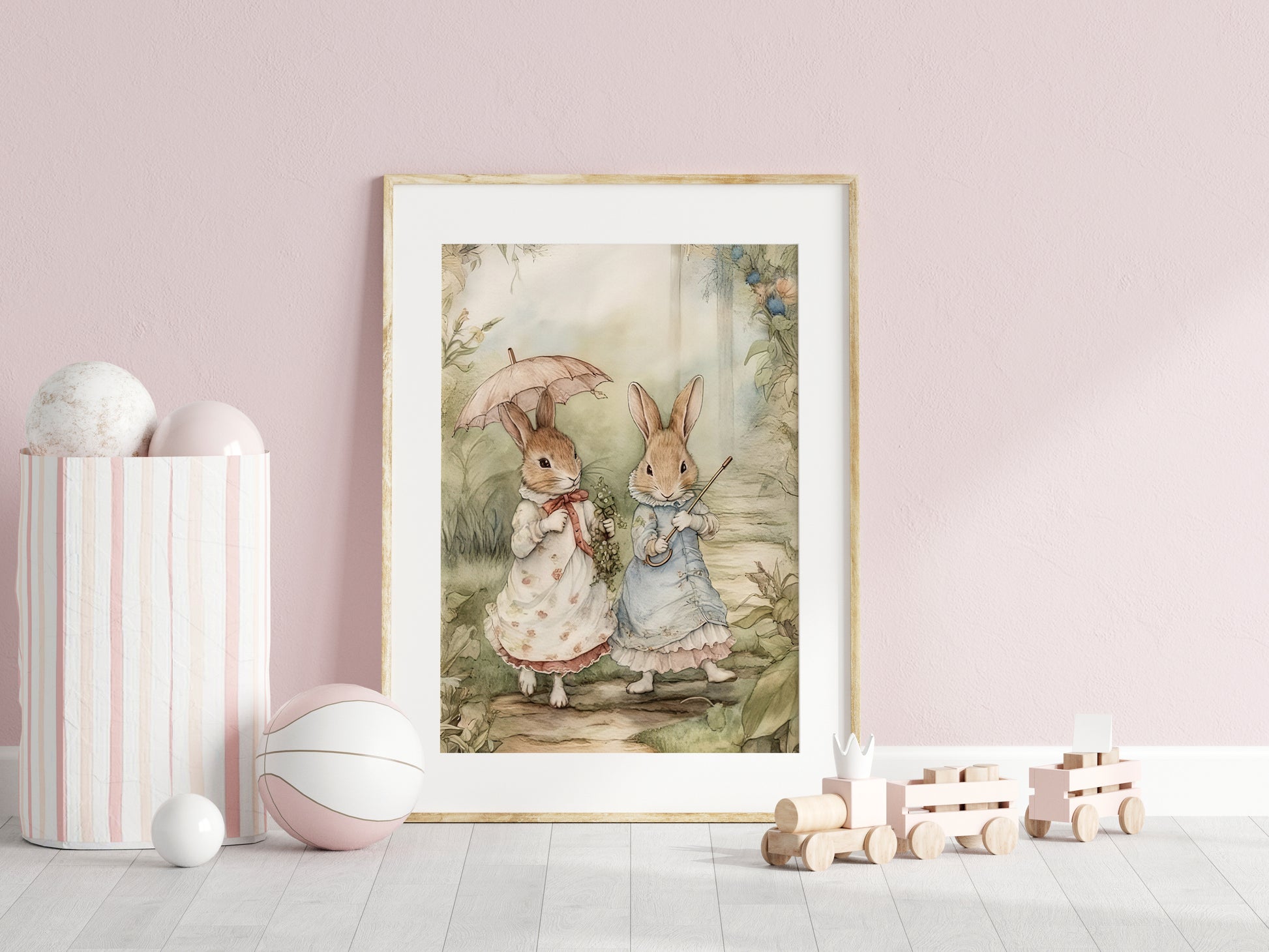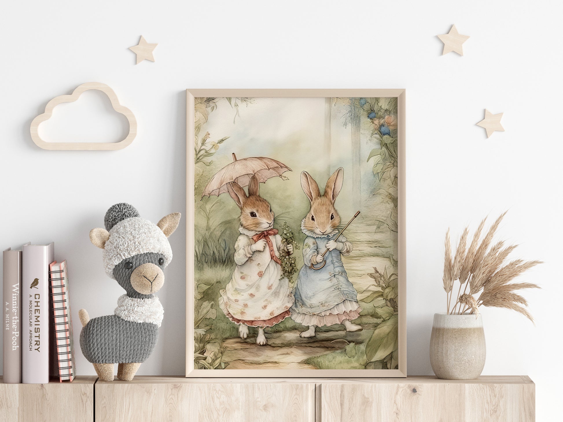 Retro Illustration för barnrummet. Beatrix Potter, kaniner.