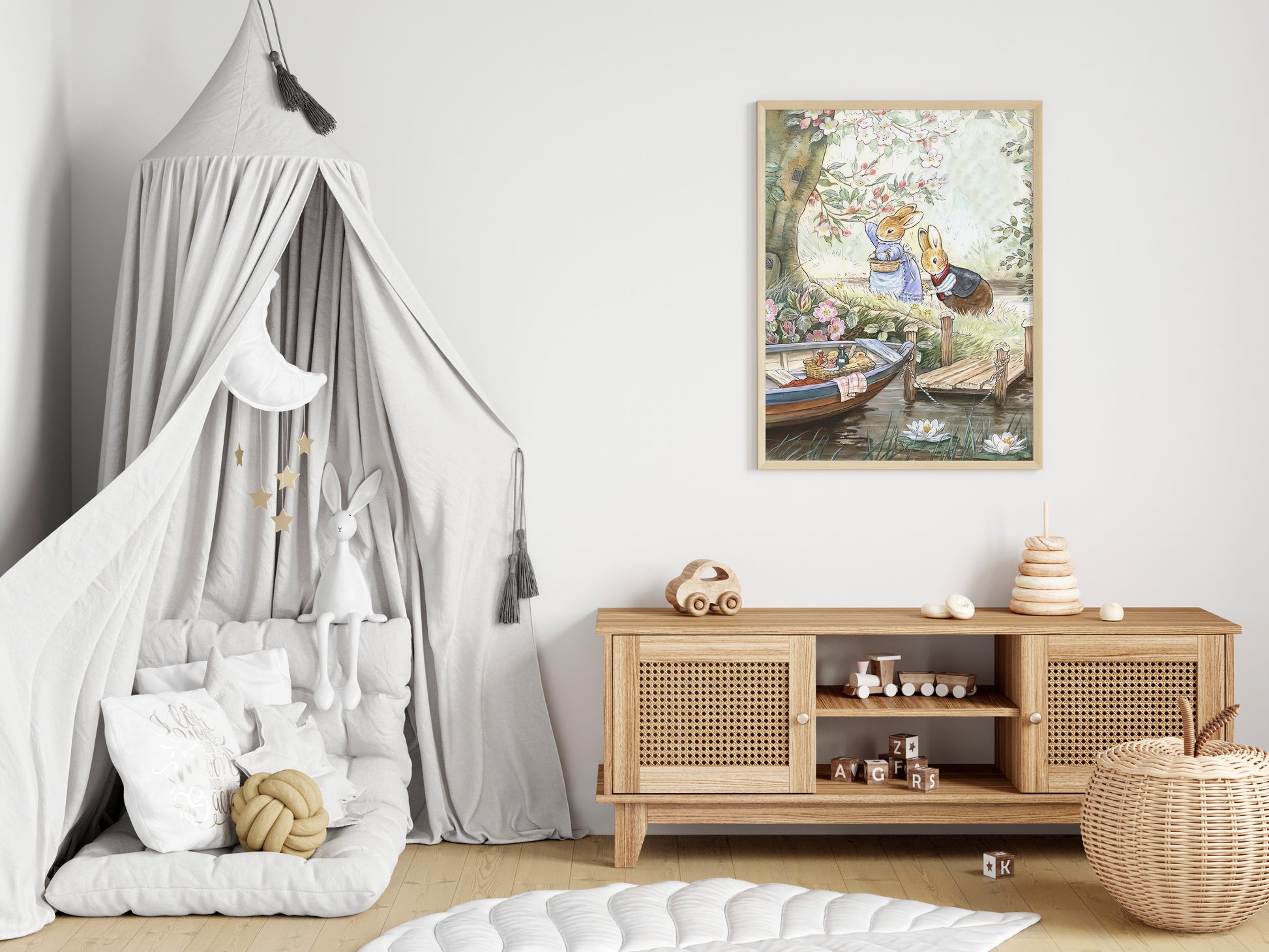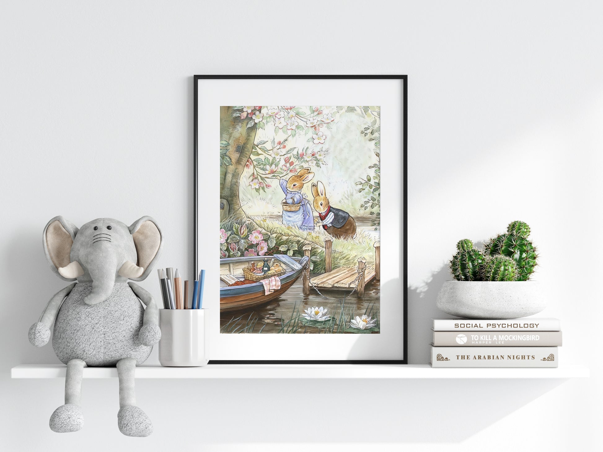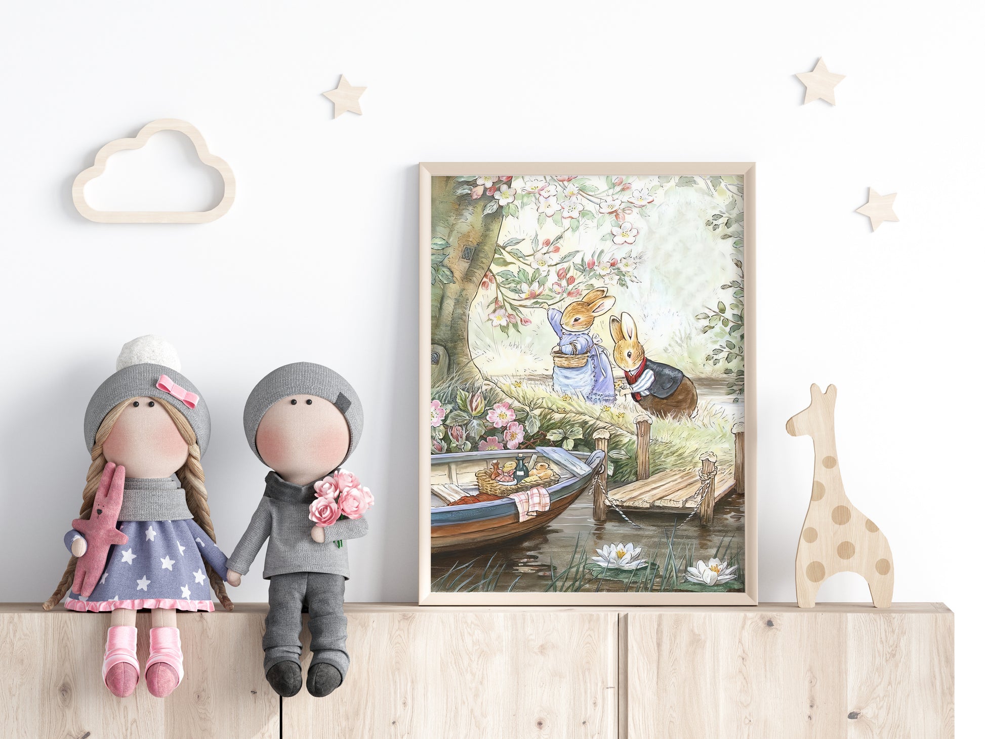 Retro Illustration för barnrummet. Beatrix Potter, kaniner på picknick.