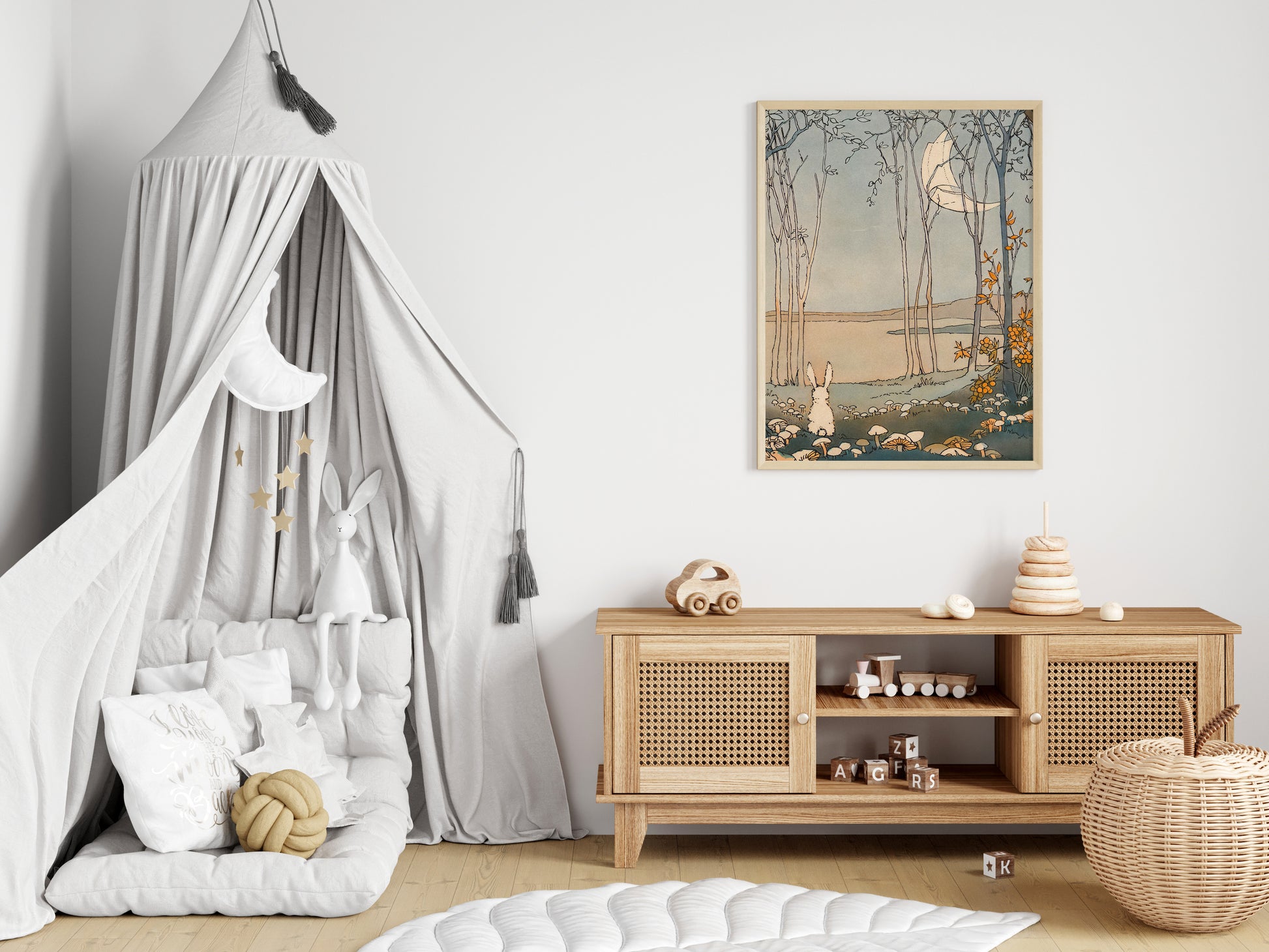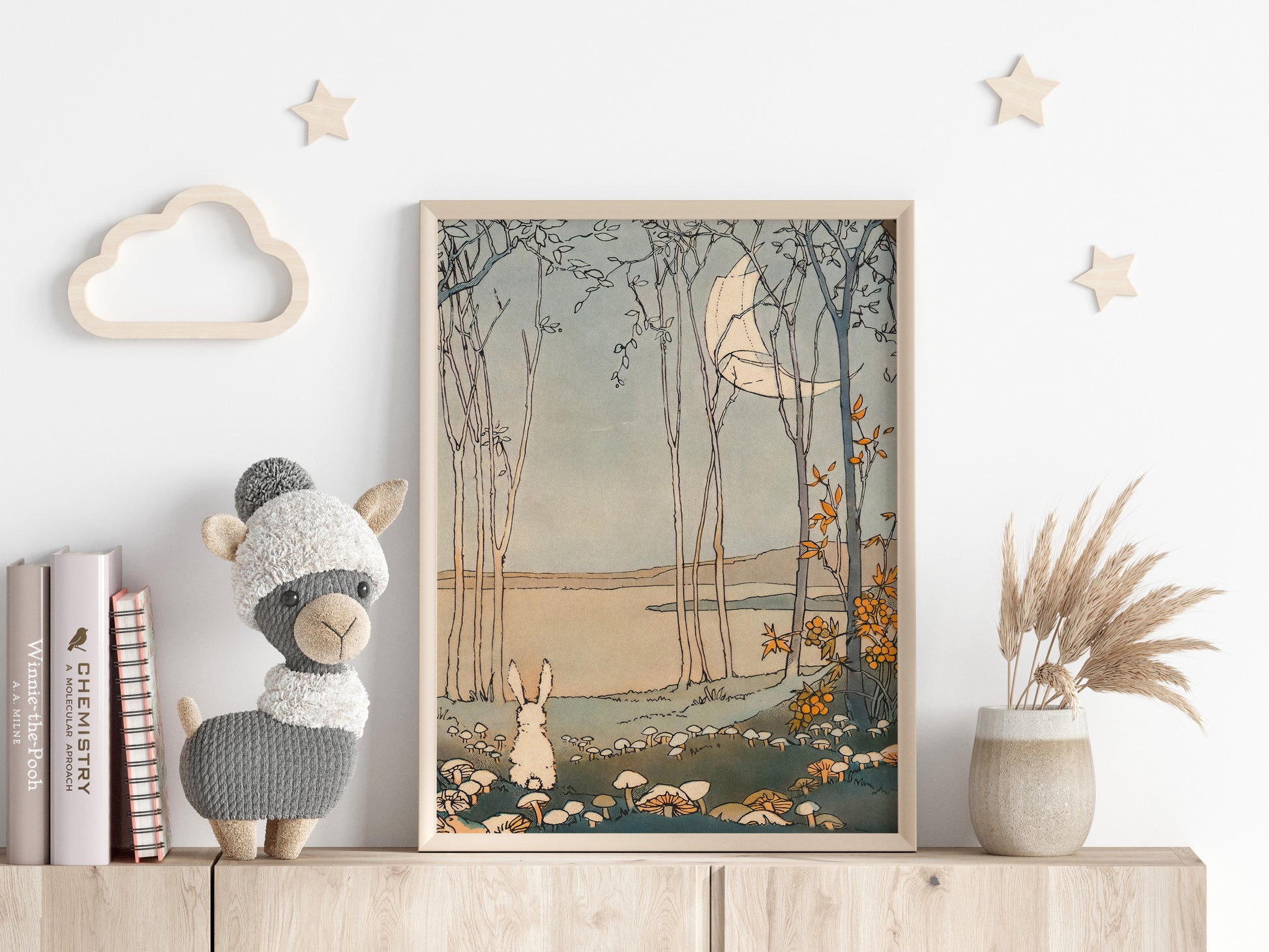 Vintage illustration för barnrummet. Kanin i magisk skog.