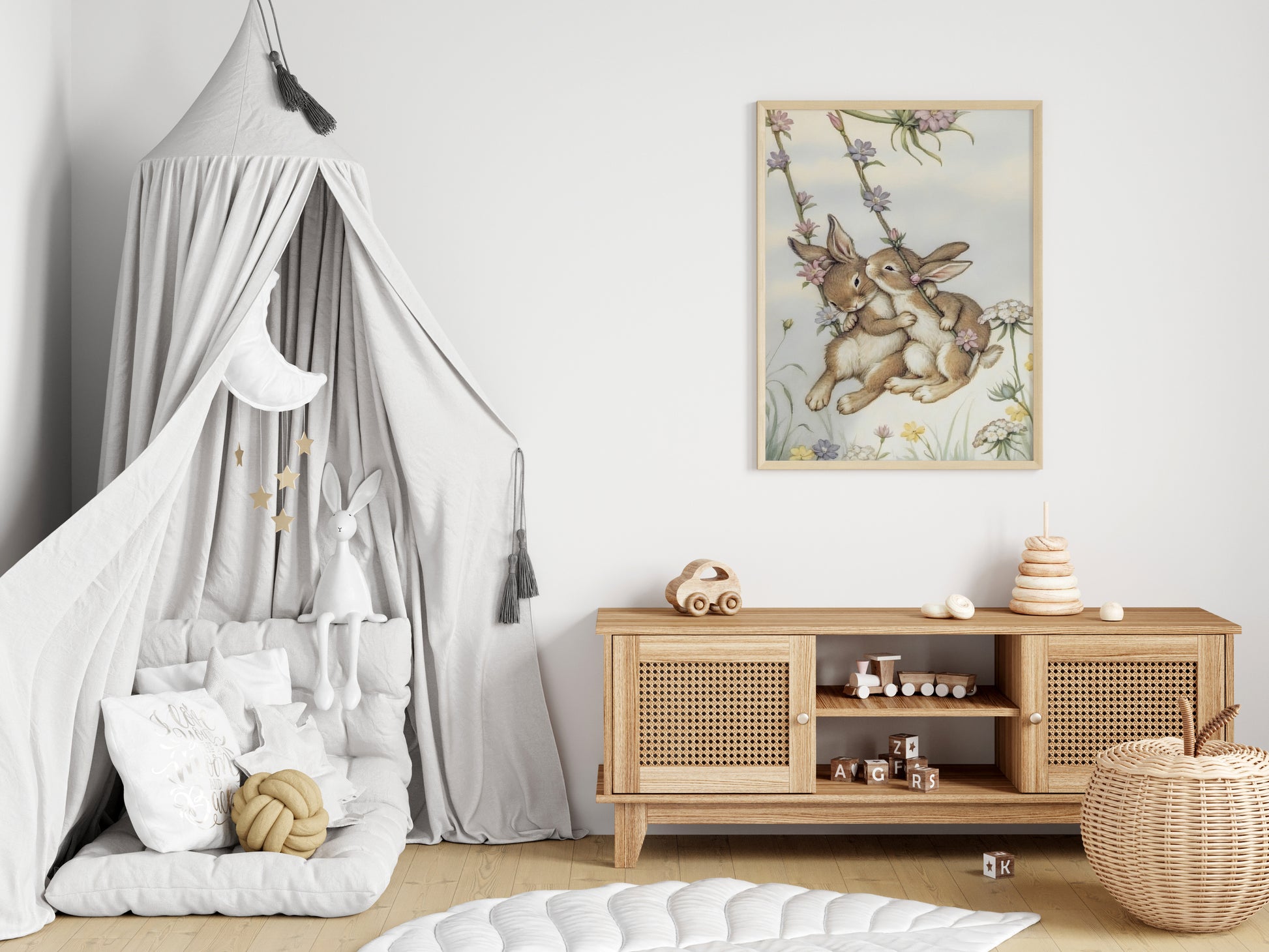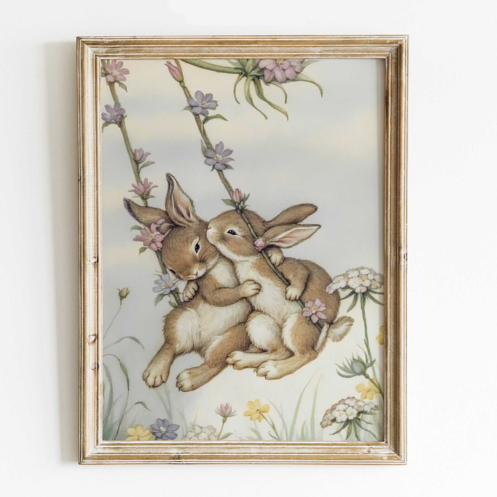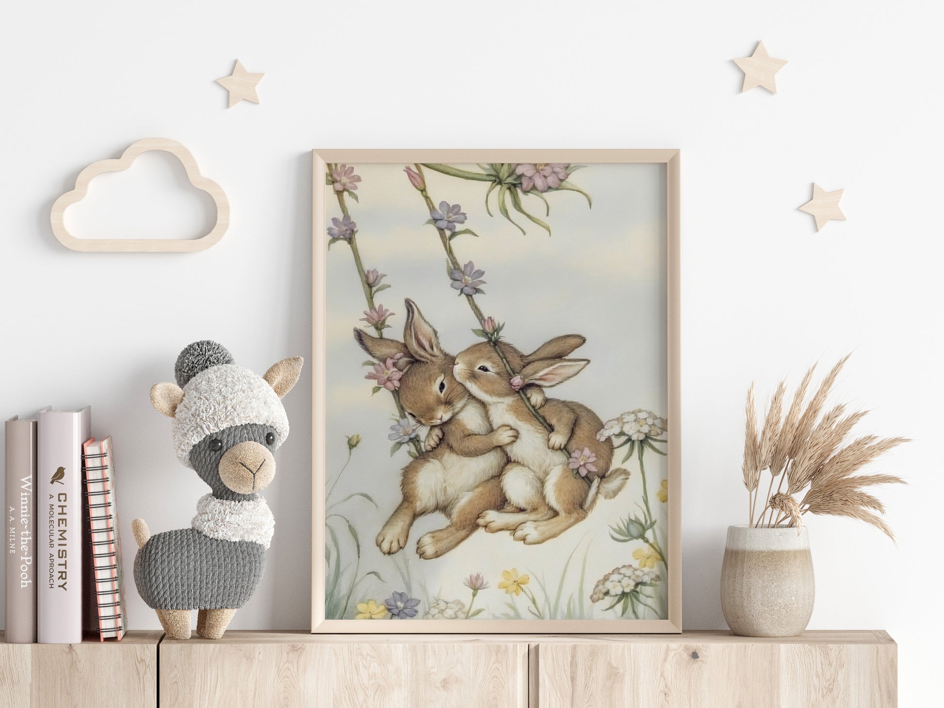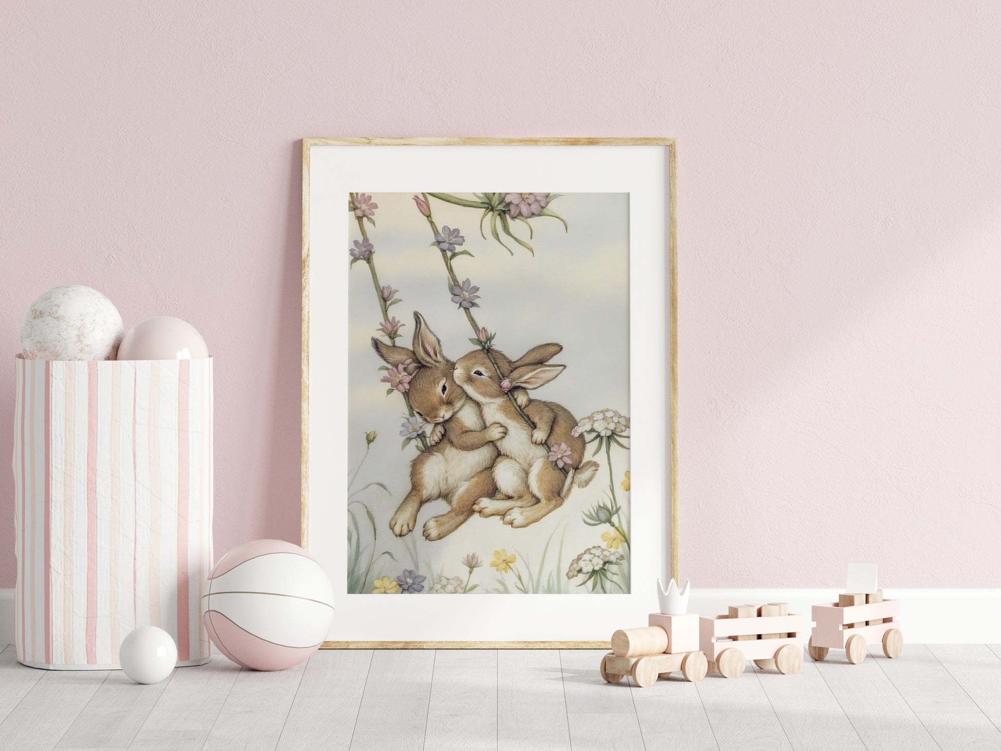 Retro Illustration för barnrummet. Kaniner på gunga.