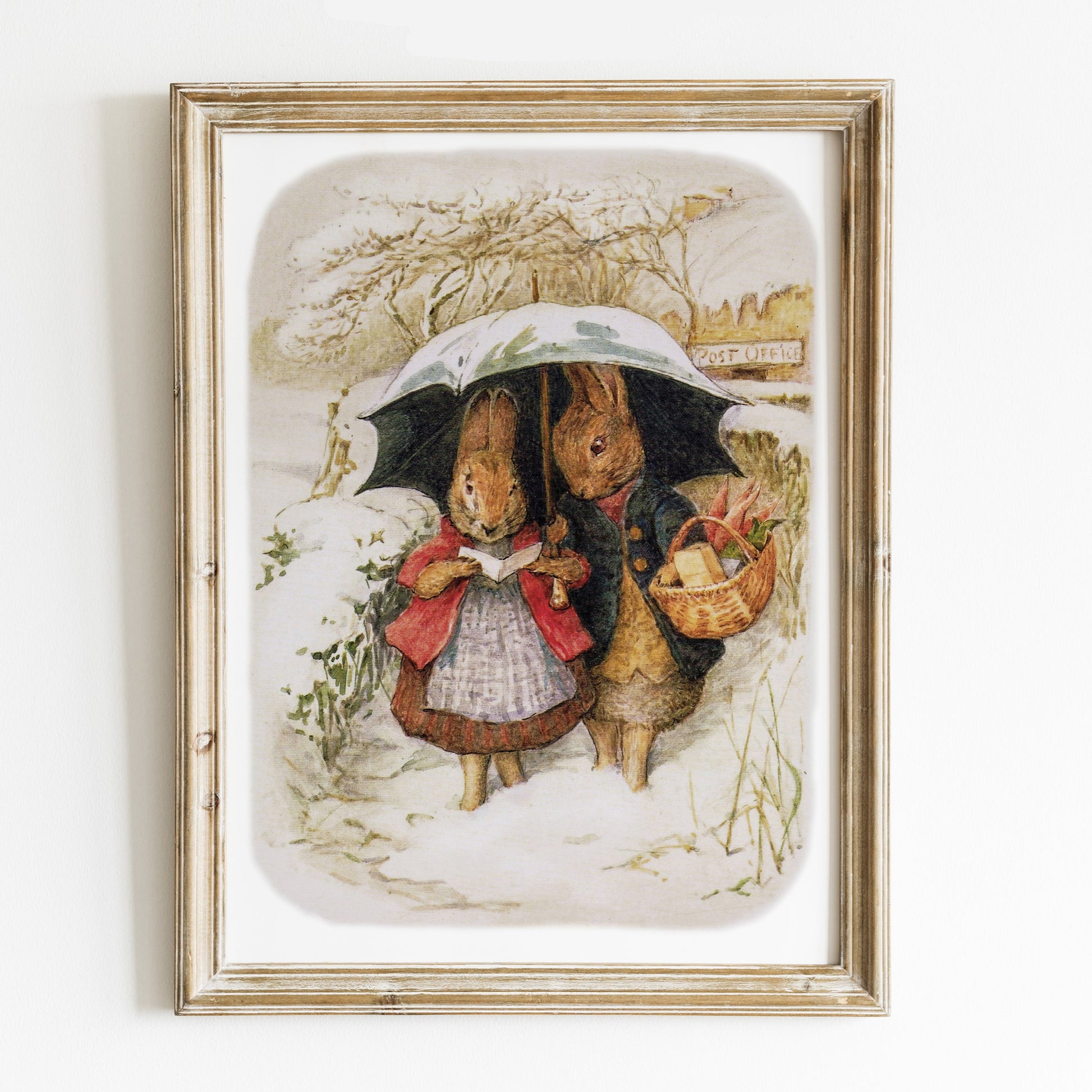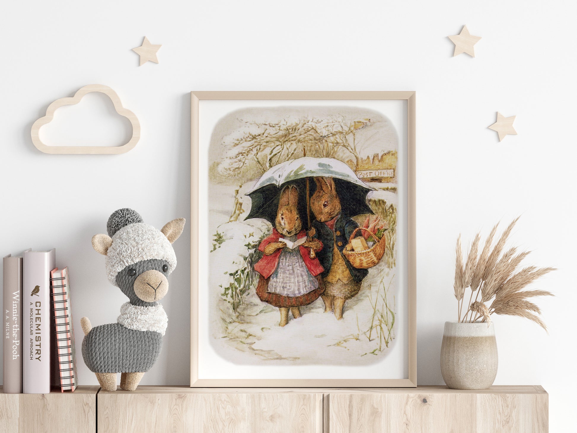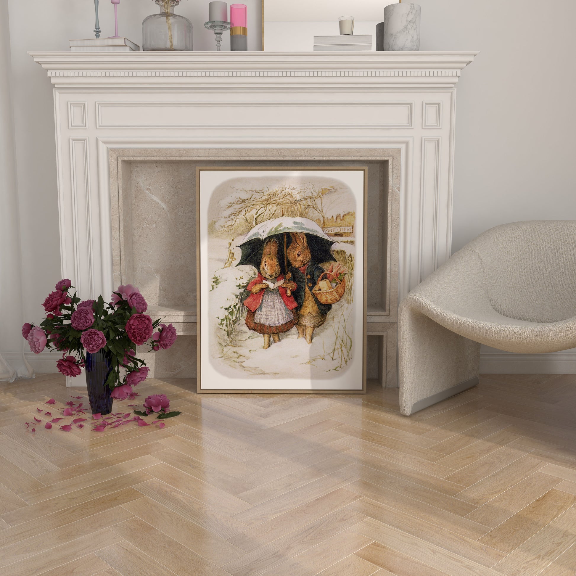 Retro Illustration för barnrummet. Kaniner under paraply.
