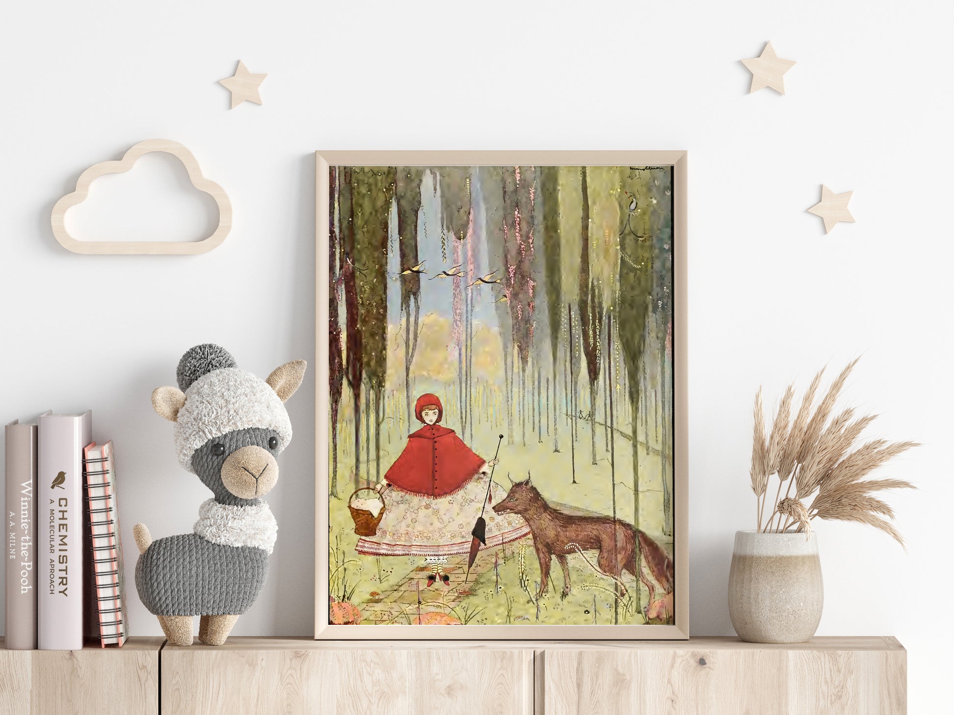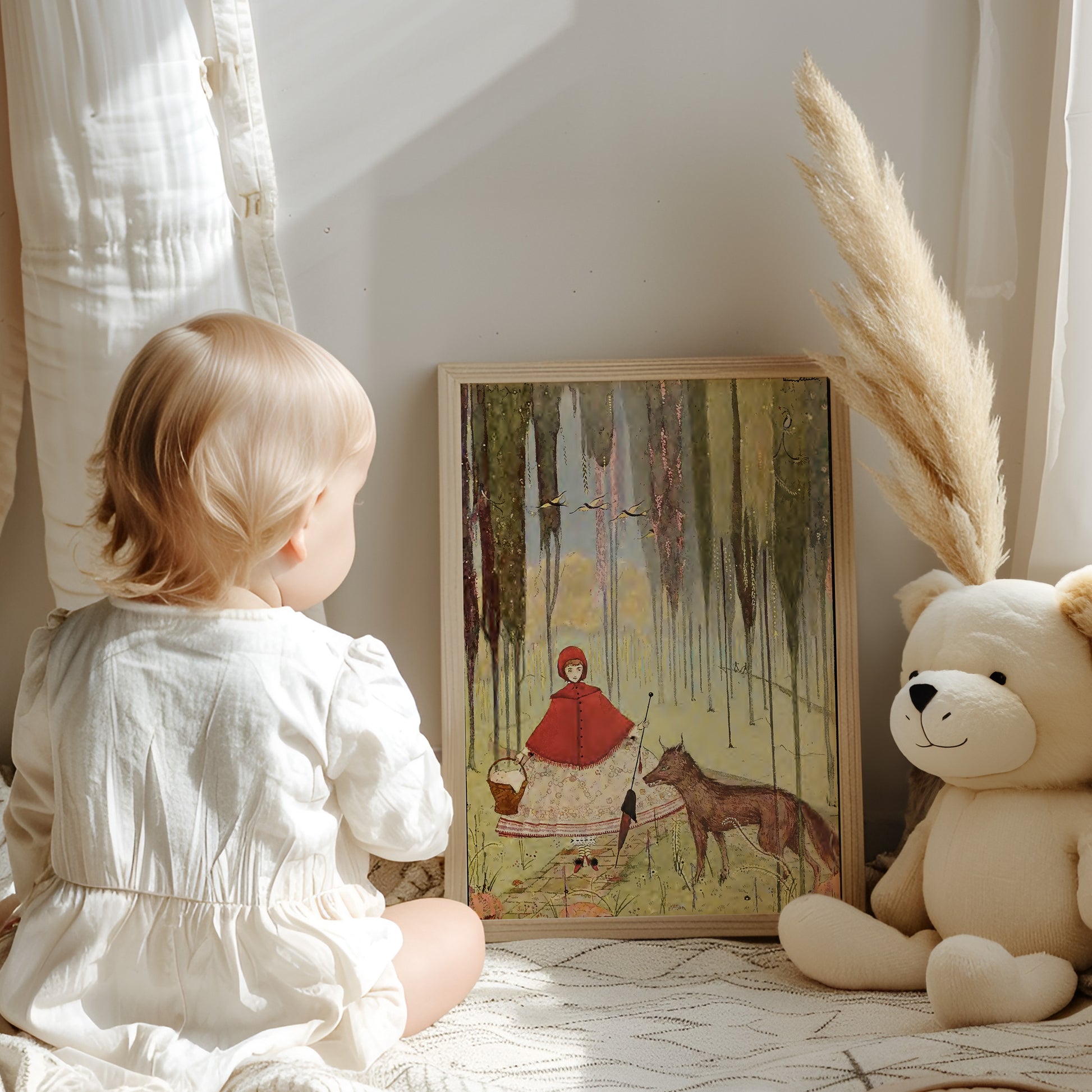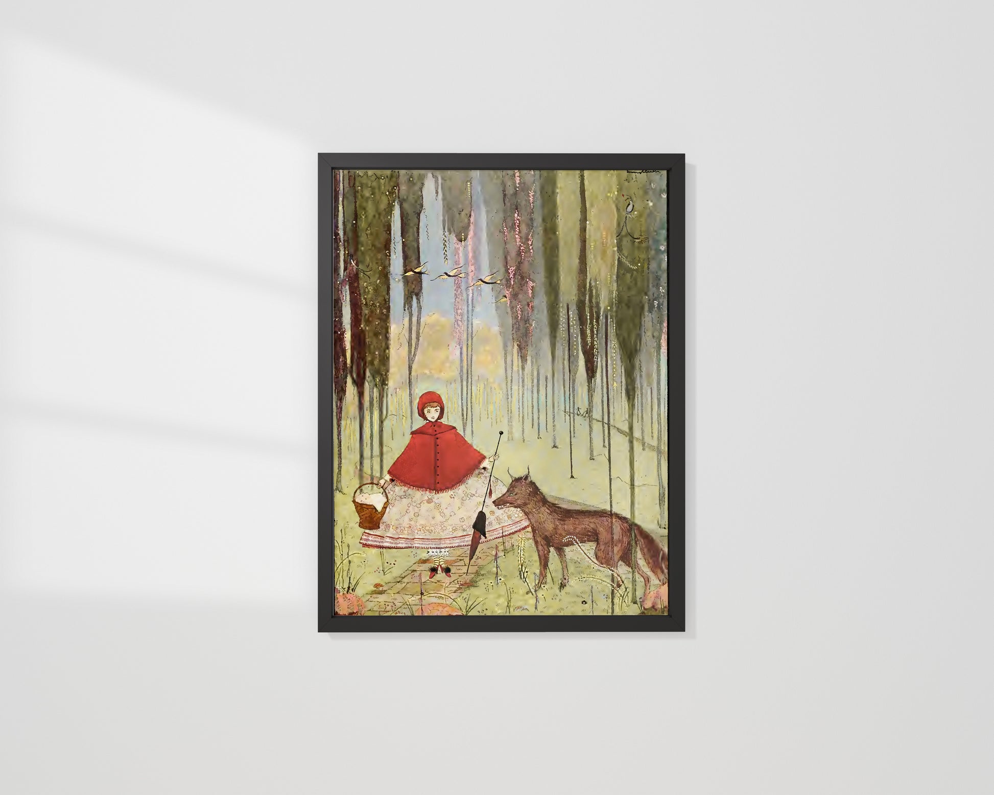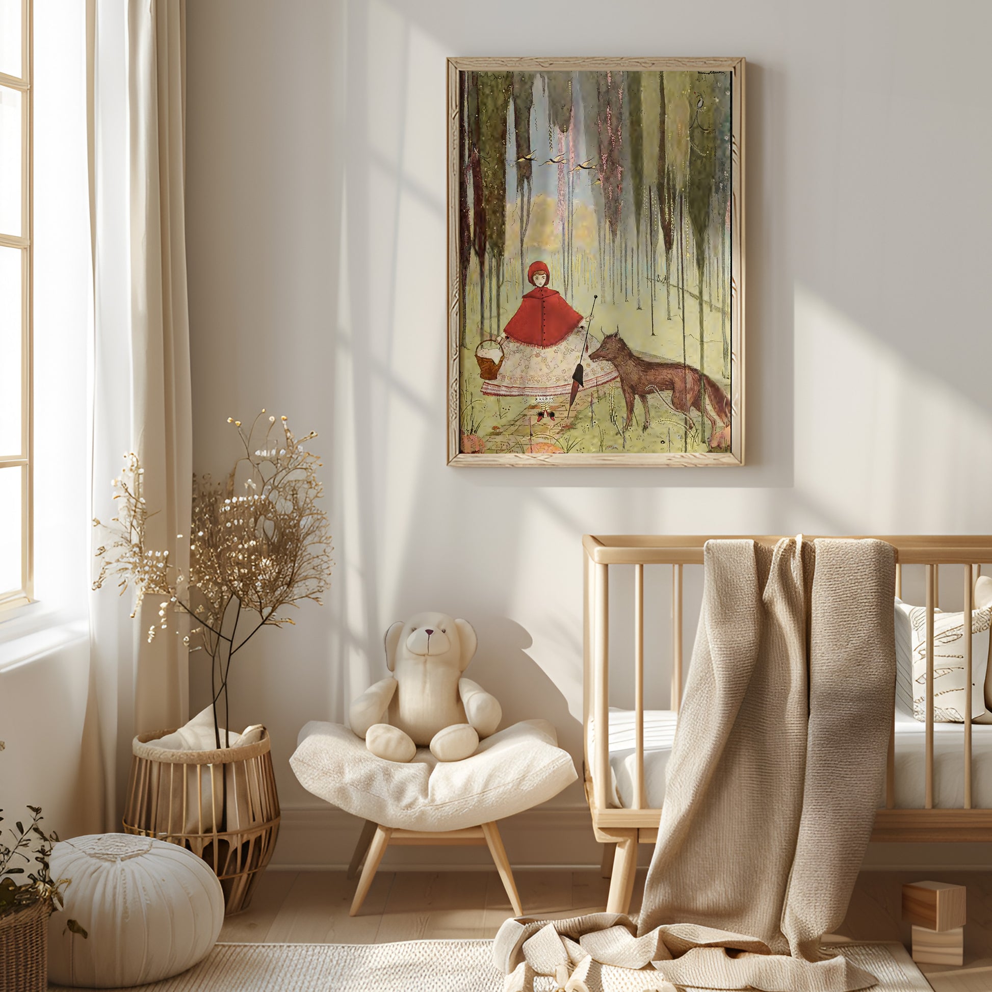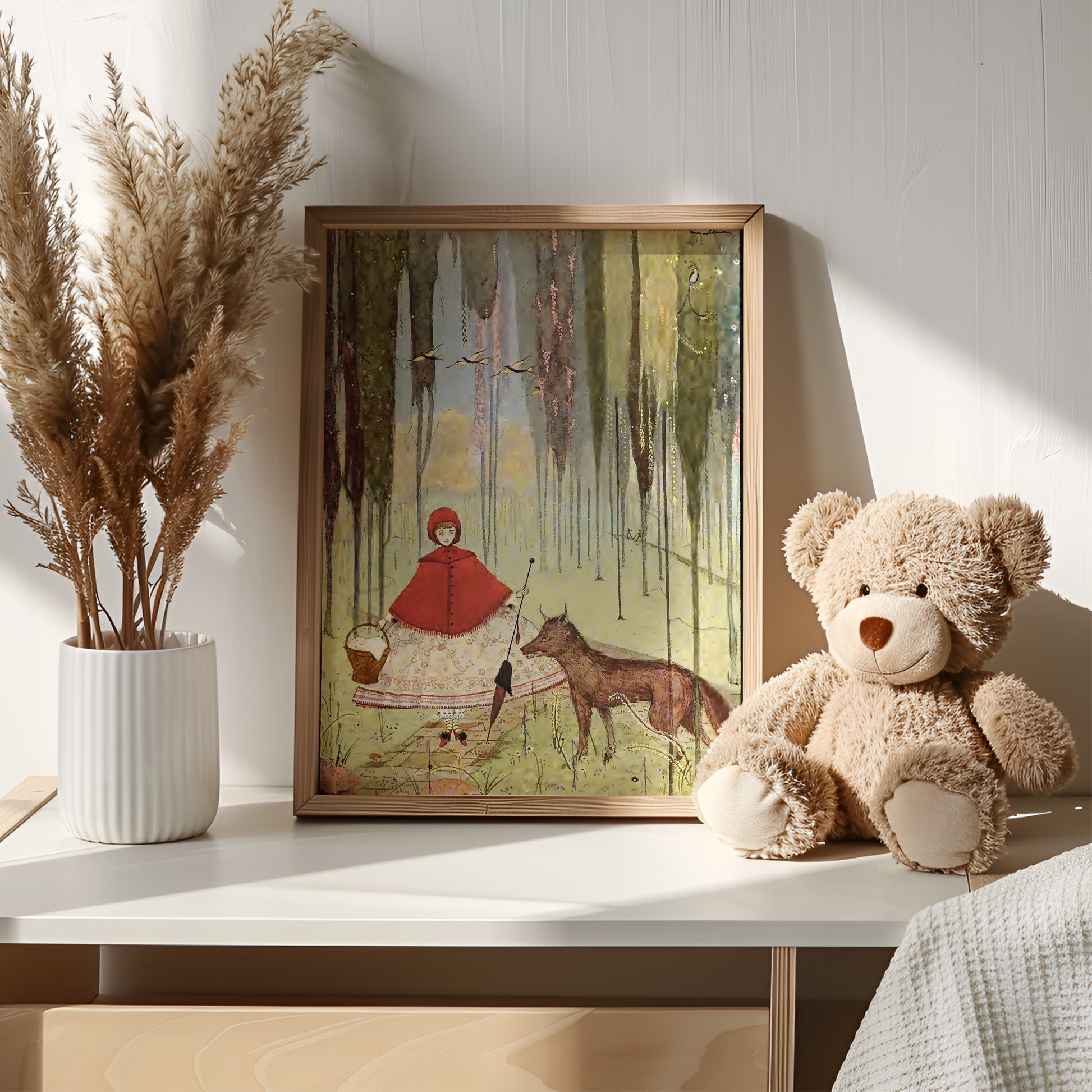 Retro illustration för barnrummet, Rödluvan och vargen.