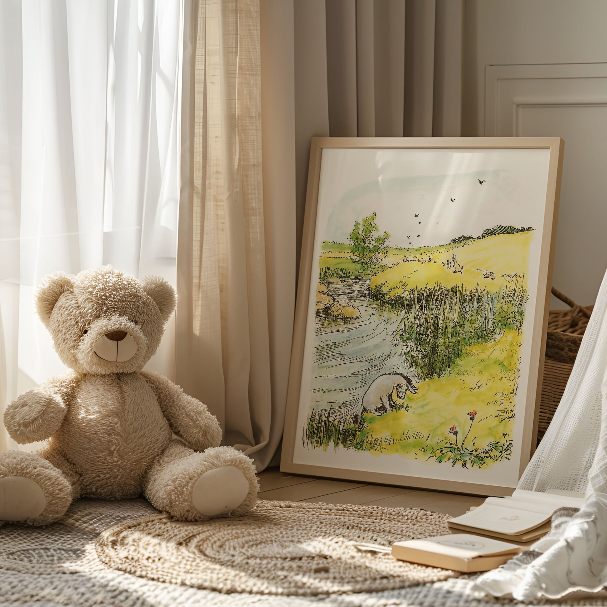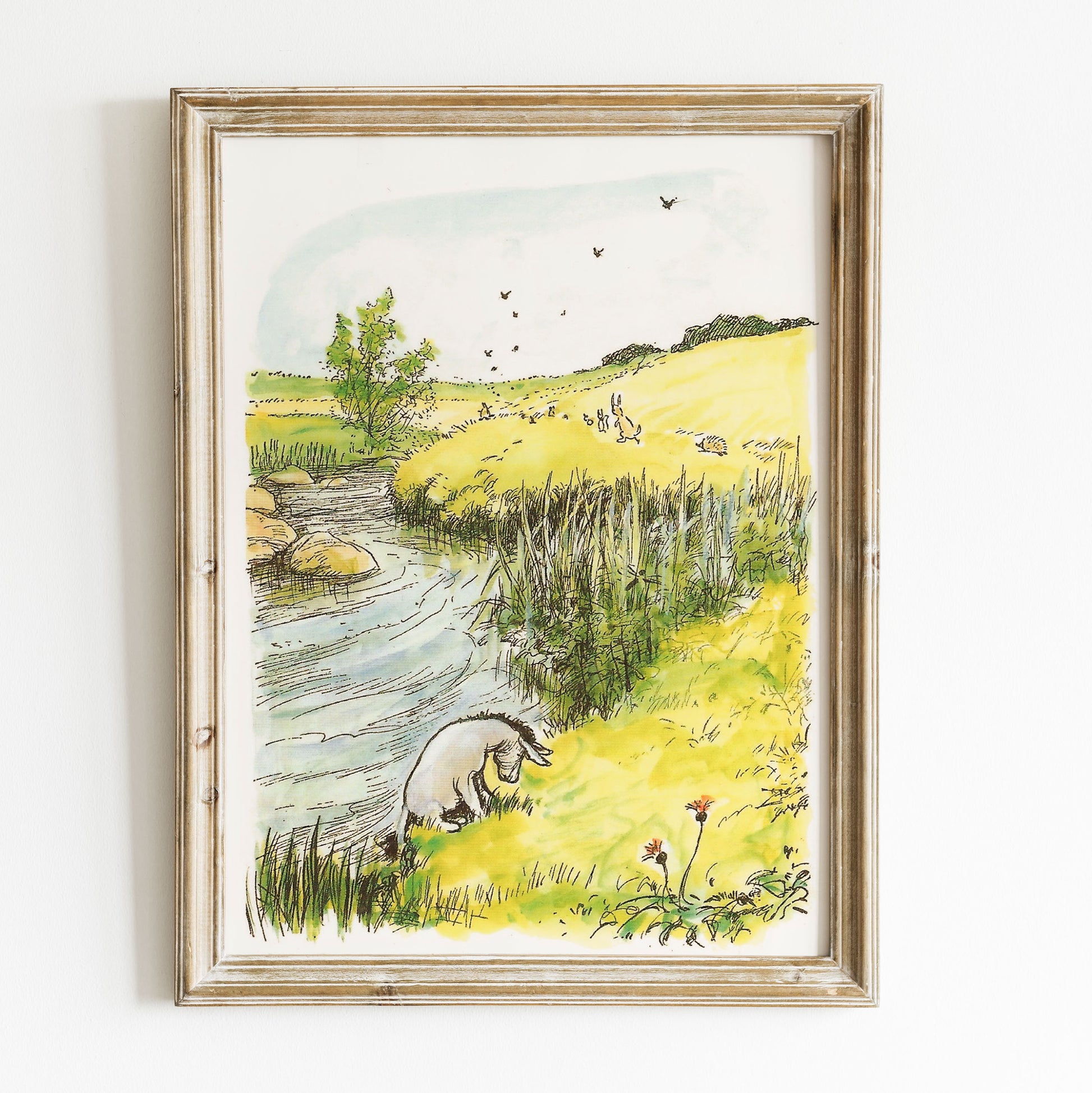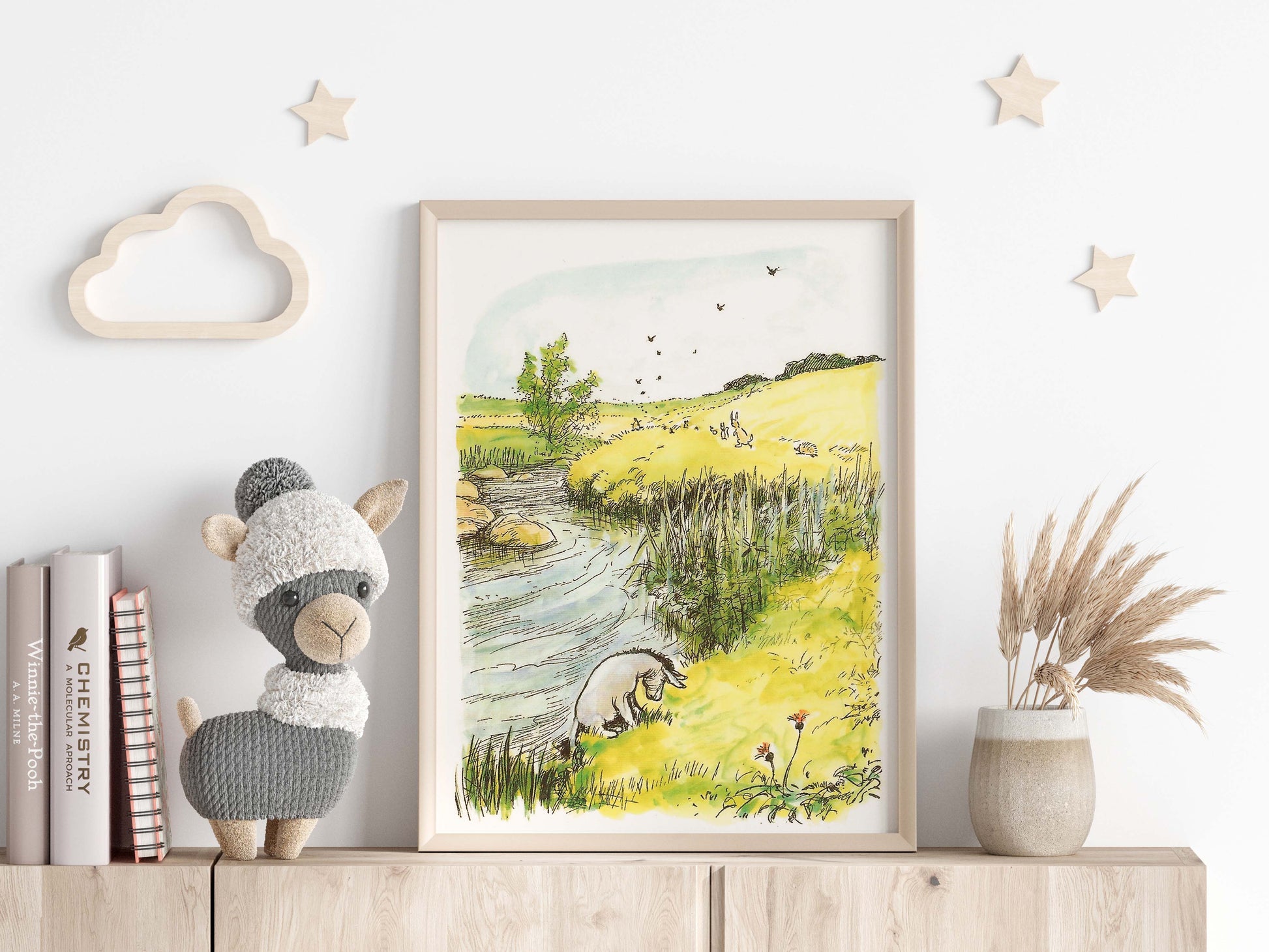 Retro Nalle Puh illustration för barnrummet. Io vid floden.