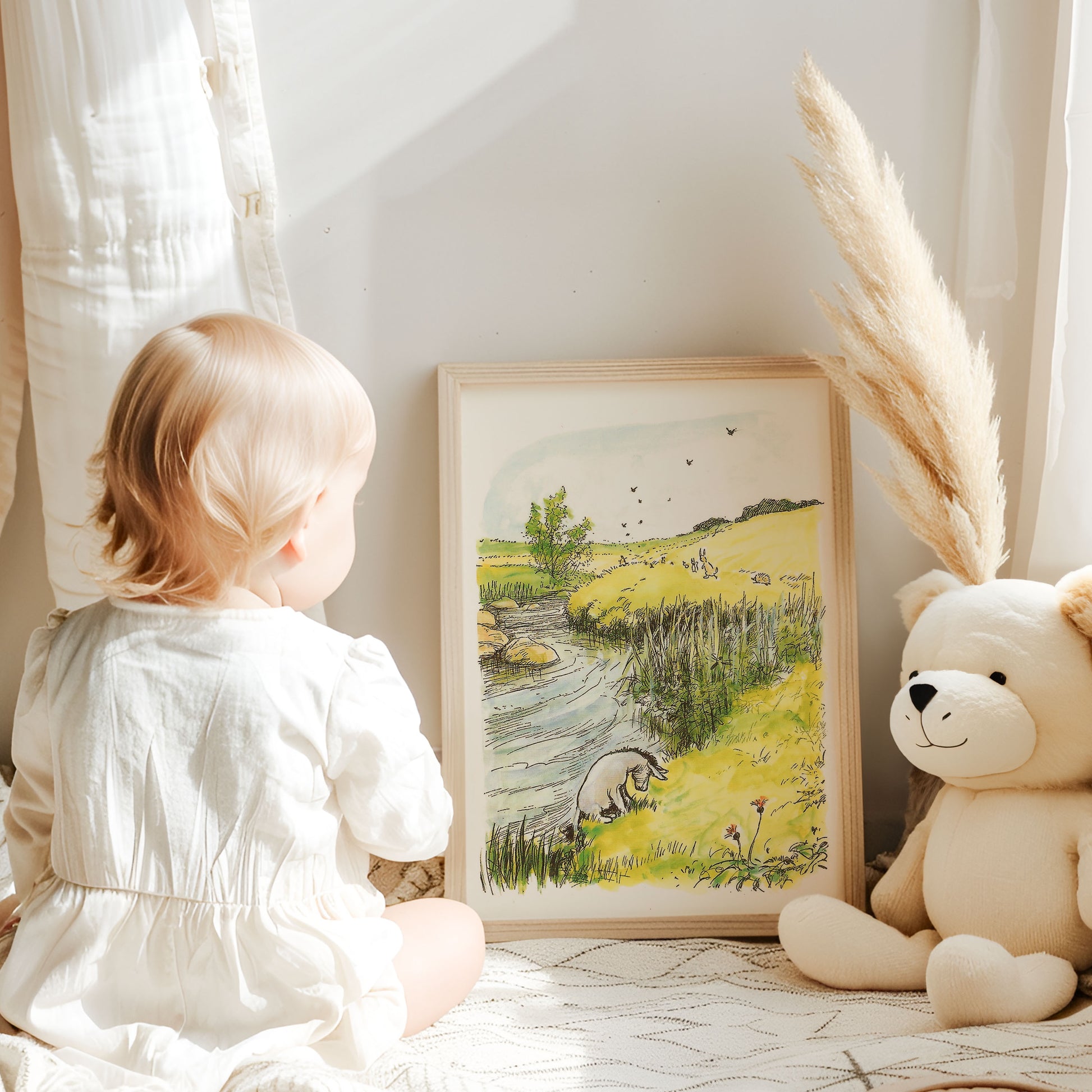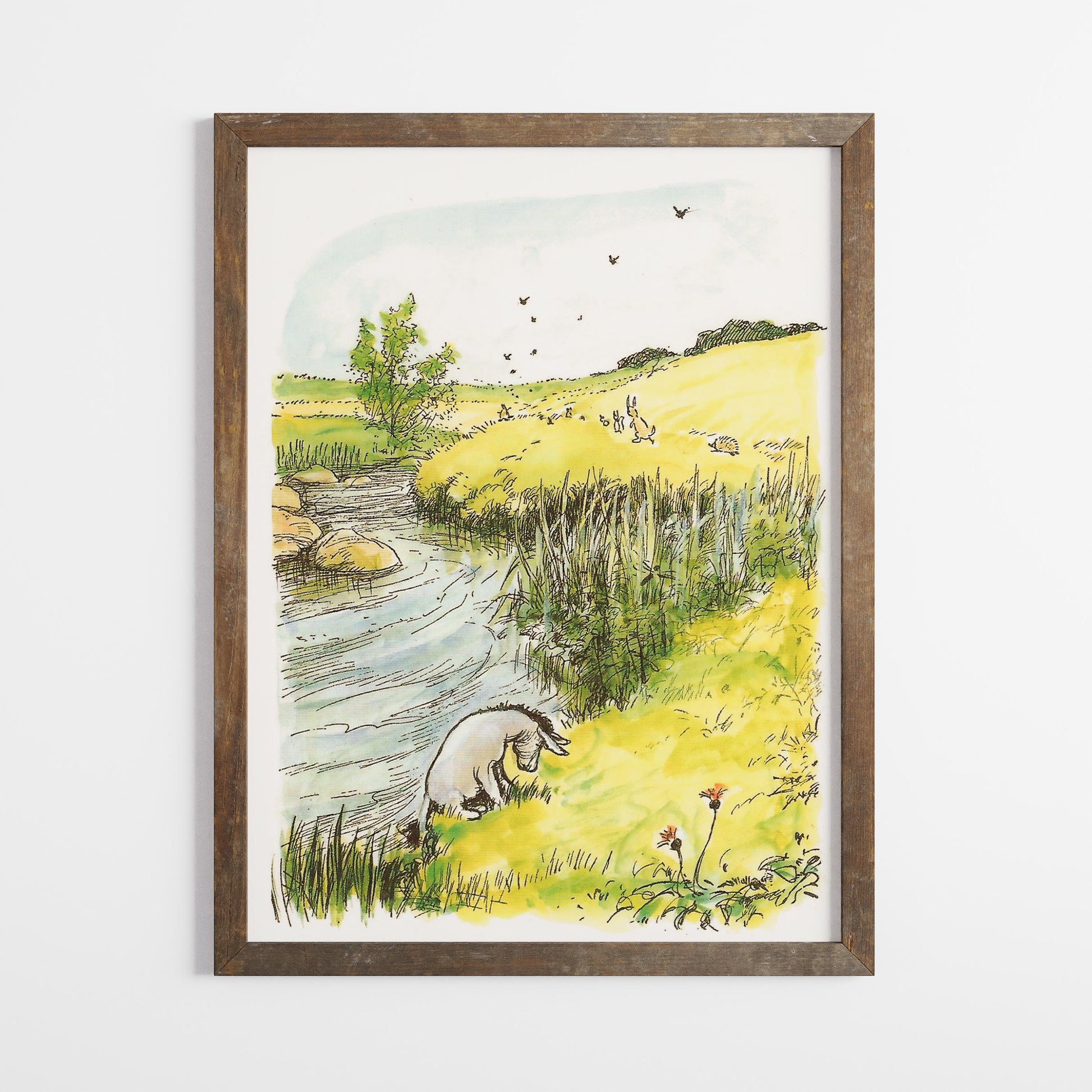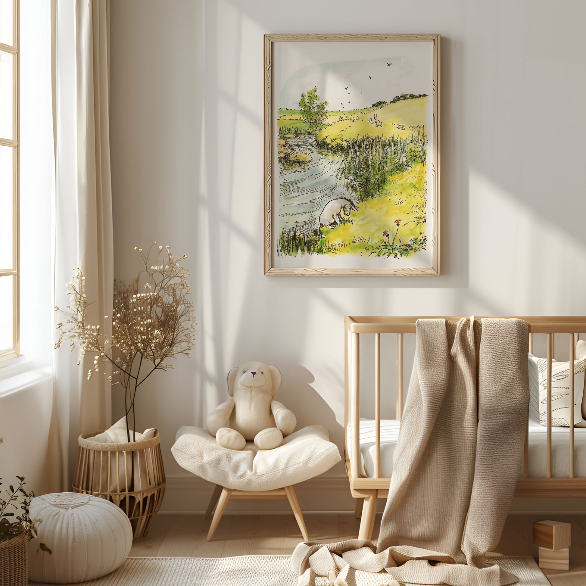 Retro Nalle Puh illustration för barnrummet. Io vid floden.
