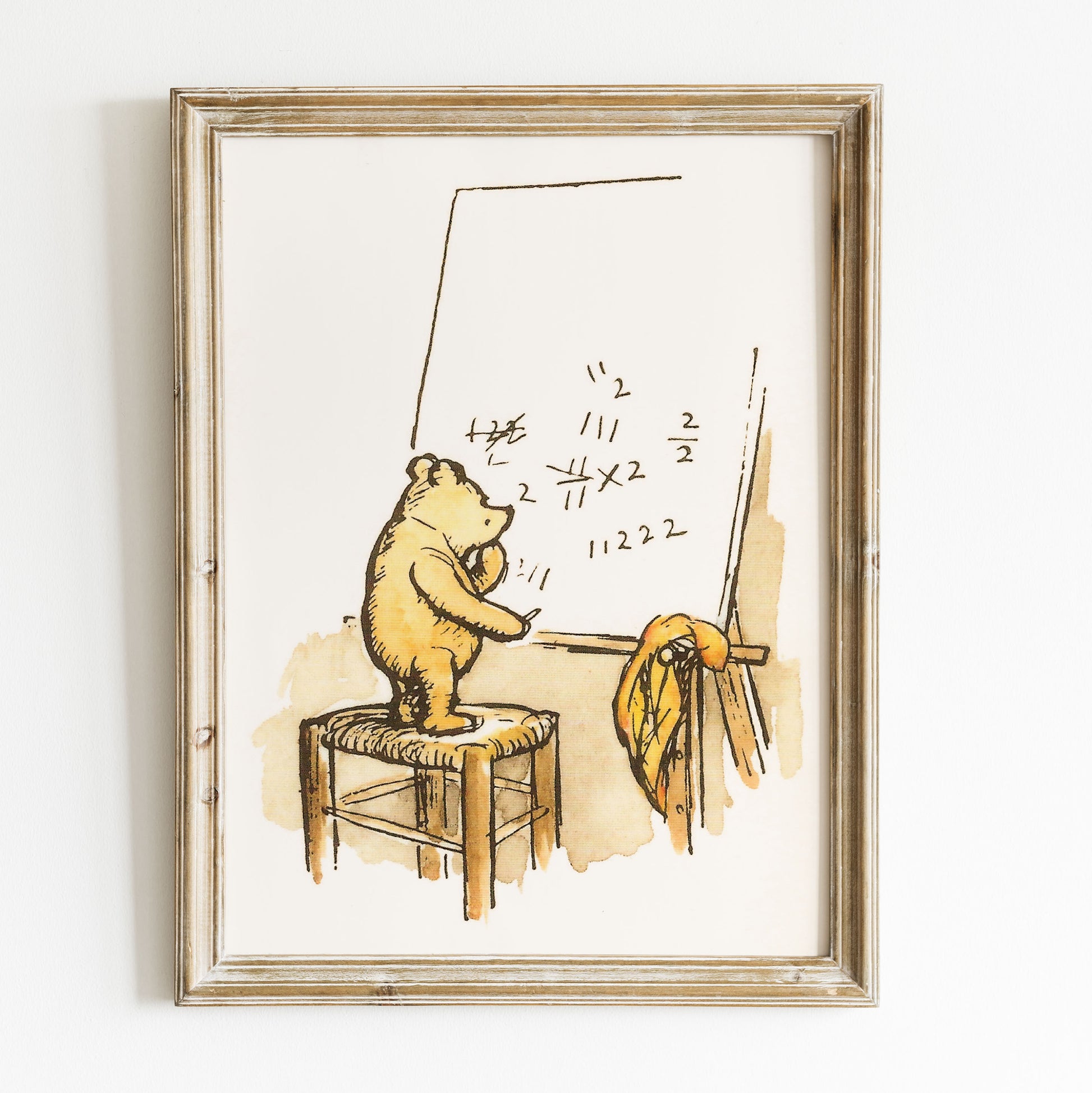Retro Nalle Puh illustration för barnrummet. Nalle Puh räknar matte.