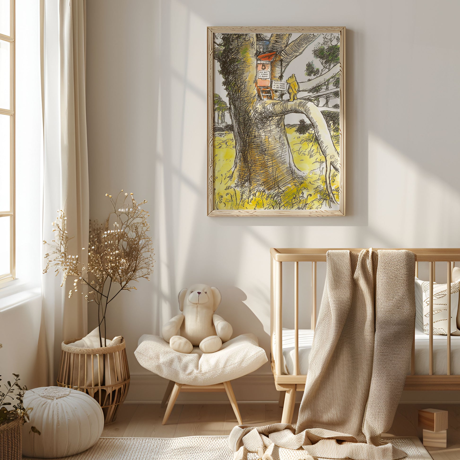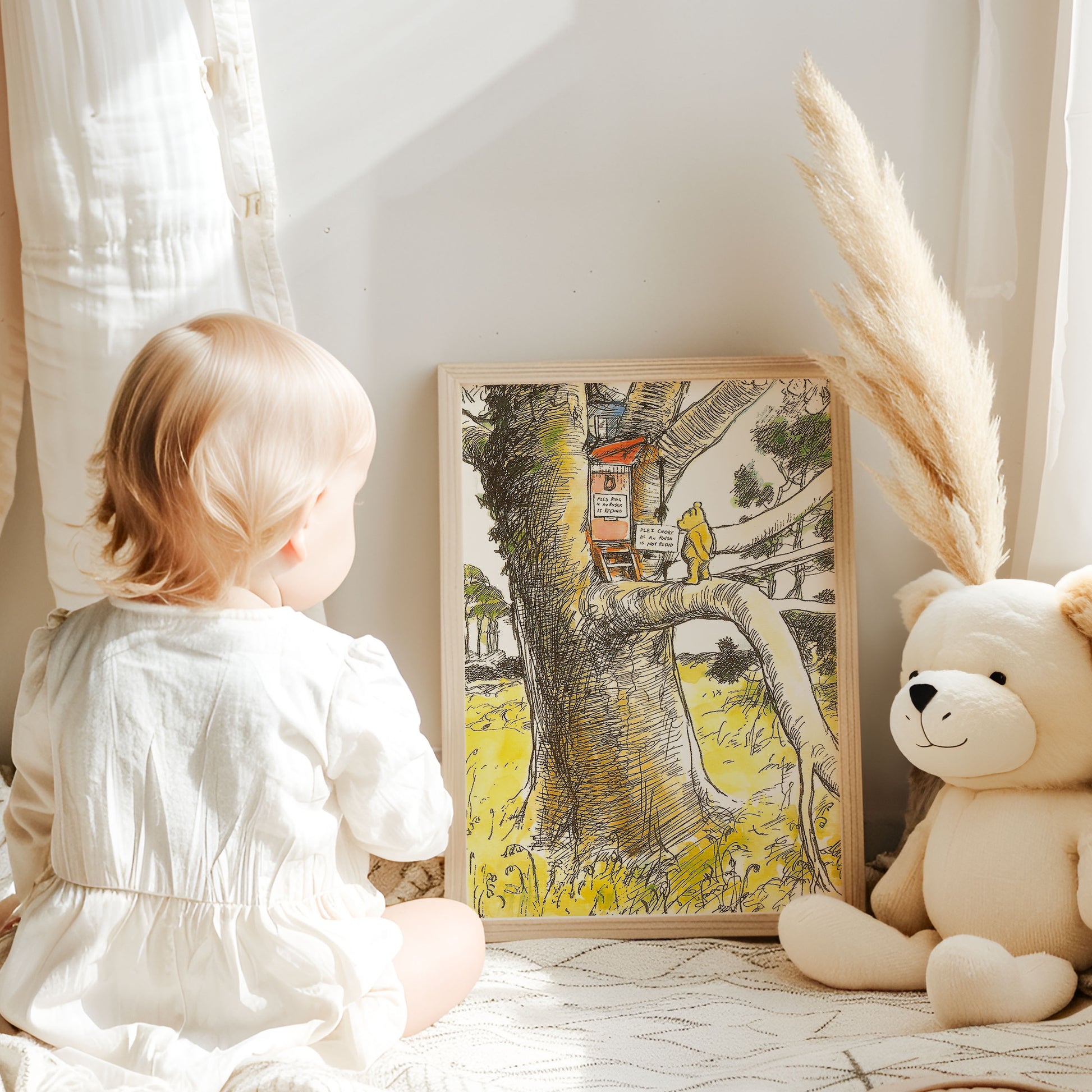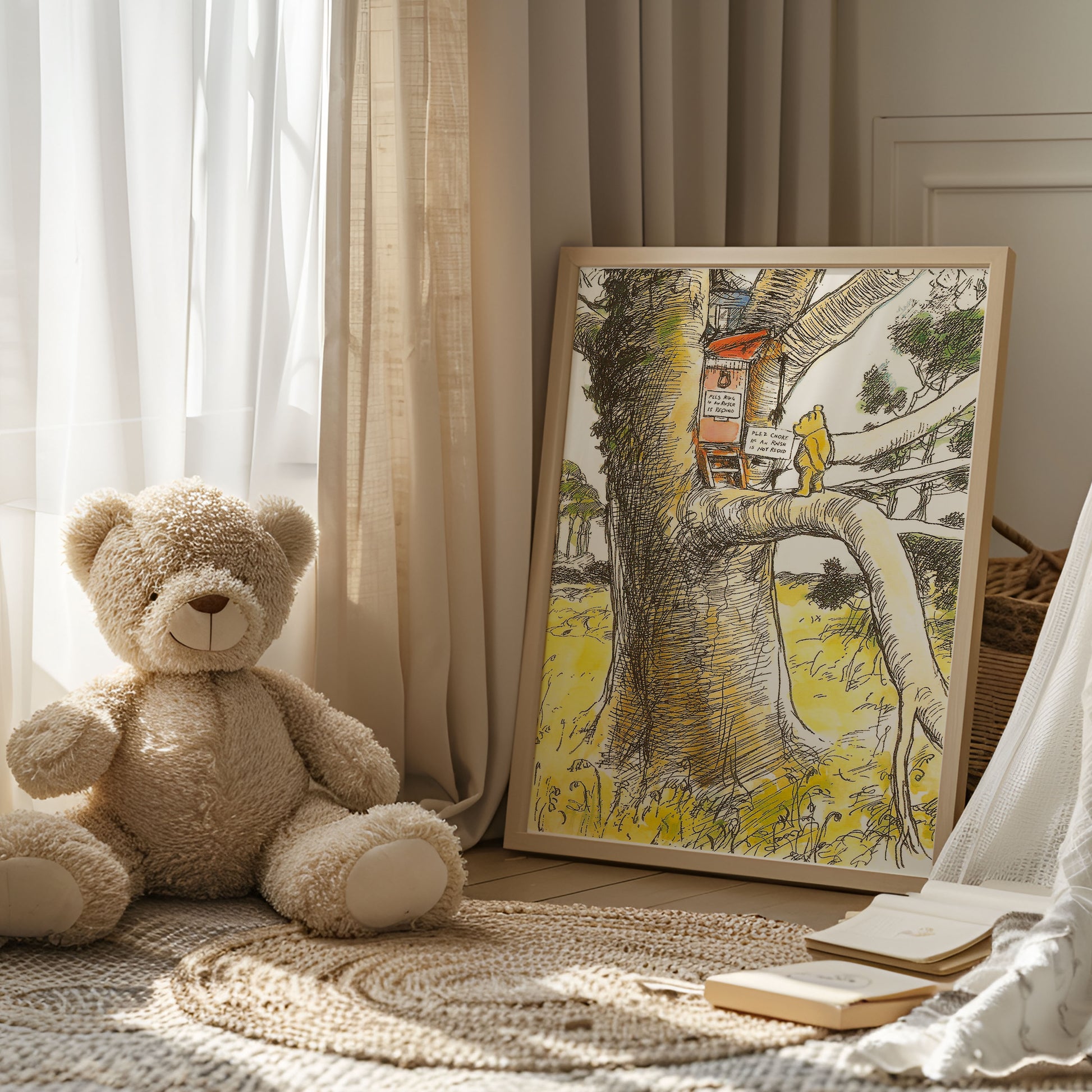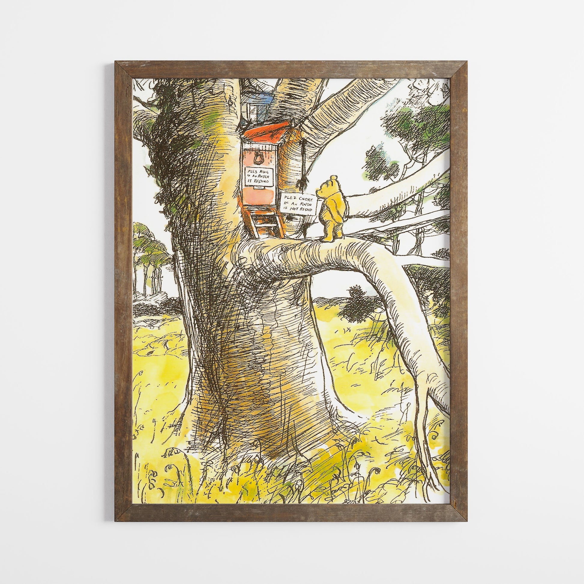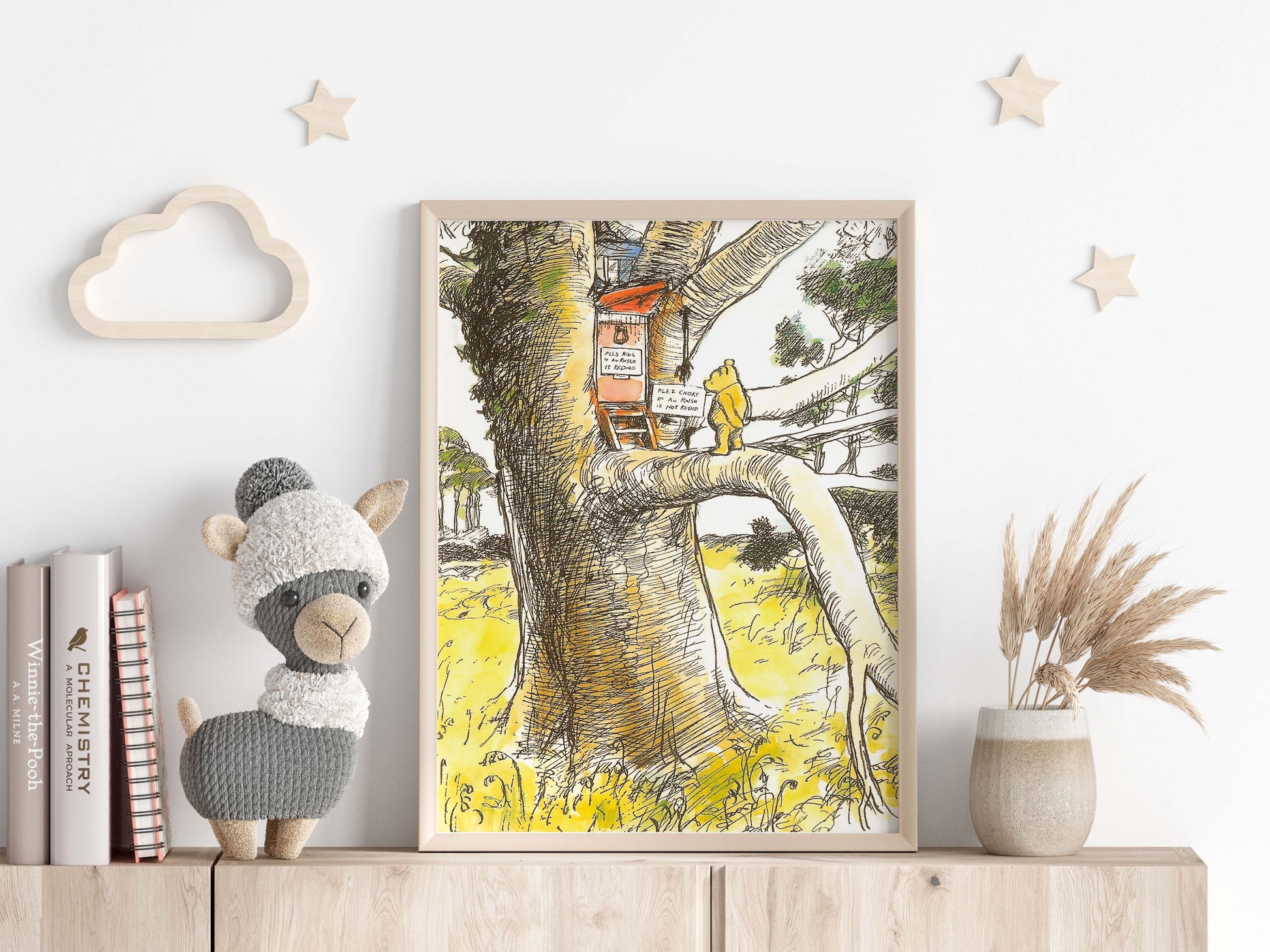 Retro Nalle Puh illustration för barnrummet. Trädkoja.