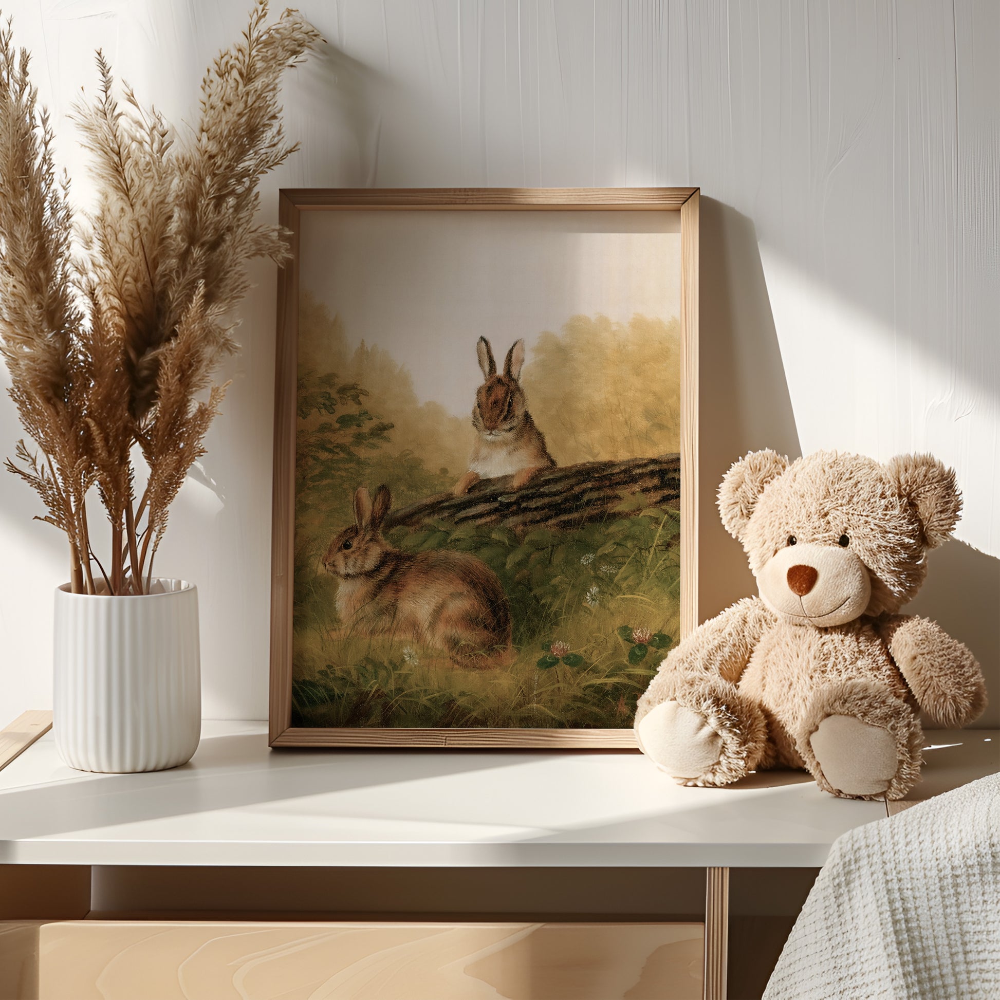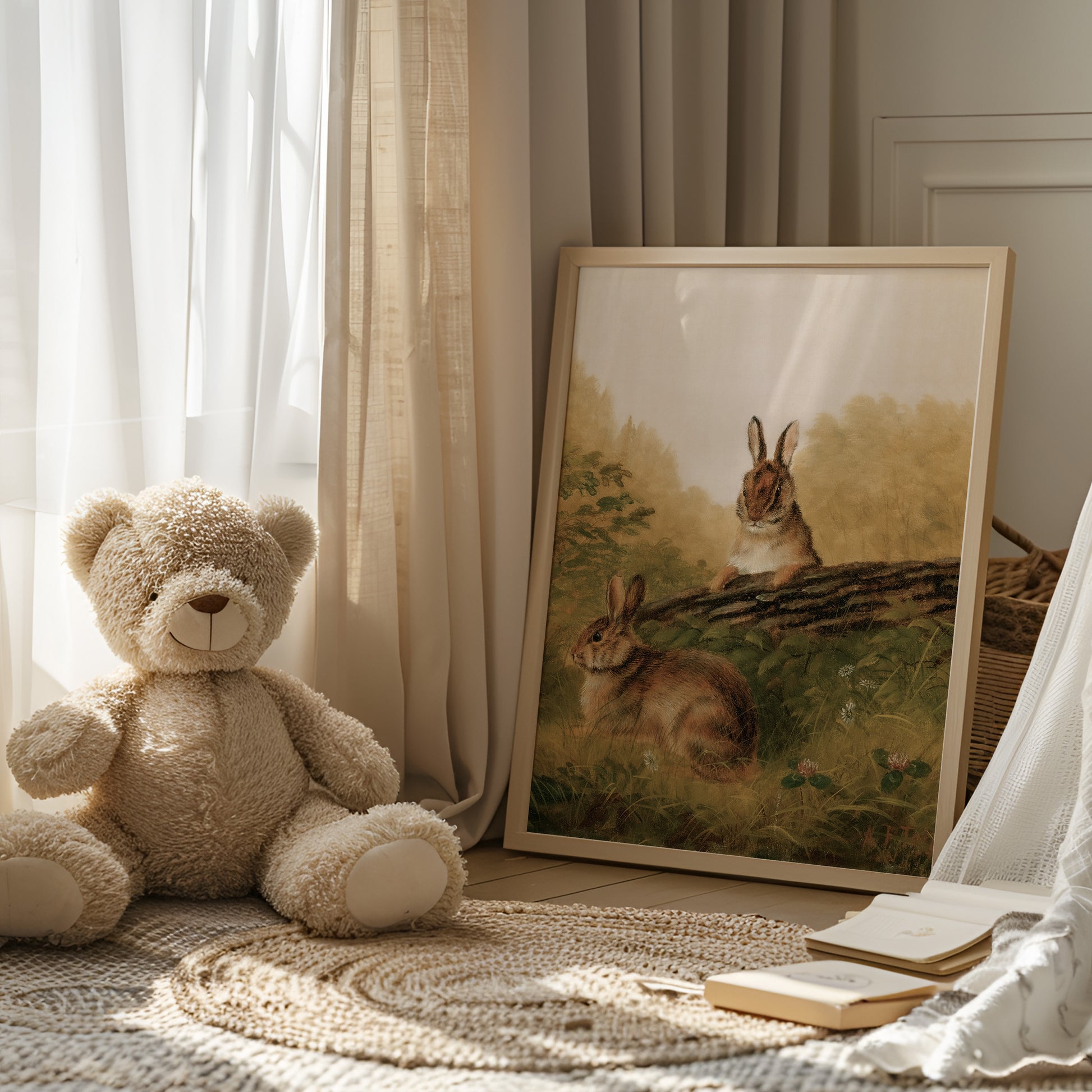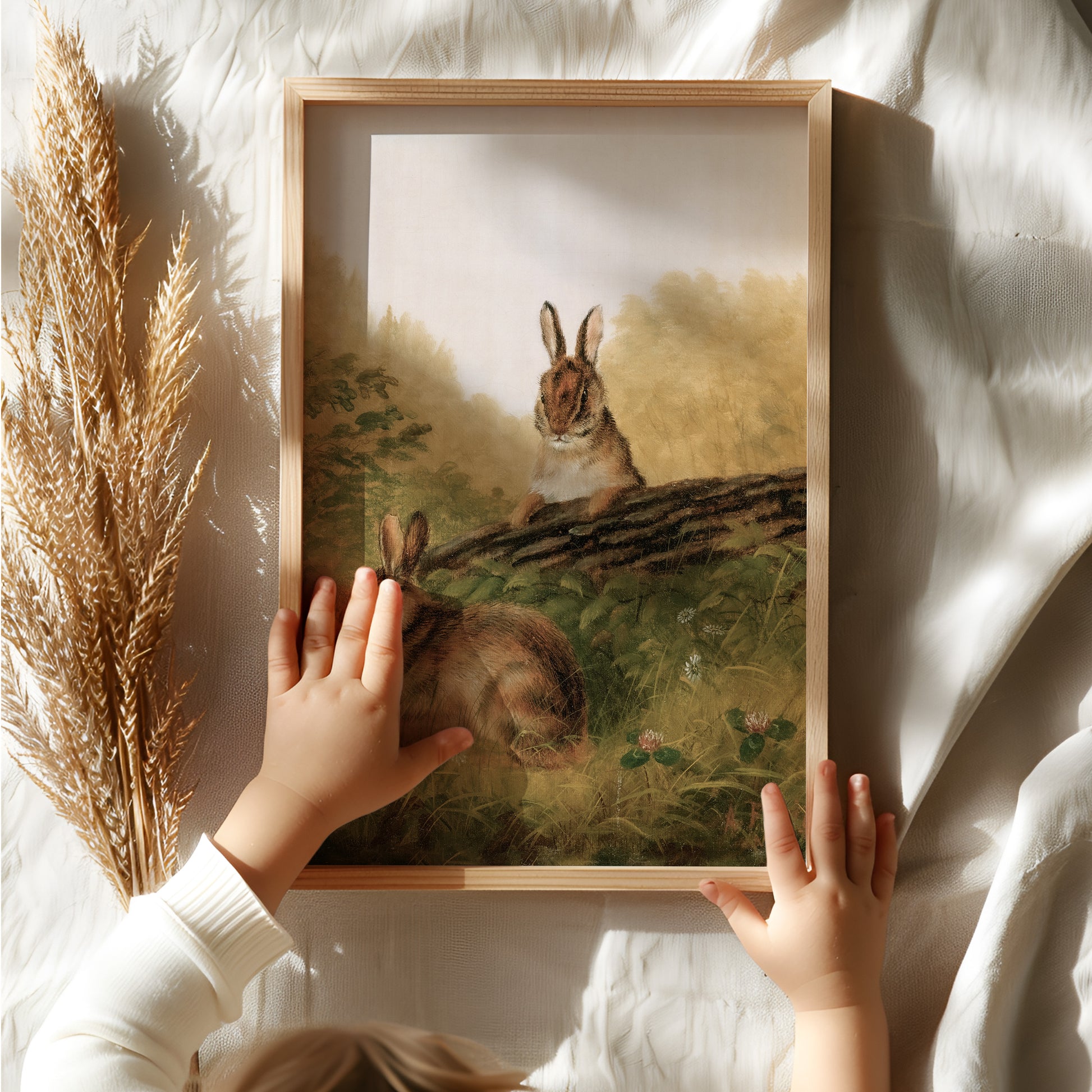 Retro oljemålning av gulliga kaniner för barnrummet.