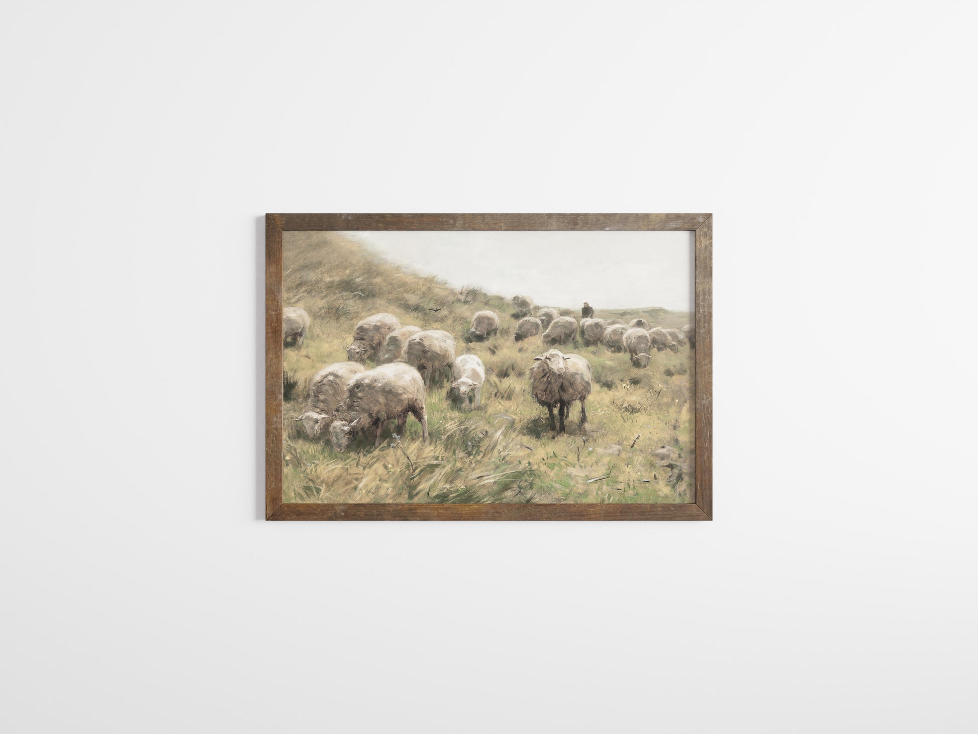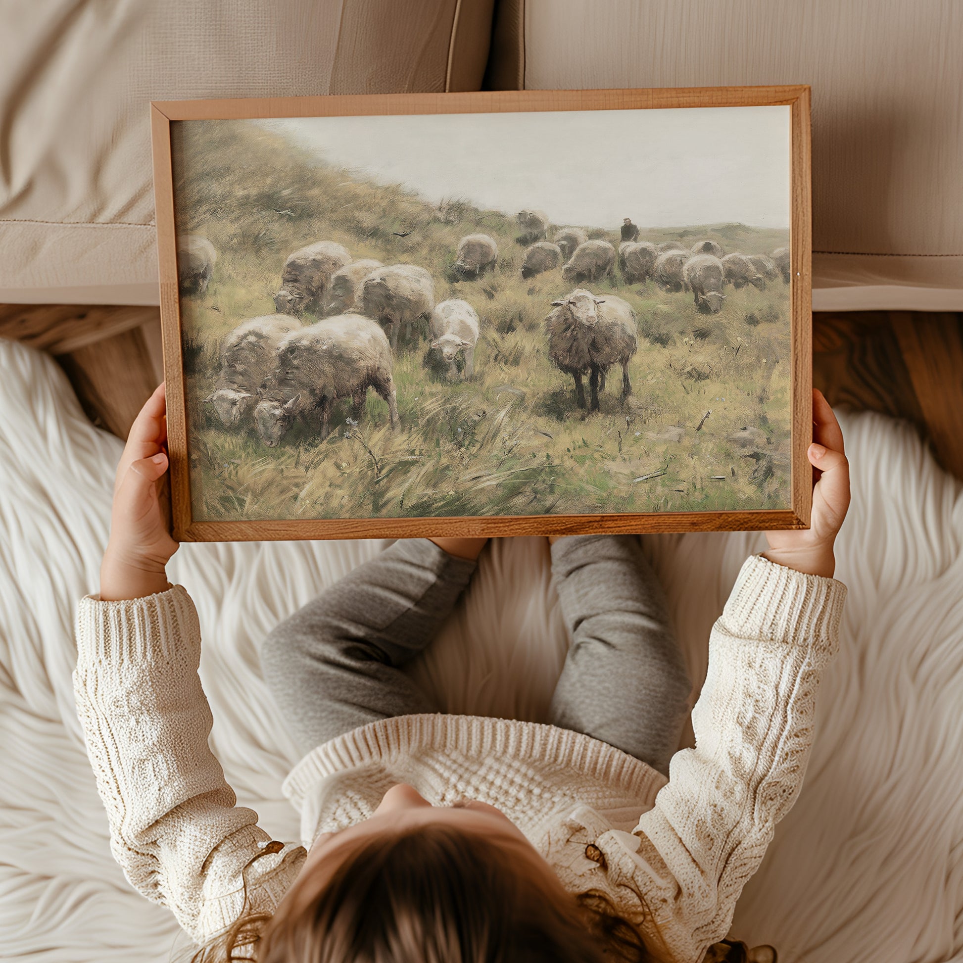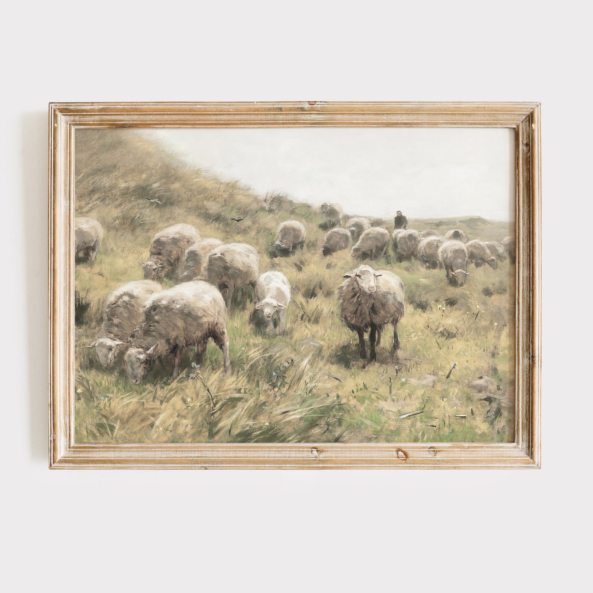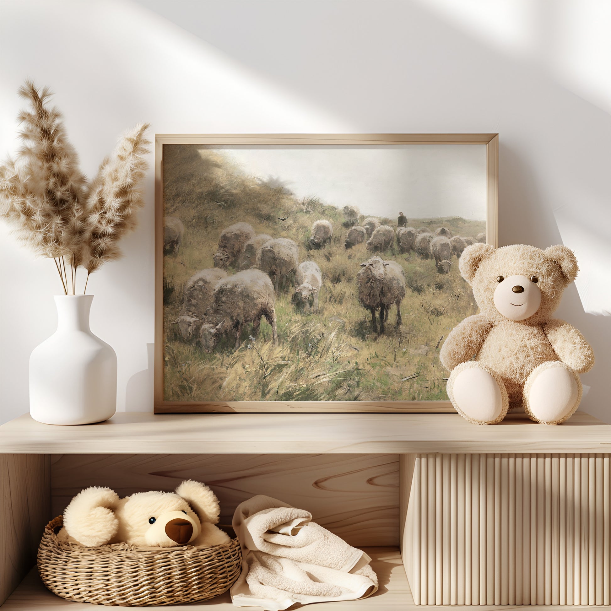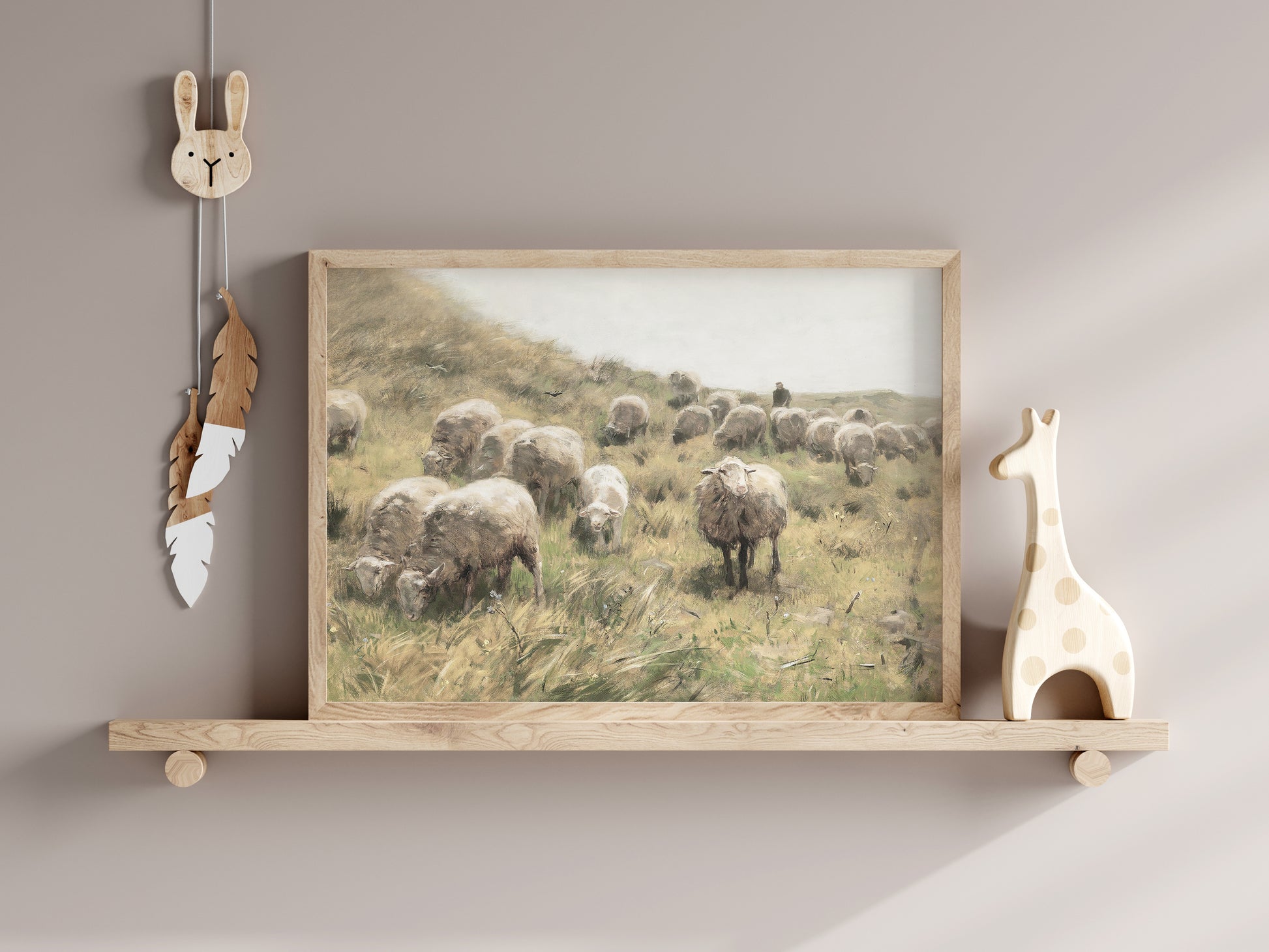 Retro oljemålning för barnrummet, får på äng.